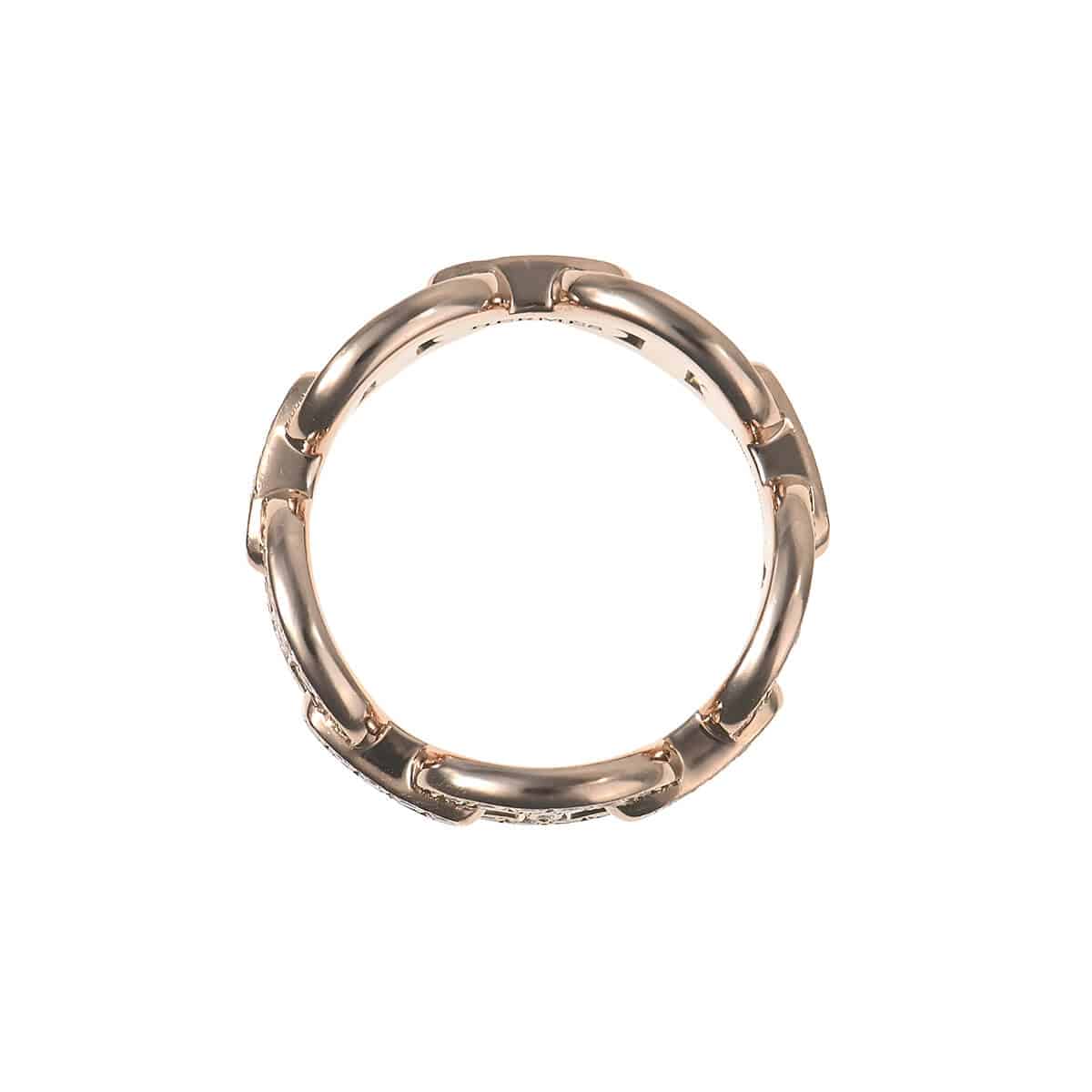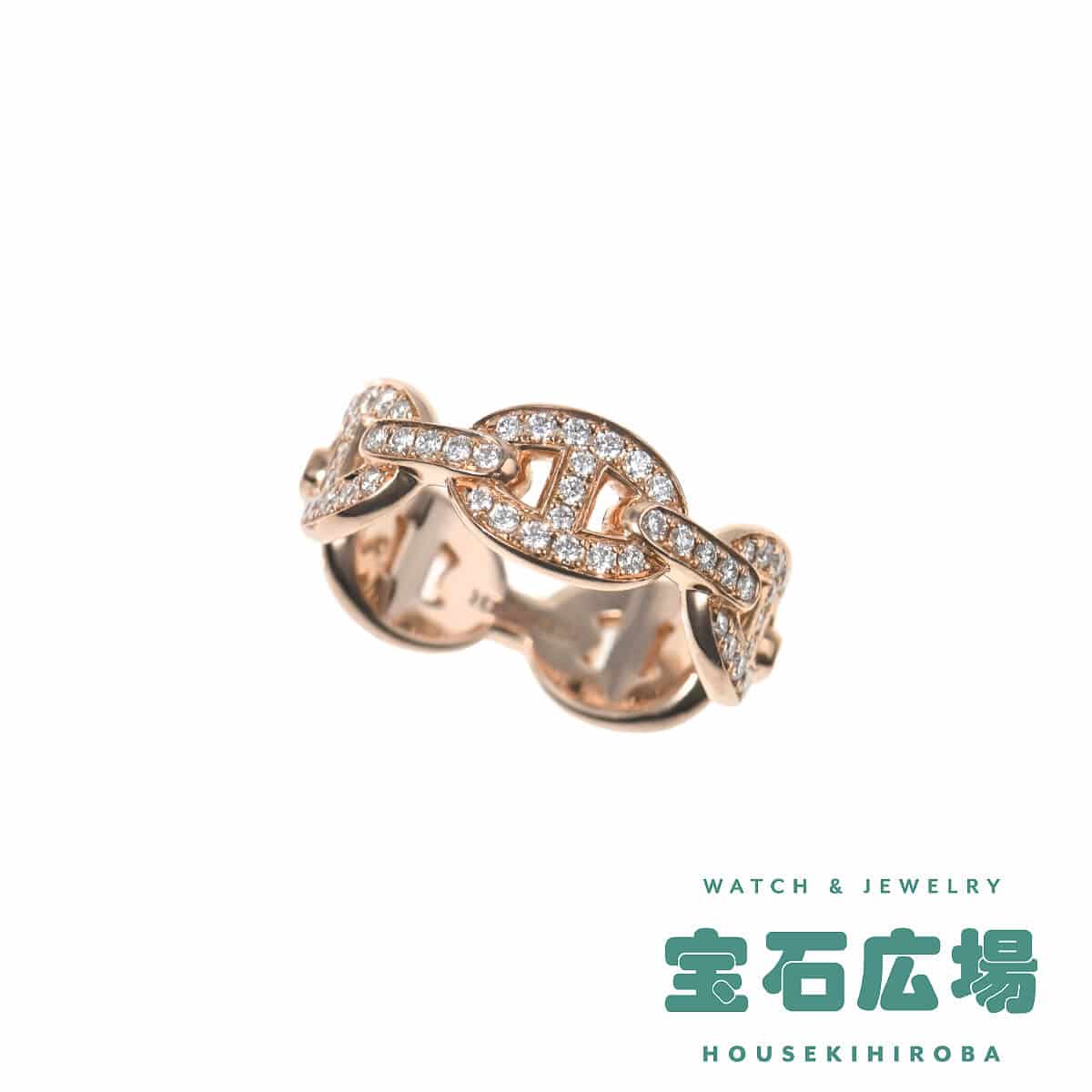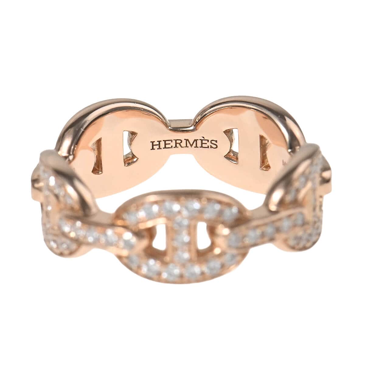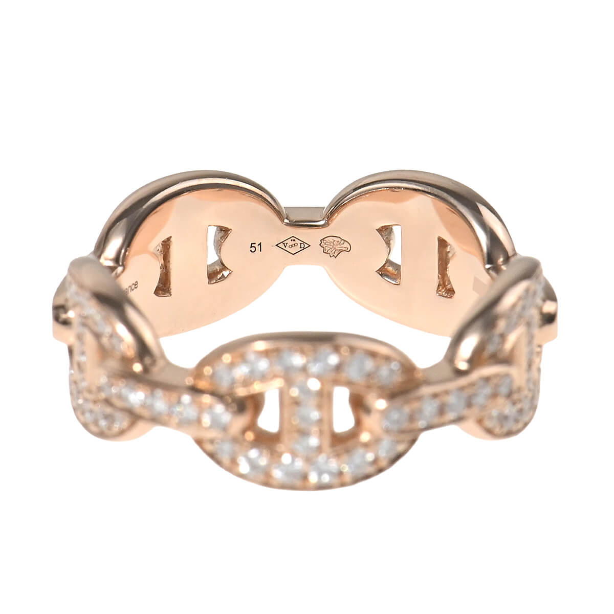 1938年にエルメス家の一員であり当時のエルメスの社長であったロベール・デュマ=エルメスが、ふと船の錨のチェーンに目を留め、そのシルエットに惹かれ、そのチェーンを元にデザインしたブレスレットを作ったことにはじまった「シェーヌ・ダンクル」コレクション。インスピレーションの源であった“錨の鎖(Chaine d’ancre)”をそのままモデル名に冠したこのコレクションは、鎖で強く結ばれた絆を象徴しているそう。最初のブレスレット誕生後も艶出しにしたり、丸い粒状にしたり、ひねったりと、コマの形や大きさを変え、ネックレスやリング、ピアス、ブレスレットとつぎつぎに新しい姿を見せ、メゾンを代表するコレクションのひとつとなった「シェーヌ・ダンクル」。1周連なる「シェーヌ・ダンクル」のオブジェ全てにダイヤモンドがあしらわれた、「シェーヌ・ダンクル・アンシェネ」のピンクゴールド製リング。美しいシェーヌ・ダンクルのオブジェが指先に寄り添って、どんなスタイリングも美しく、エレガントに飾ってくれる人気コレクションのハイジュエリーです。