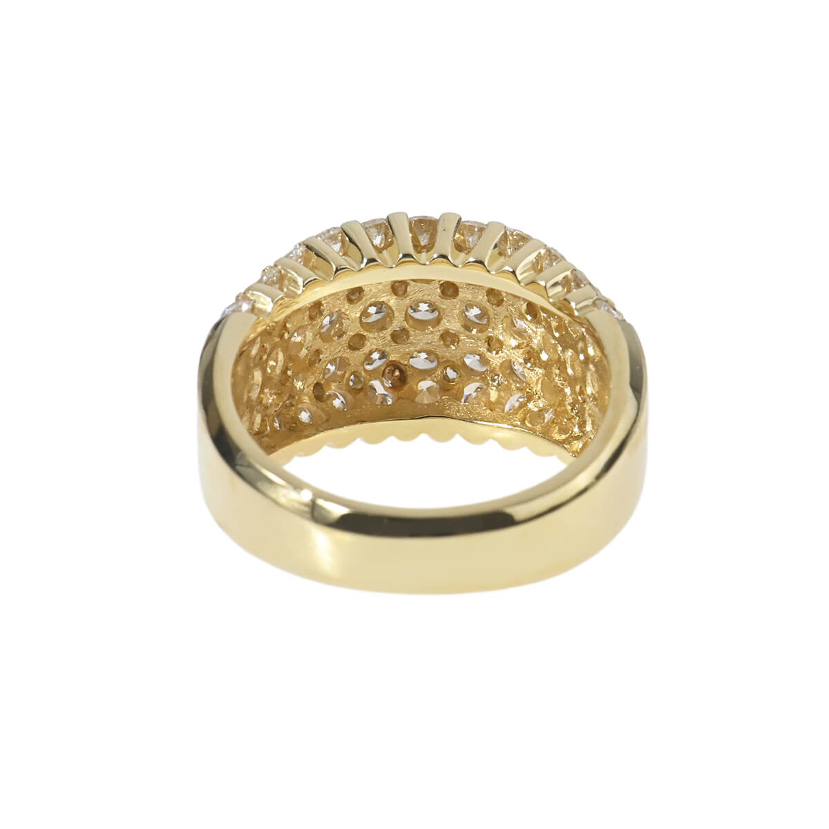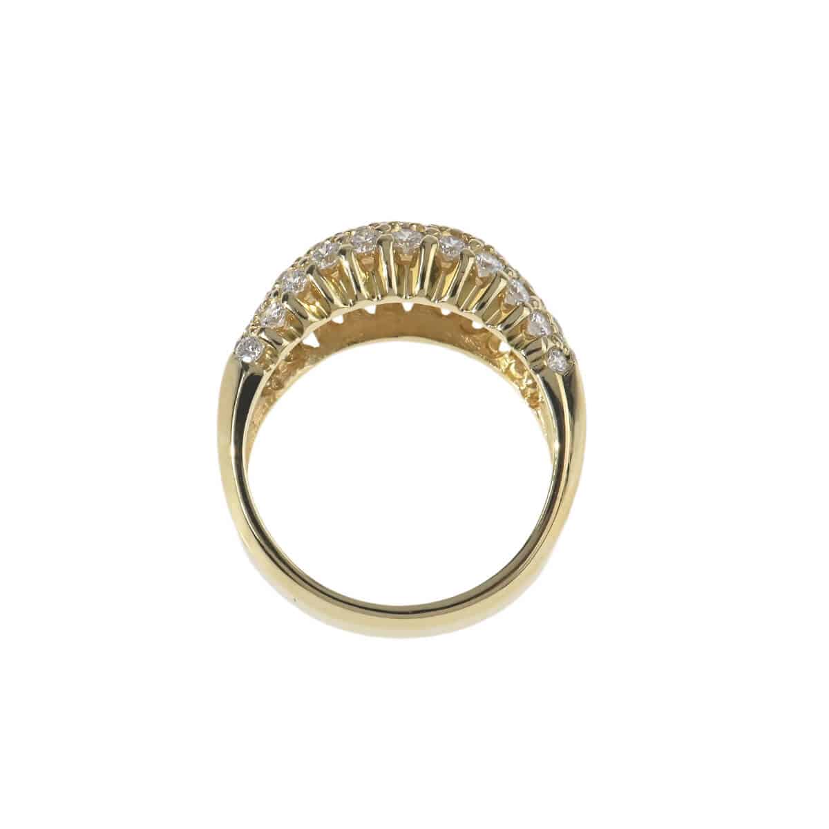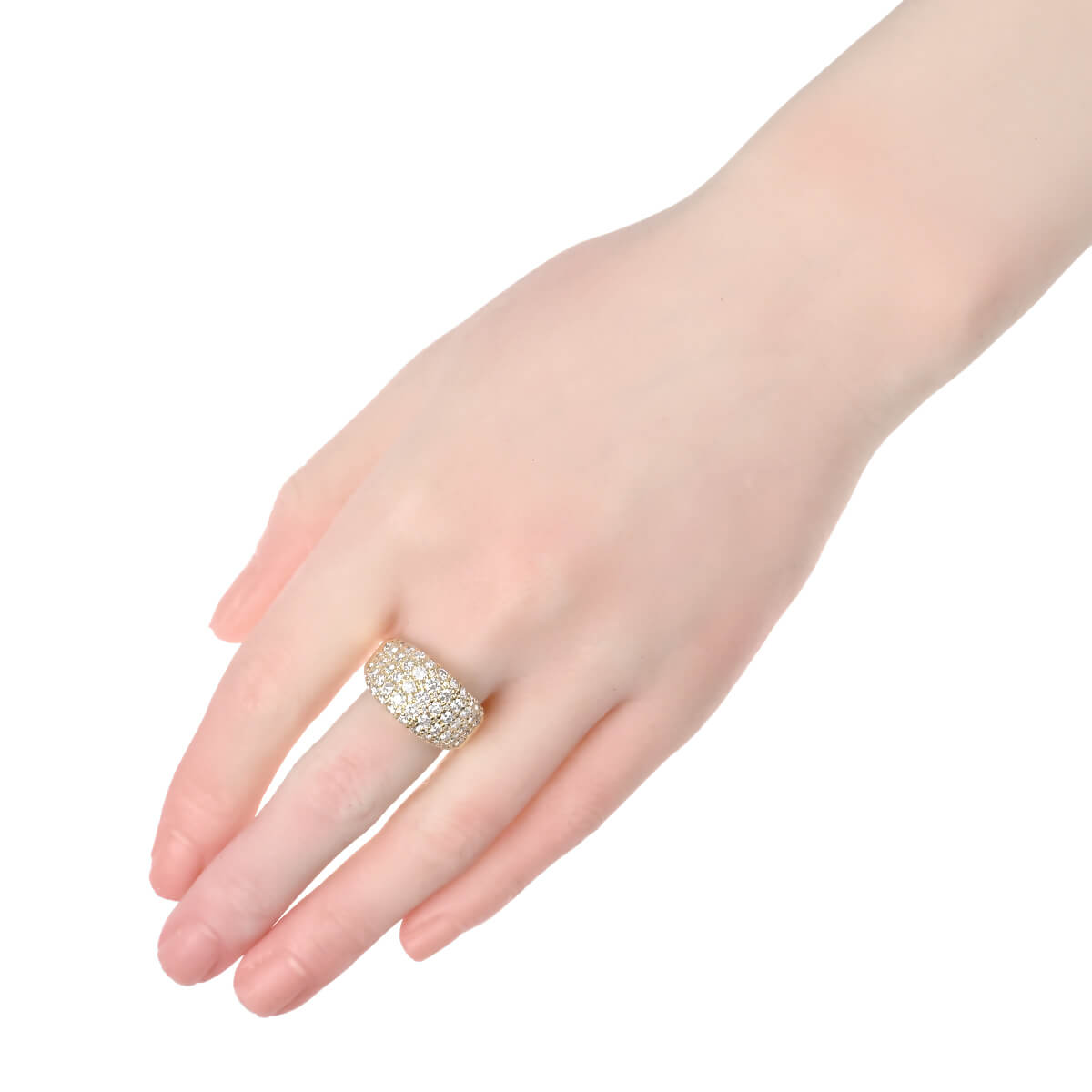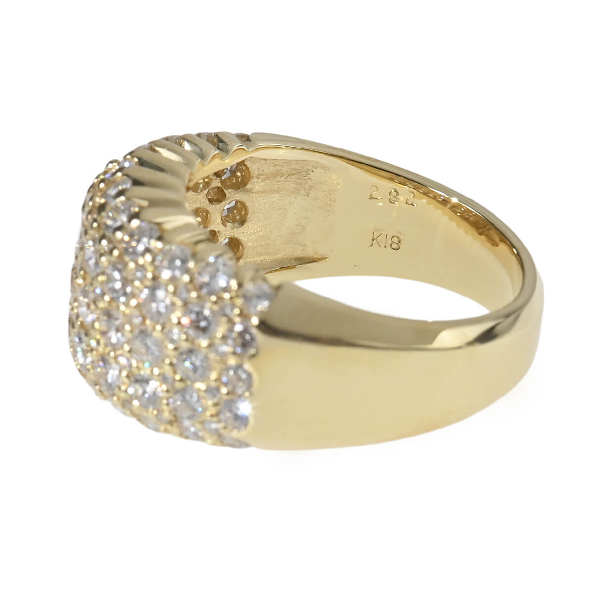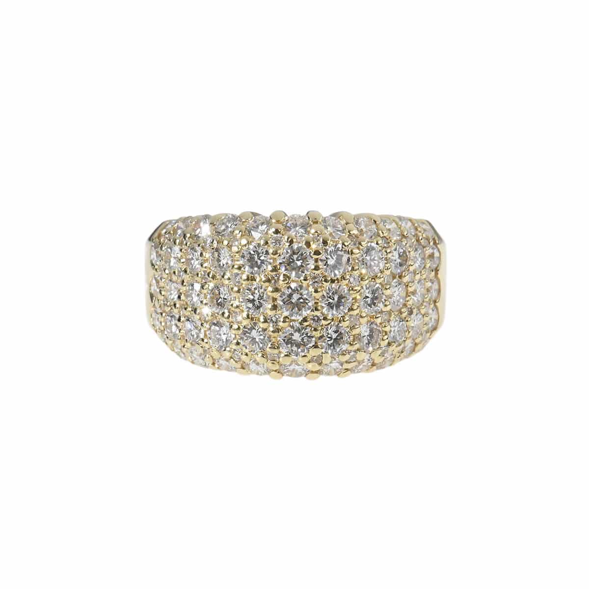 優美なフォルムのボリュームたっぷりのリングに、トータル2.82ctものダイヤモンドがパヴェセッティングされたイエローゴールド製リング。フランス語で“石畳”を意味する“パヴェ”の名の通り、ふっくらとボリュームたっぷりのリングいっぱいに大粒のダイヤモンドが惜しげもなく敷き詰められています。どの角度からも光をとらえて輝くダイヤモンドが華やかに指先を彩り、どんなシーンやスタイリングにもマッチして日常に本物の輝きを添えてくれる、美しく上質なダイヤモンドジュエリーです。