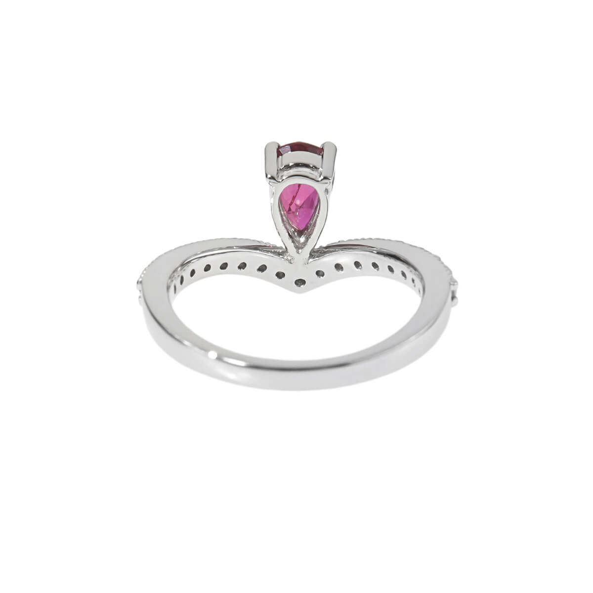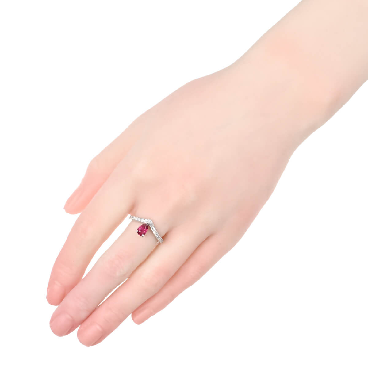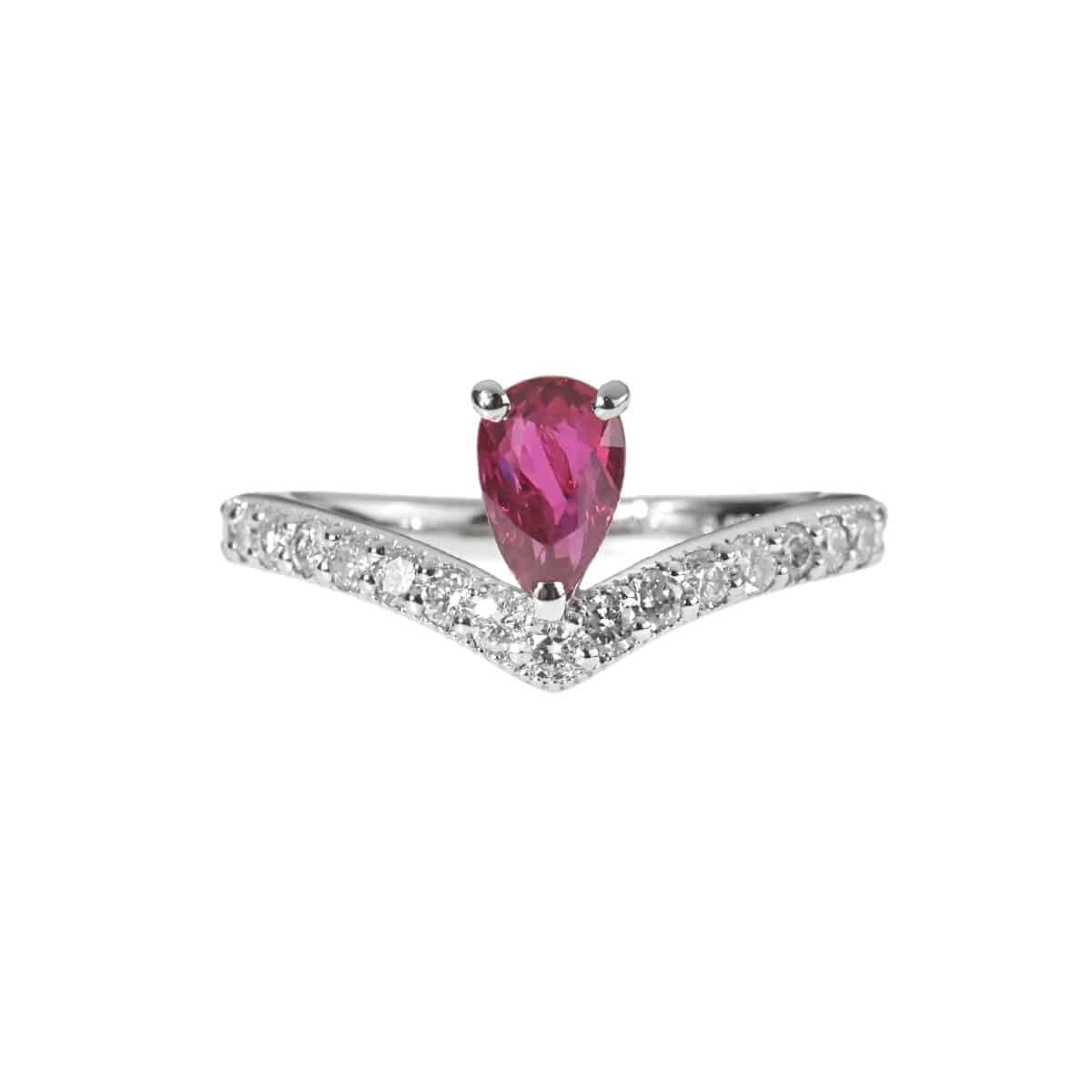 サンスクリット語で“宝石の王”を意味する「RATNARAJ(ラトナラジュ)」に由来し、“赤”を意味するラテン語の「RUBEUS(ルベウス)」から名付けられた宝石「ルビー」。歴史的にも最も重要なカラーストーンのひとつでもあるこの宝石の赤色は、不滅の炎と信じられ、情熱や深い愛情と結びつくと考えられてきました。Vを描いたダイヤモンドラインのセンターに、深紅に煌めくルビーをあしらったプラチナ製リング。ティアラのようなデザインが、指先でエレガントな個性を放ちます。どんなスタイリングでのコーディネートを楽しめそうな、手に取りやすい価格も魅力のさりげなくも美しい彩りが印象的なカラーストーンジュエリーです。