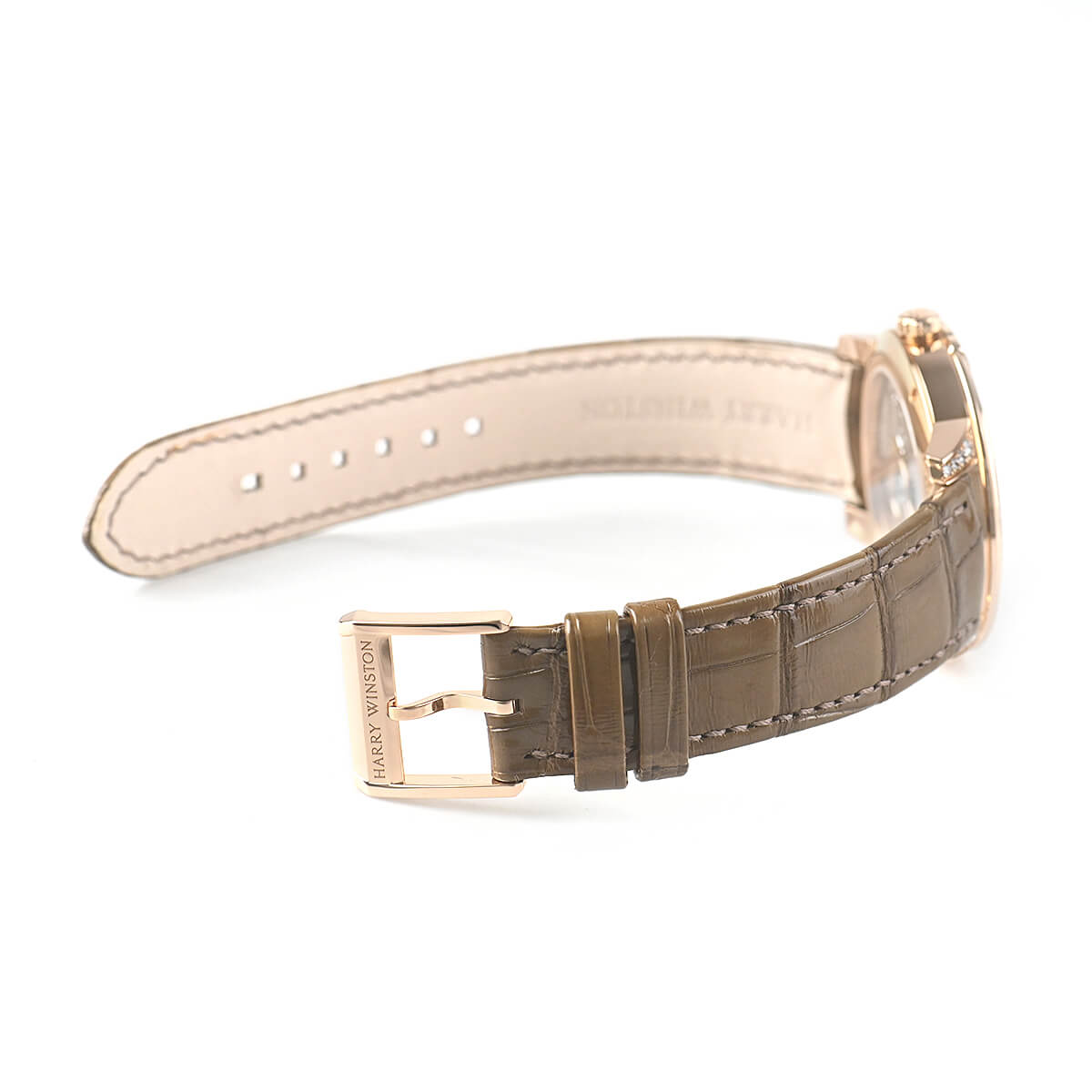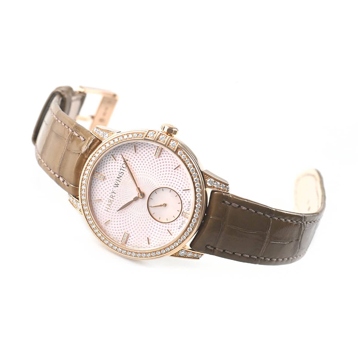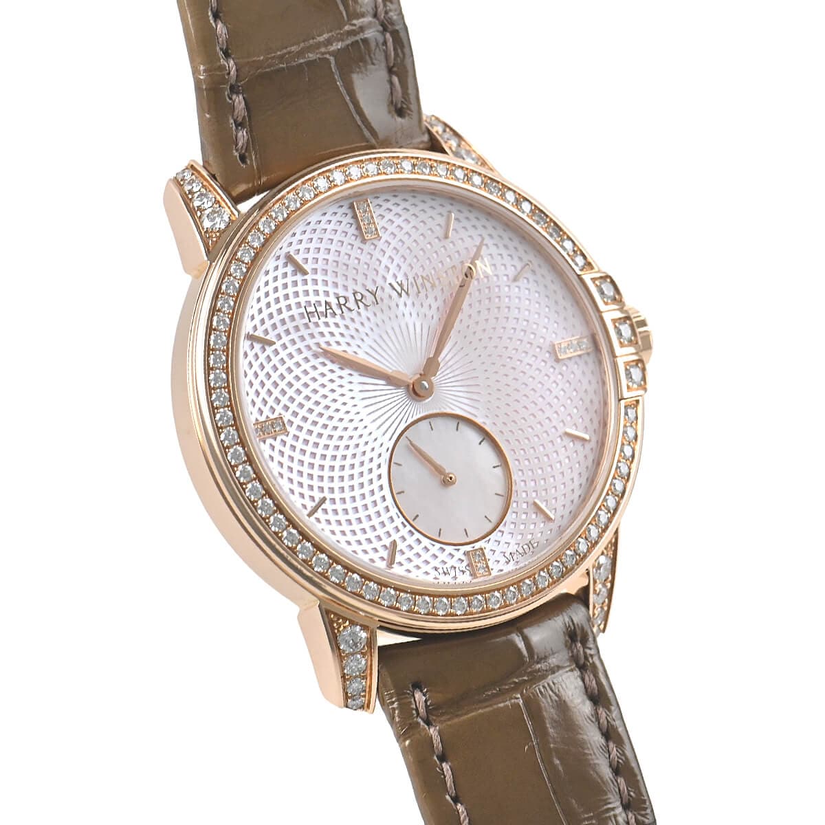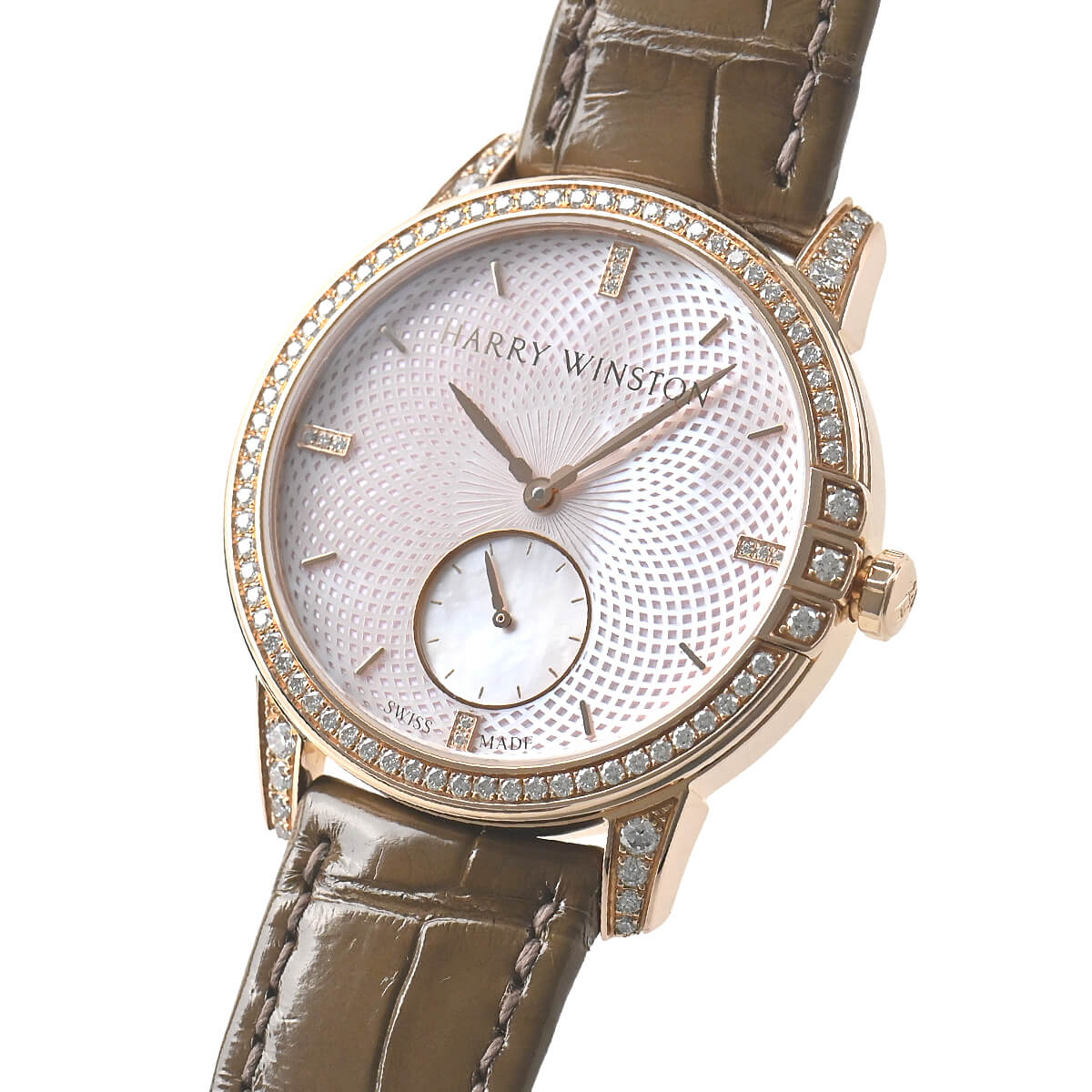 36mm径のローズゴールド製ケースにはダイヤモンドをセッティングすることにより、華やかな印象を演出しています。