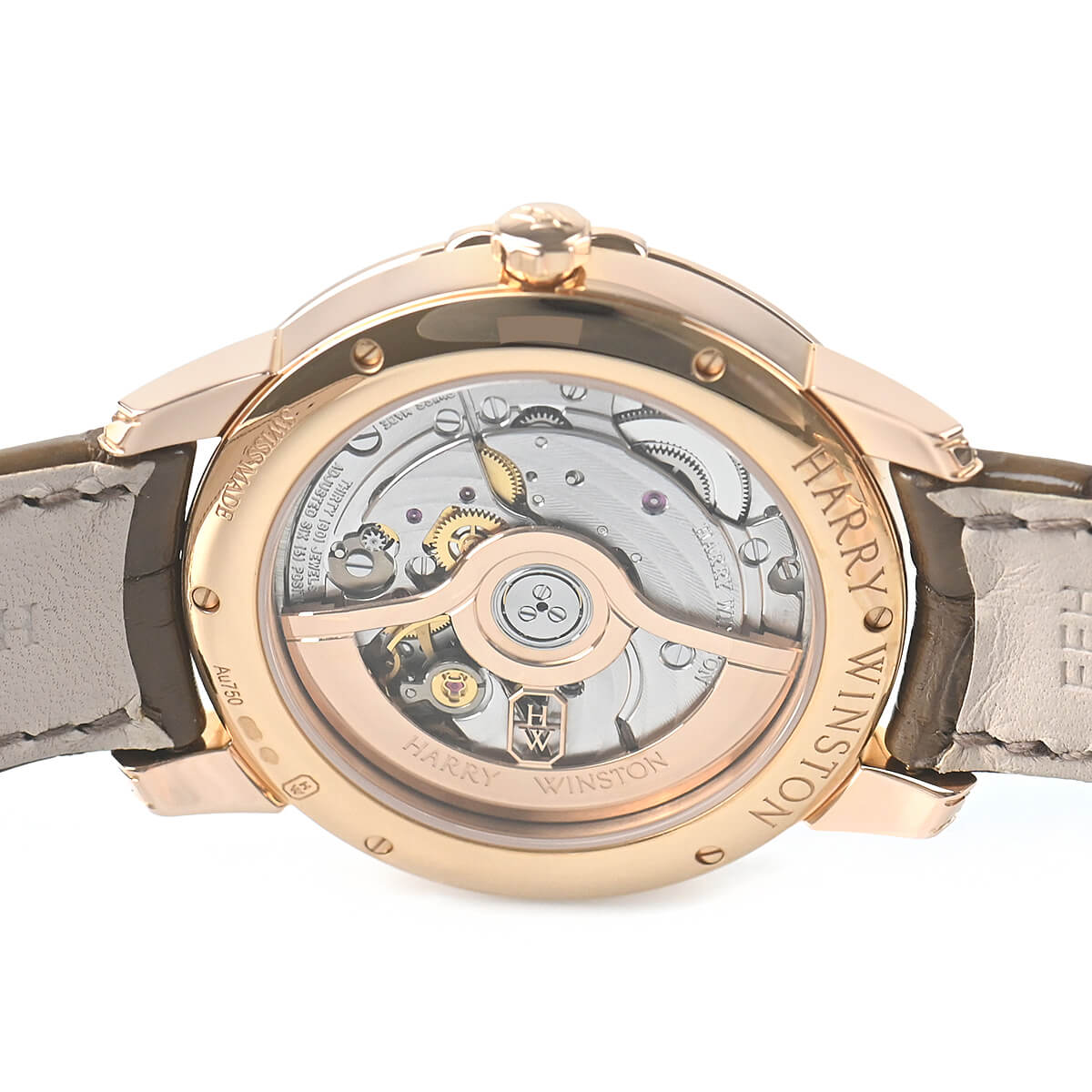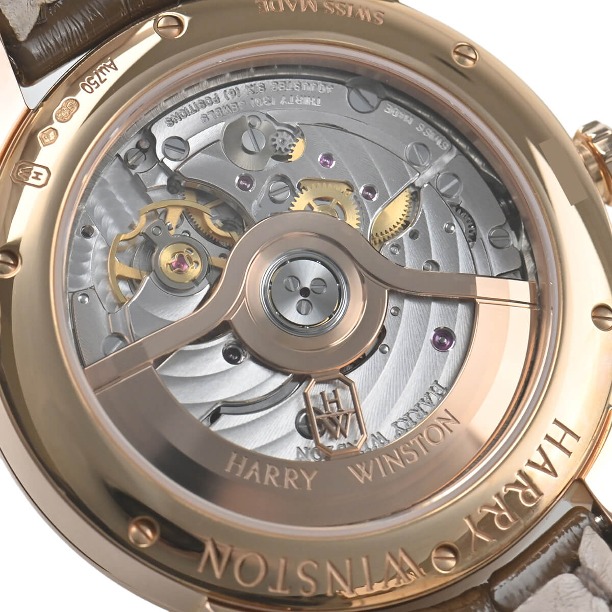 デイリーユースのウォッチとしてデザインされ、控え目ながら、ハリー・ウィンストンならではのエレガンスを感じさせる「ミッドナイト」。ベゼルの3時位置にアイコンであるアーチをデザインしたラウンドケースを採用。