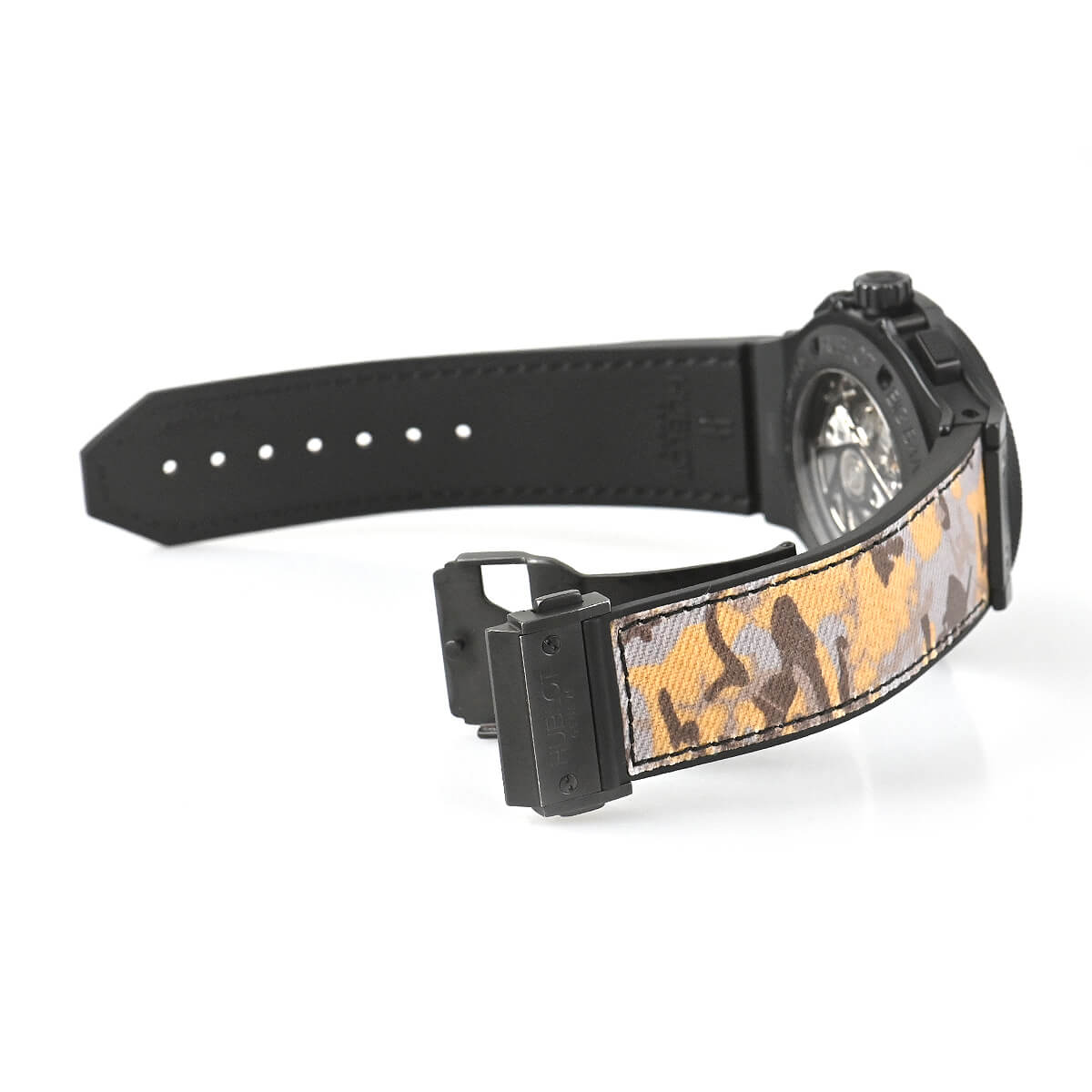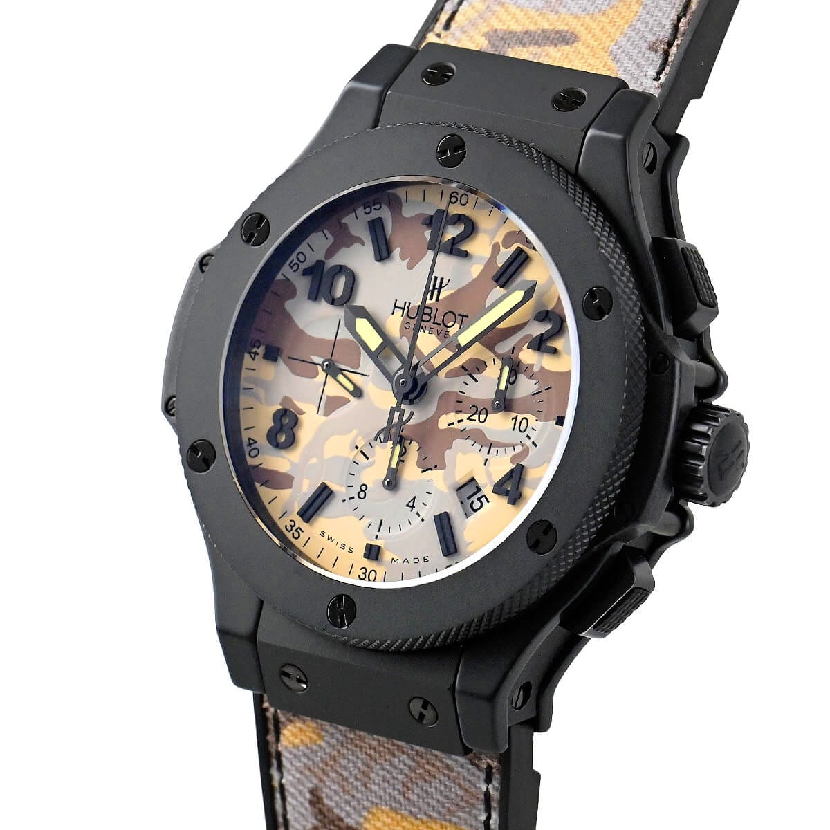 個性的なデザインの時計を発表しているウブロですが、こちらはその名の通りデザート(砂漠)を連想させる迷彩柄の文字盤とベルトが強烈な印象のモデルです。ベルトの表地は「Nomex」という高機能繊維を使用。