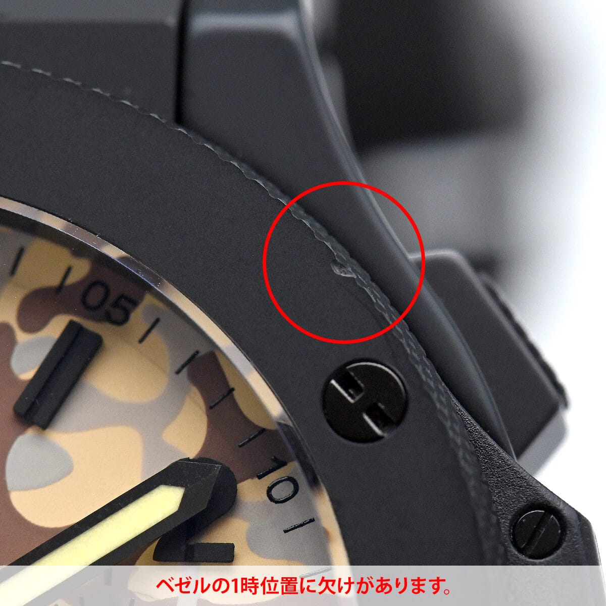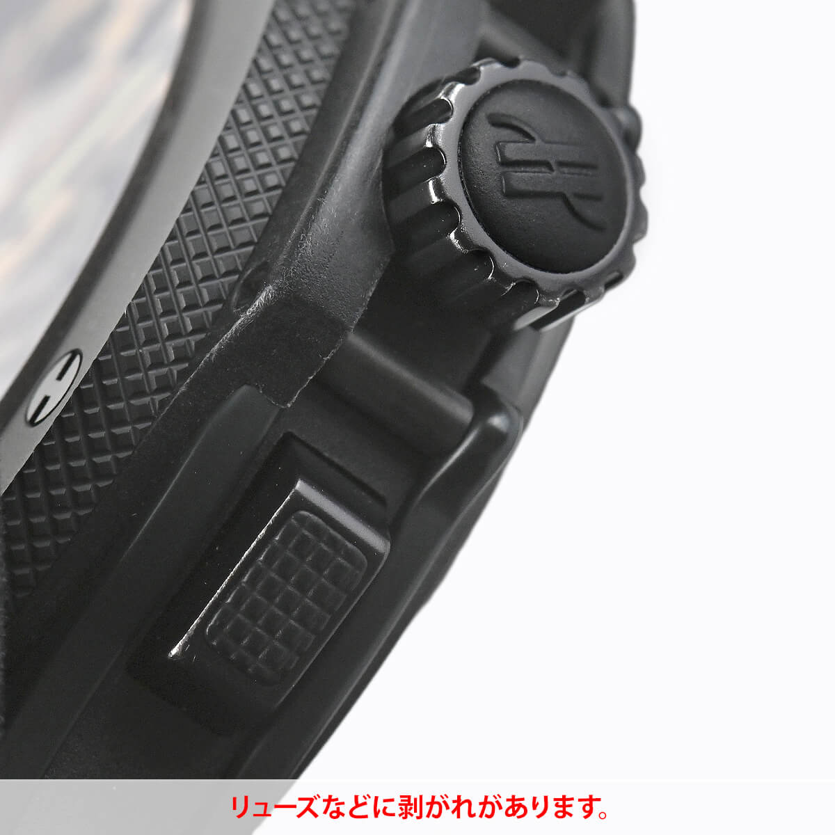 当店にてオーバーホールと外装の仕上げ・洗浄を行いましたが、ベゼルの1時位置にキズやリューズに剥がれが見られます。