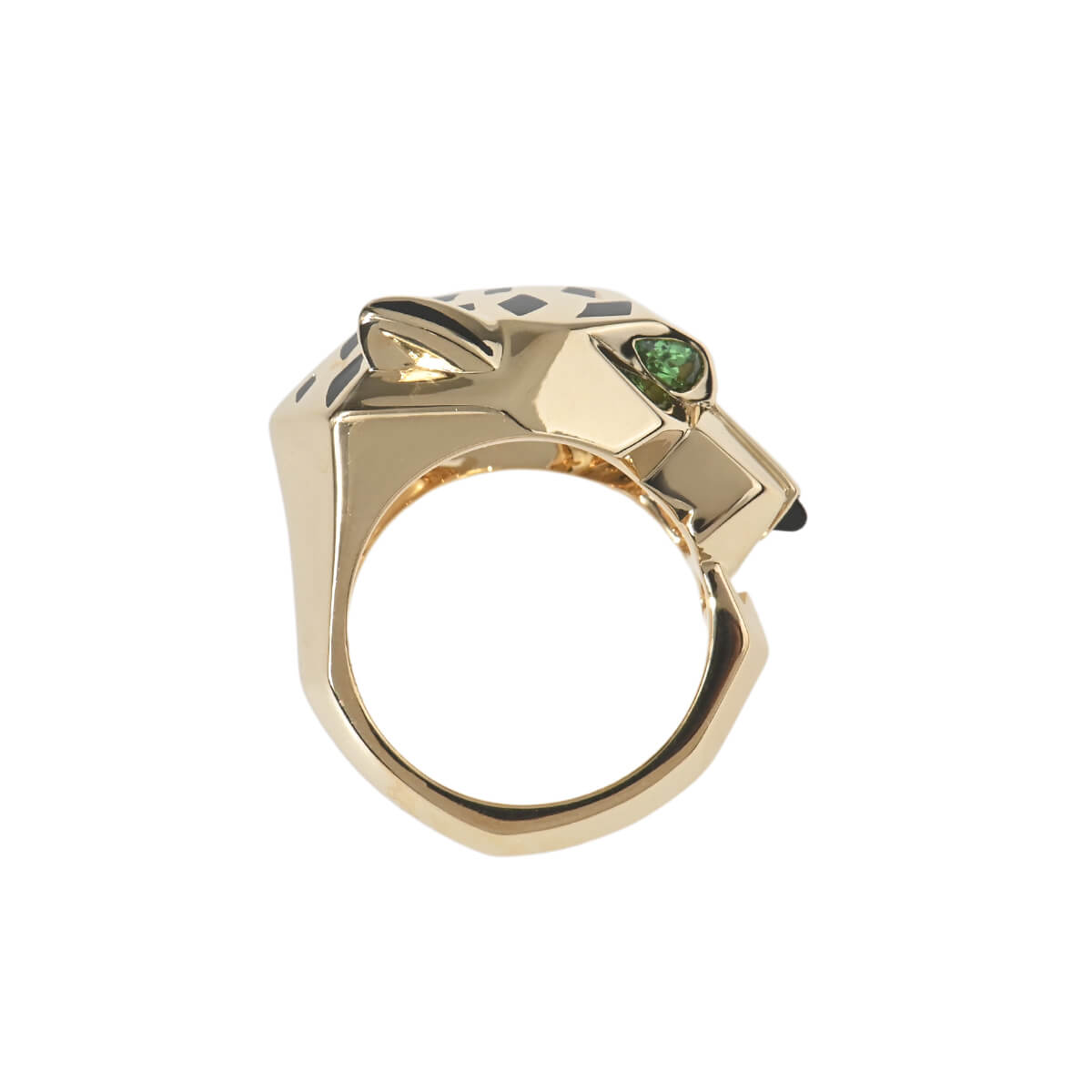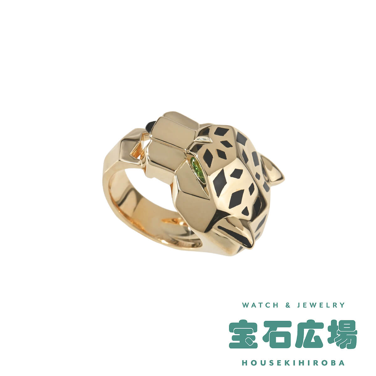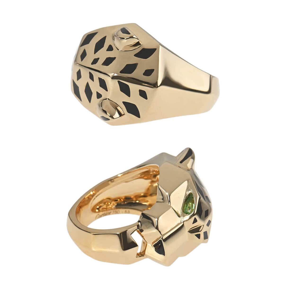 『Cartier(カルティエ)』のアイコン「パンテール」は、1914年にルイ・カルティエがこのネコ科の動物をカルティエ流にアレンジしたのが始まり。それをオート・ジョワイユ(特注宝石製作)界に君臨し、その世界に大きな影響を与えたジャンヌ・トゥーサンが引き継ぎ、この伝説の動物を壮麗なモチーフに仕上げ、メゾンの美学を体現していきました。以来ずっとパンテールは、獲物を捕らえたり、茶目っ気を見せたり、物憂げな様子だったりと、コレクションの変遷に合わせてその野性味あふれる多様な個性をあらわにしています。鼻にはオニキス、目にはグリーンが際立つツァボライトをあしらった“パンサー(豹)”がデザインされた、イエローゴールド製リング。ブラックラッカーで表現された斑点が際立つ、ゴールドで形づくられた美しく凛々しいフォルムのパンサーが、指にぴったりと寄り添います。まさにカルティエの芸術性を具現化している、ひとめ見てカルティエとわかる美しいハイジュエリーです。
