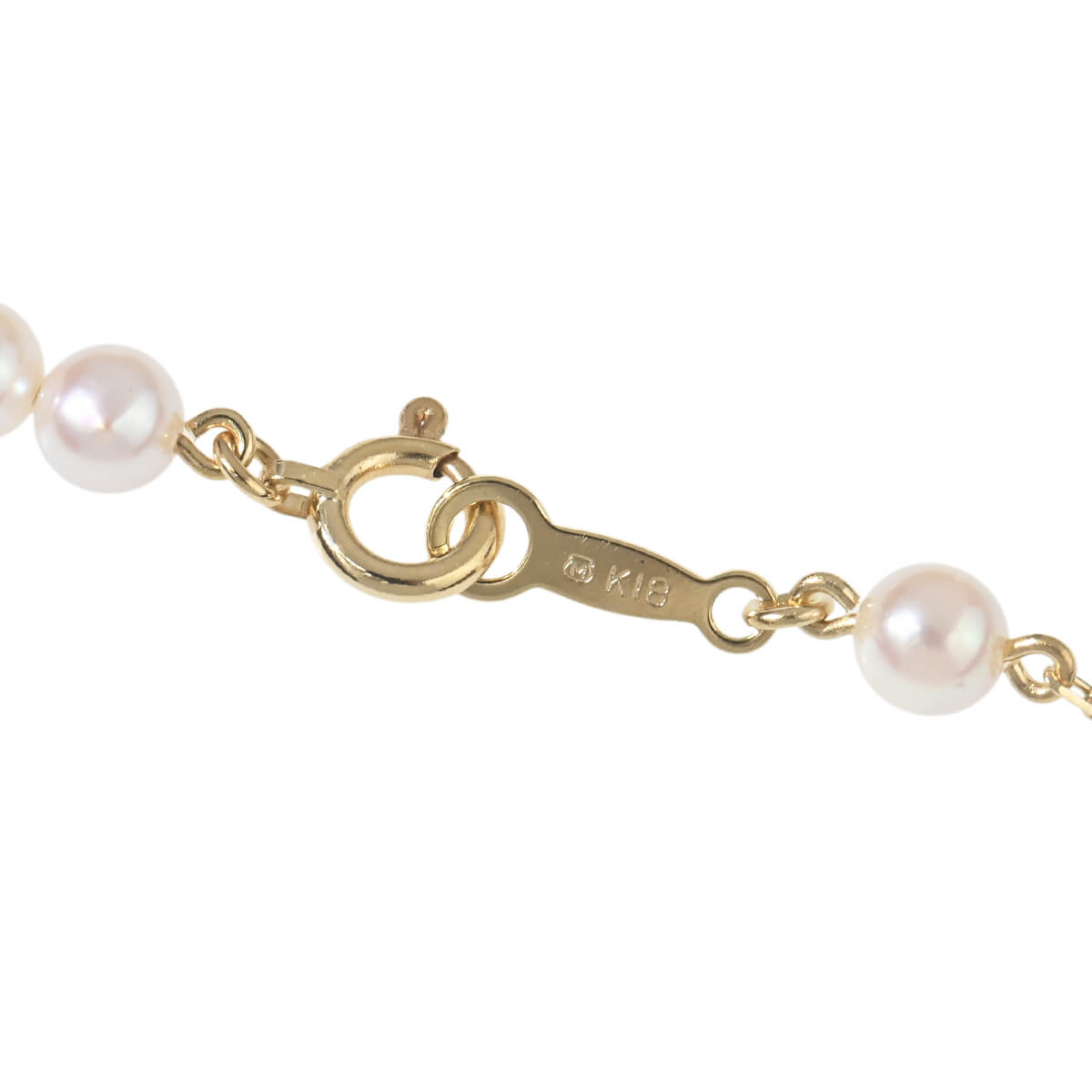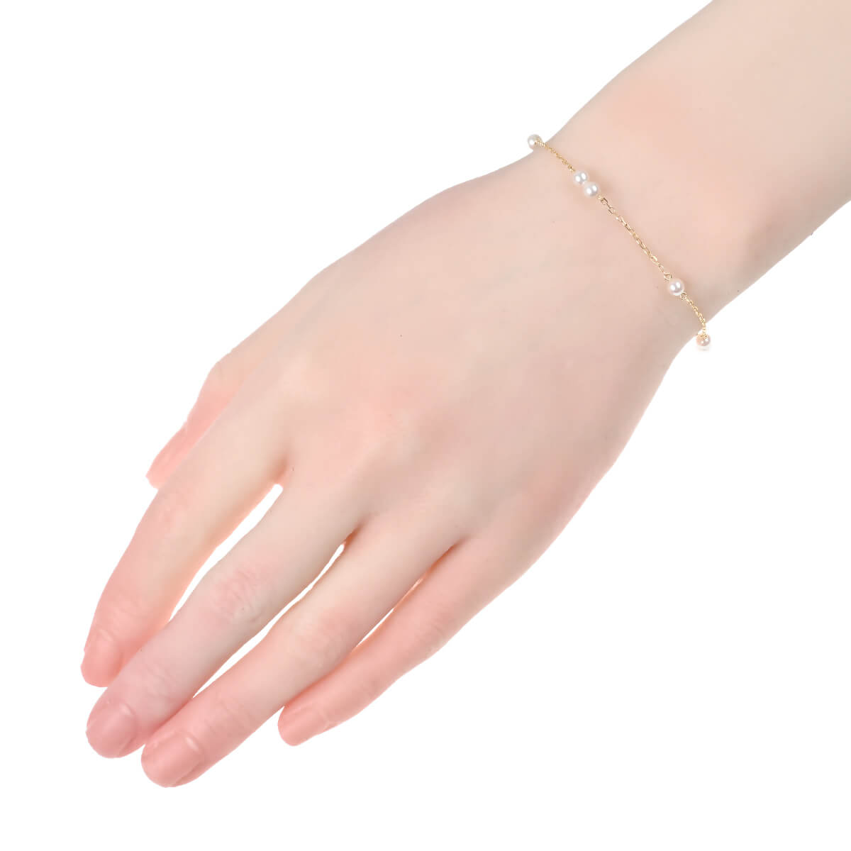 1893年に世界で初めて真珠の養殖に成功し、真珠に生涯を捧げ、「Pearl King(真珠王)」とまで呼ばれ歴史にその名を刻んだ「御木本幸吉」が、“世界中の女性を真珠で飾りたい”と夢を抱いて創業した『MIKIMOTO(ミキモト)』。以来、養殖真珠のオリジネーターとして120年以上も真珠の魅力と向き合い、“真珠と言えばMIKIMOTO”と言われるほどに誰もが知る、日本を代表する世界のジュエラーとなりました。小さいながらも優しく柔らかな光を放つ9粒の愛らしいベビーパールが繊細なチェーンにステーションセッティングされた、イエローゴールド製ブレスレットです。動くたびリズミカルにパールが揺れるブレスレットは、手元を可憐に、清楚に印象づけます。