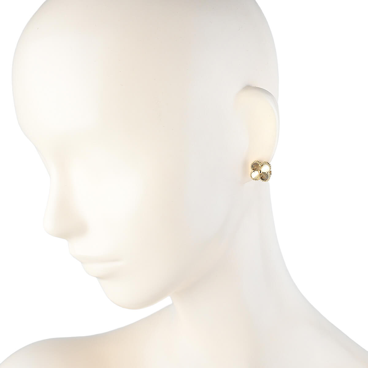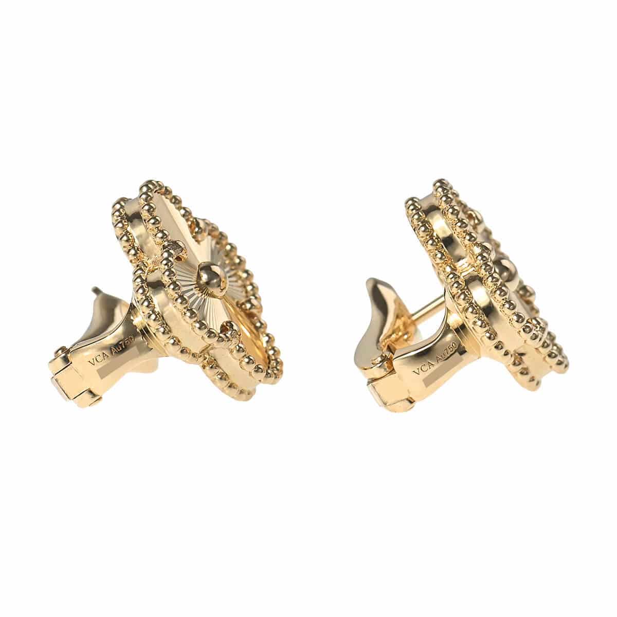 1968年に初めて誕生した幸運のシンボル「アルハンブラ」の特徴を受け継ぎ、『VanCleef&Arpels(ヴァンクリーフ&アーペル)』ならではの独創性と時を超えるエレガンスを湛える「ヴィンテージアルハンブラ」コレクション。2018年に初めて「アルハンブラ」コレクションに加わり、誇らしくその存在感を示している“ギヨシェ彫刻”のイエローゴールドモチーフがあしらわれたイヤリングピアス。金細工やテーブルウェアから着想を得た伝統的な職人技であるこの伝統技法“ギヨシェ彫刻”は、1910年代に時計の文字盤に採用したことに始まり、オブジェやアクセサリーに用いられ、今ではメゾンの歴史を物語る重要な技法のひとつとなっています。深い彫り込みがマテリアルの表面に繊細なレリーフ効果をもたらし、まるで太陽の光が反射するように華やかな光を放つ“ギヨシェ彫刻”が、この幸運のシンボルをひときわ美しく輝かせているイヤリングピアス。光の変化で様々に表情を変える、温もりあるイエローゴールドのきらめきがどんな表情も美しく照らしてくれますね。