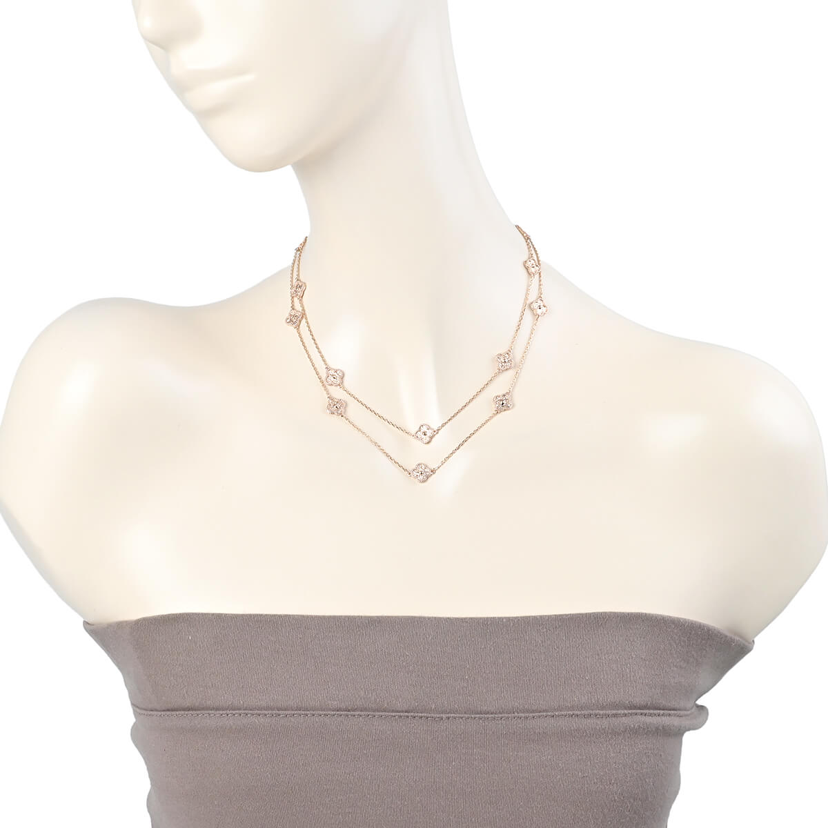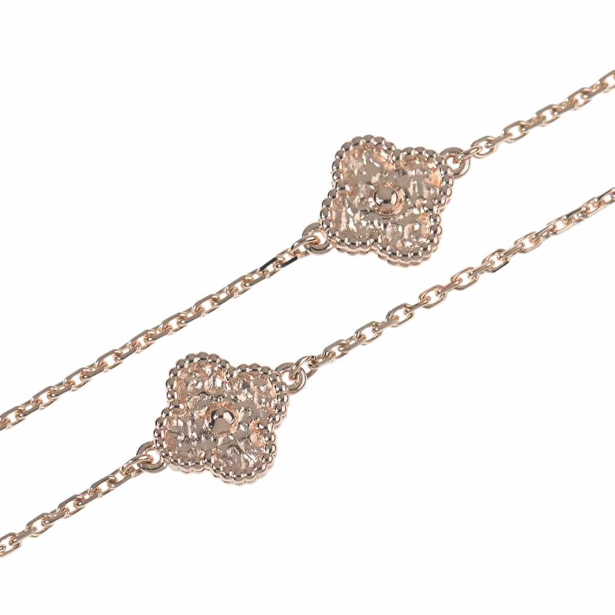 『VanCleef&Arpels(ヴァンクリーフ&アーペル)』を代表するアイコンであり、誕生以来世界中に数え切れないほどの幸せを運んできた幸福のシンボル「アルハンブラ」。可憐なゴールドビーズに縁取られたローズゴールドのミニチュアクローバーが16ピースあしらわれた、「スウィート アルハンブラ」のロングネックレスです。クローバーひとつひとつに、職人の手作業で施された異なる仕上げが、フェミニンでエレガントなコントラストを魅せています。たくさんつけてもしつこくなく、むしろ“素敵”にまとまる、不思議な個性をもつアルハンブラはコレクションで揃えていって、バリエーションを魅せるのも。軽やかで繊細な、ひとめでヴァンクリーフとわかるアイコニックなミニチュアクローバーが、日々にさりげない幸運をもたらしてくれそうなコレクションジュエリーです。