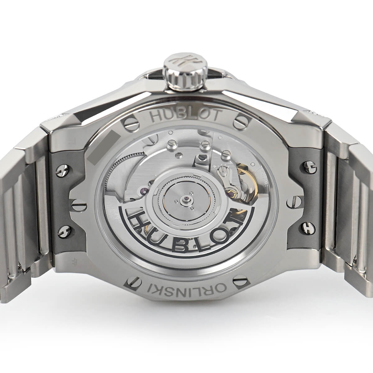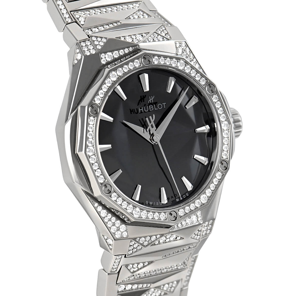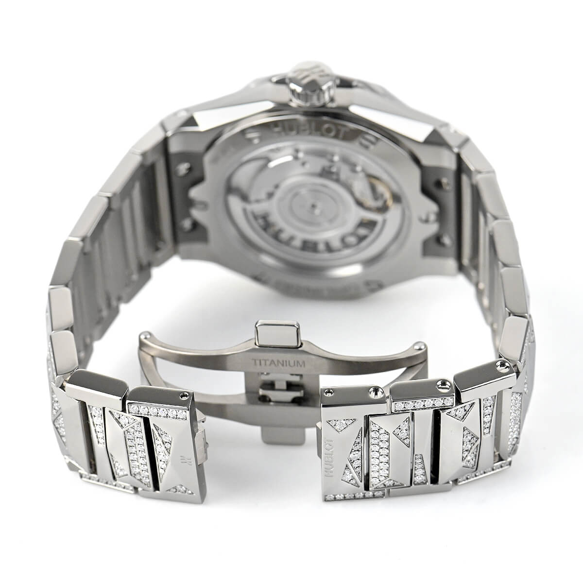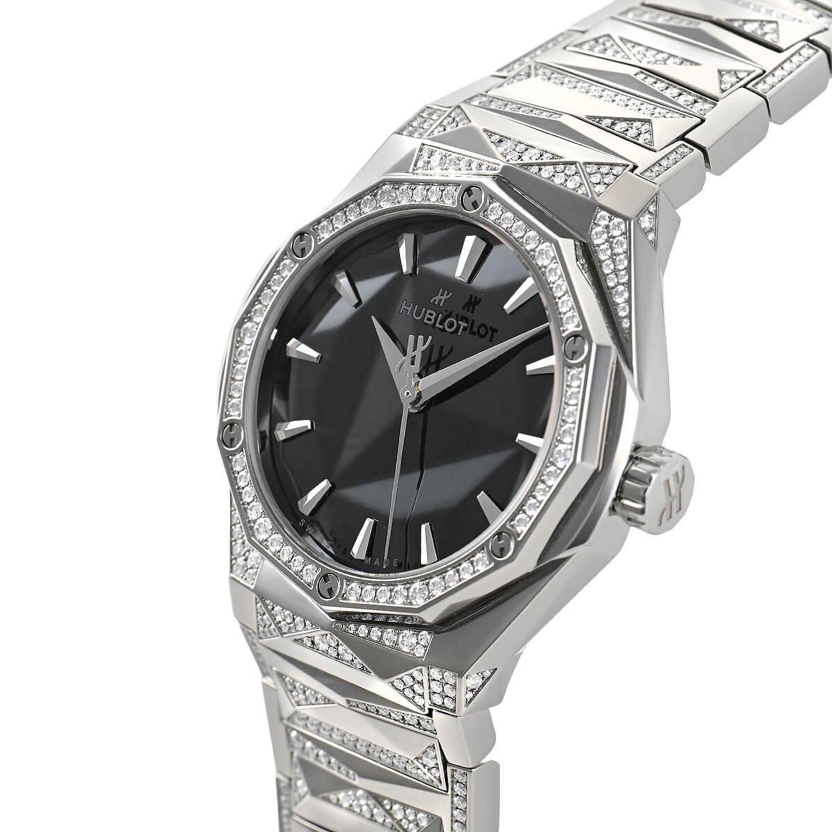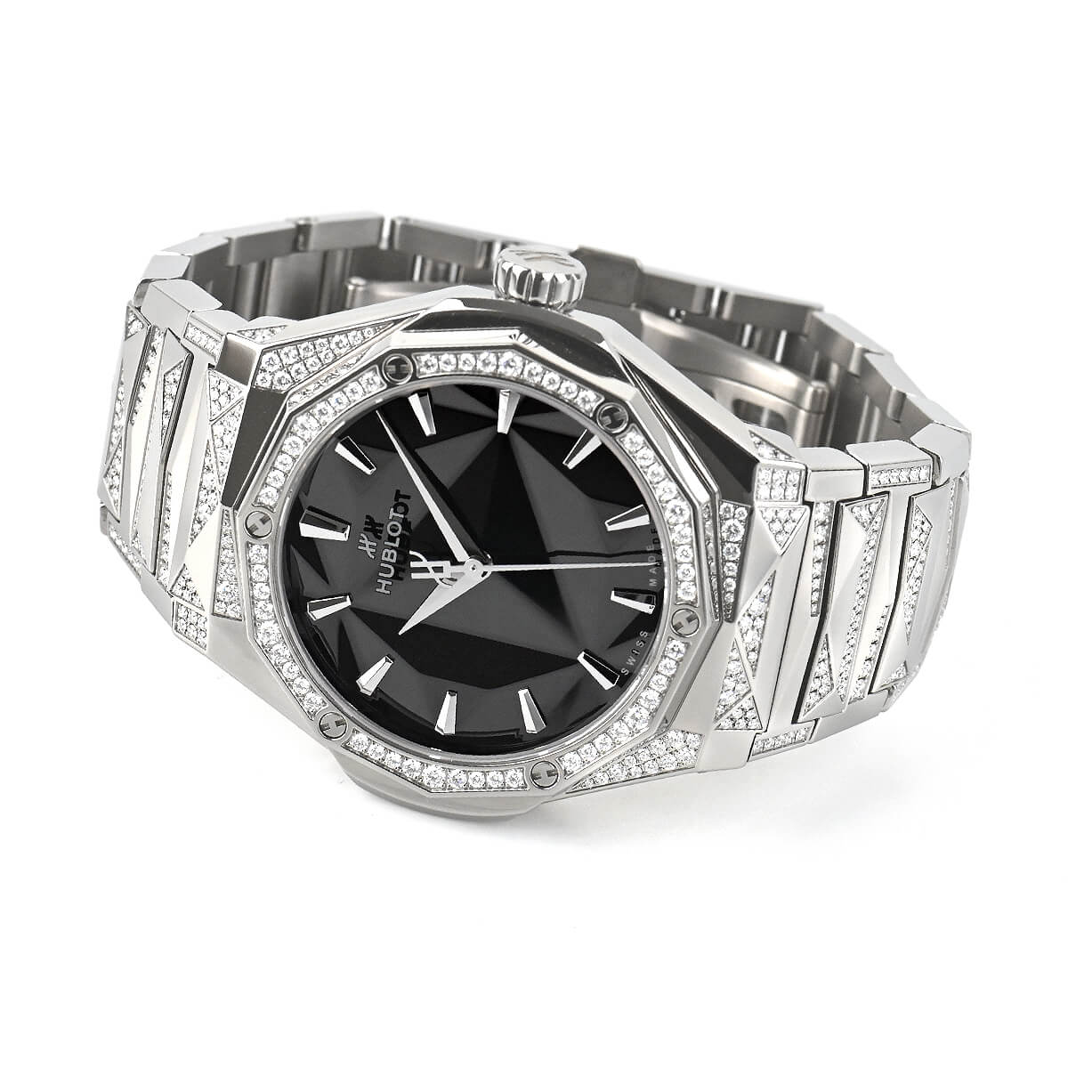 革新的な素材を使い時計製造をおこなうウブロと、フランス人現代アーティストの奇才、リチャード・オーリンスキー氏がコラボレートして生まれたのが【クラシックフュージョン オーリンスキー】です。こちらはチタンのベゼルとブレスレットにダイヤセッティングを施した豪華なオーリンスキーで、文字盤全面にはダイヤモンドのカットを彷彿させるファセット加工も施されており、キラキラと光を反射させ輝きを放ちます。