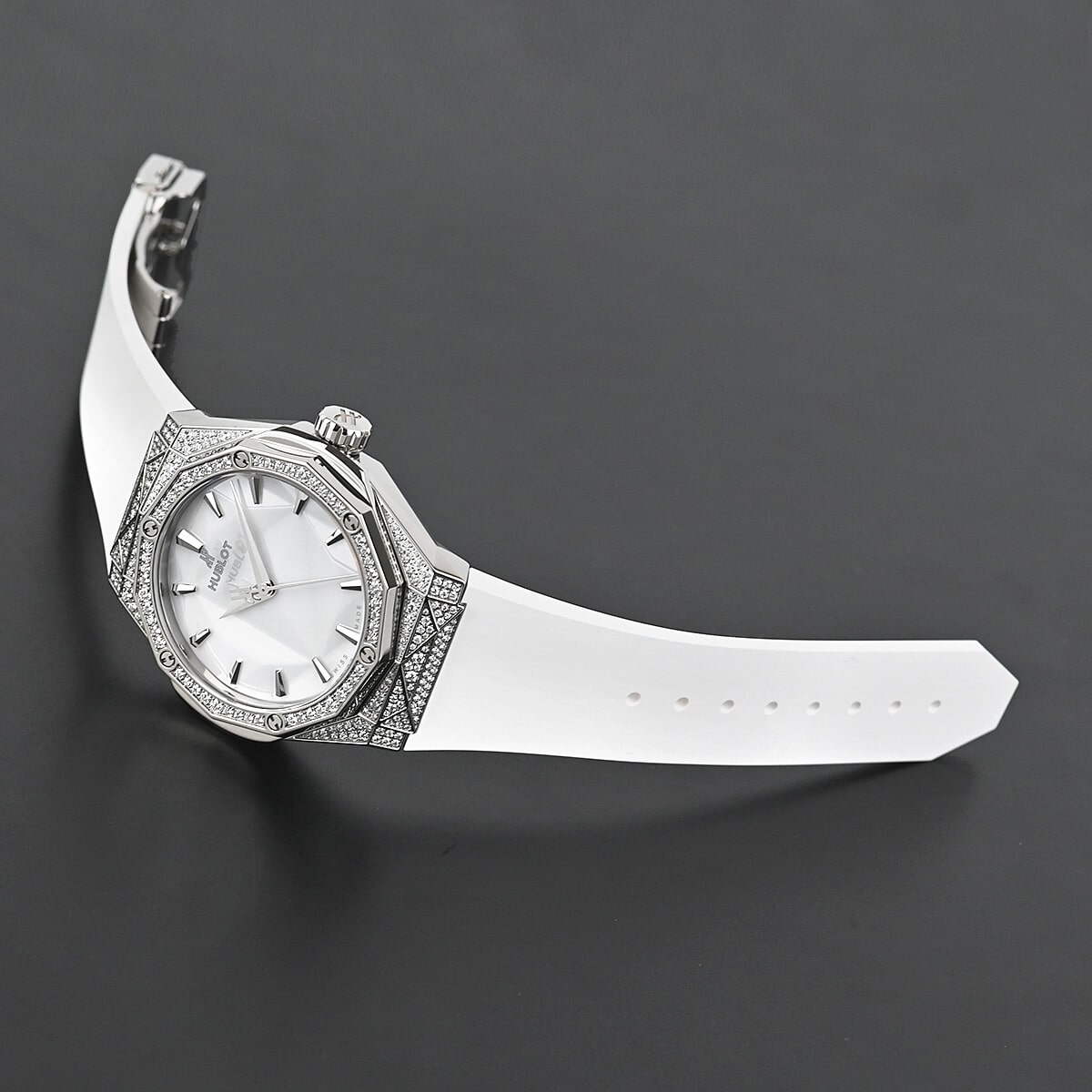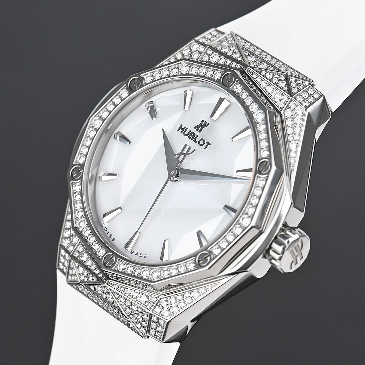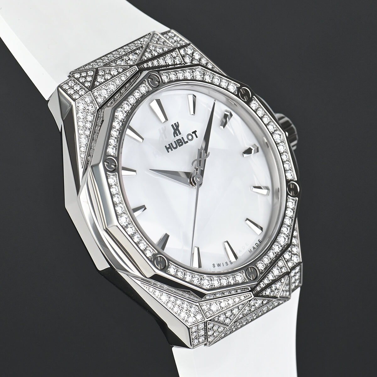 革新的な素材を使い時計製造をおこなうウブロと、フランス人現代アーティストの奇才、リチャード・オーリンスキー氏がコラボレートして生まれたのが【クラシックフュージョン オーリンスキー】です。オーリンスキーモデルの特徴でもある12角形のベゼルとケースの全面にはパヴェダイヤセッティングが施され、さらにホワイトダイアルにもファセット加工が施されているので様々な角度に輝きを放ちます。