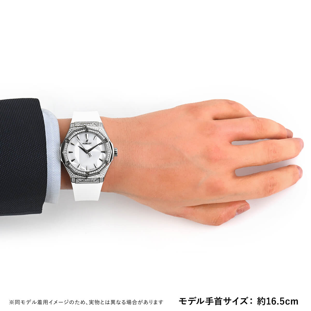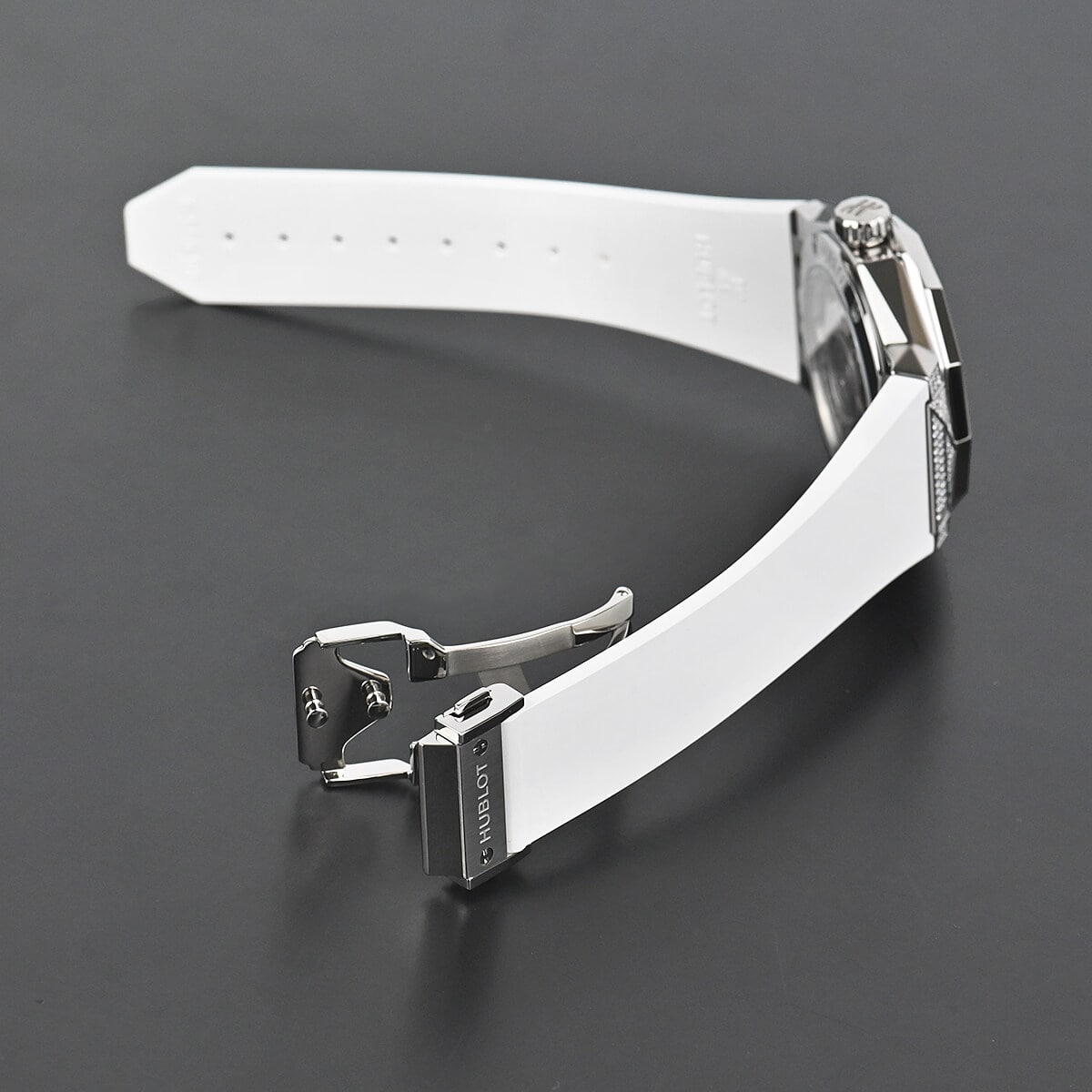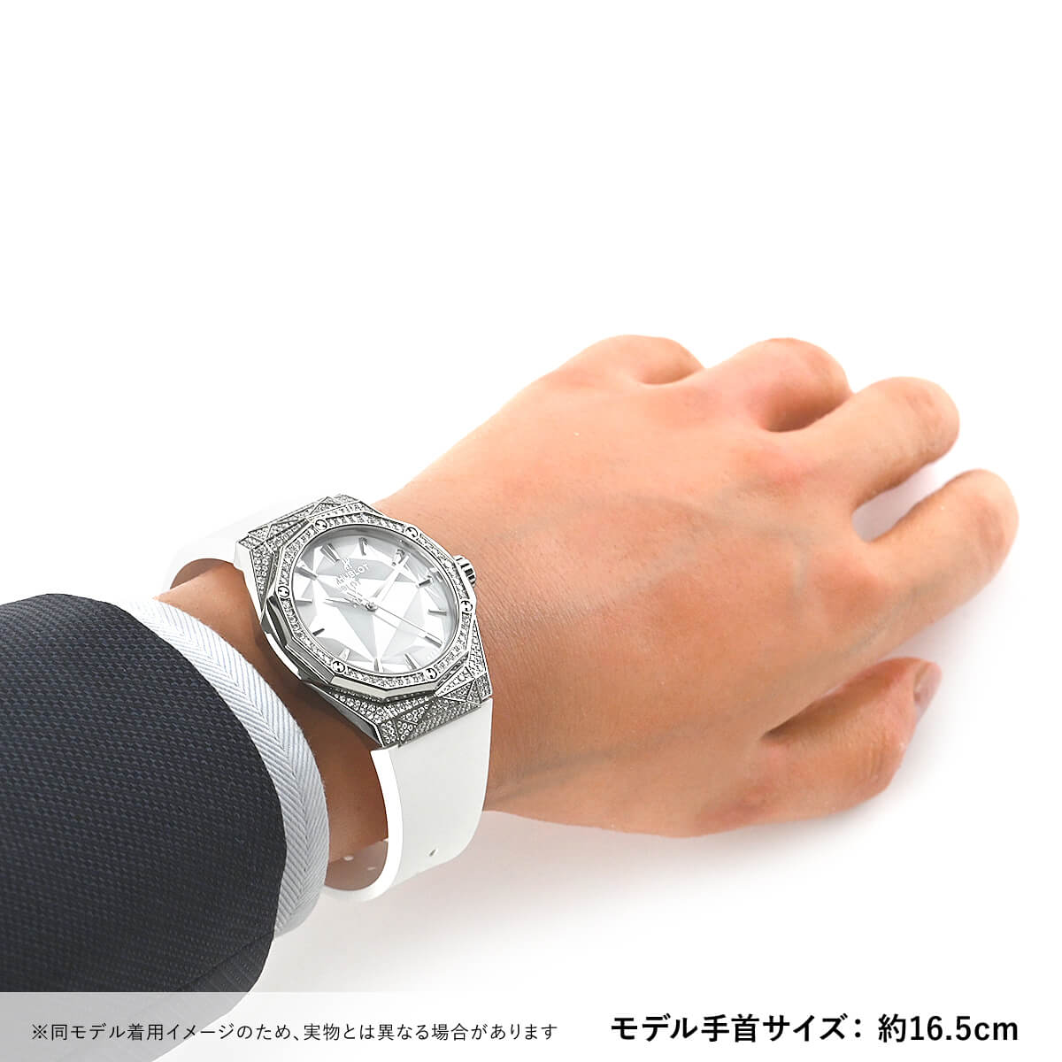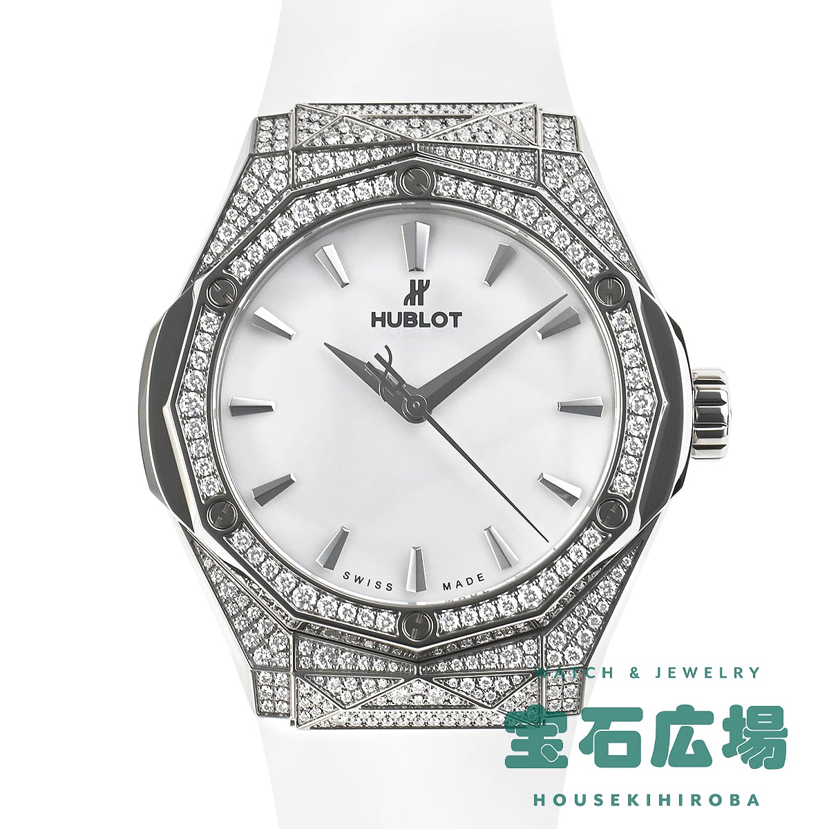 革新的な素材を使い時計製造をおこなうウブロと、フランス人現代アーティストの奇才、リチャード・オーリンスキー氏がコラボレートして生まれたのが【クラシックフュージョン オーリンスキー】です。オーリンスキーモデルの特徴でもある12角形のベゼルとケースの全面にはパヴェダイヤセッティングが施され、さらにホワイトダイアルにもファセット加工が施されているので様々な角度に輝きを放ちます。