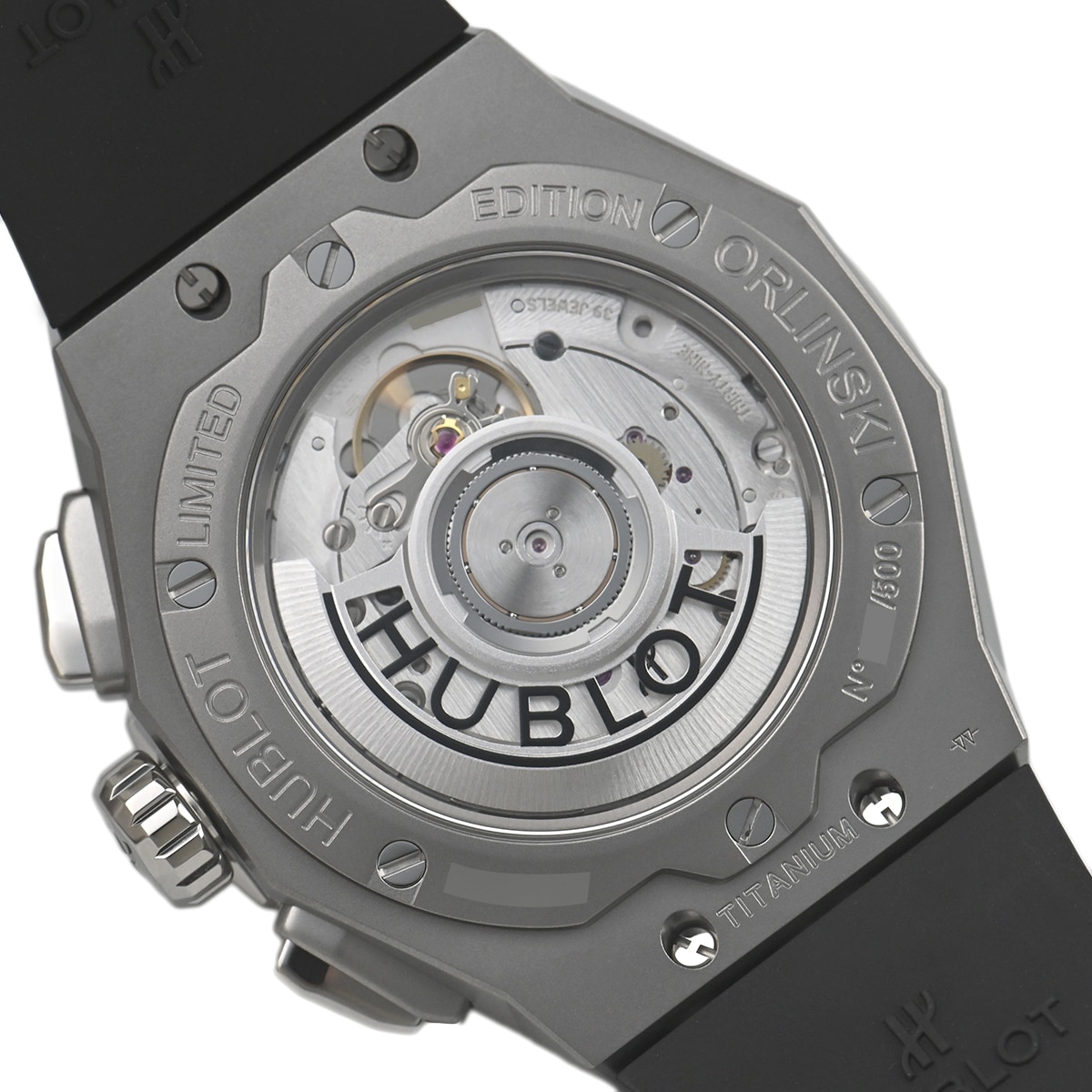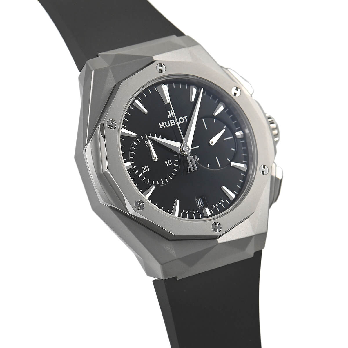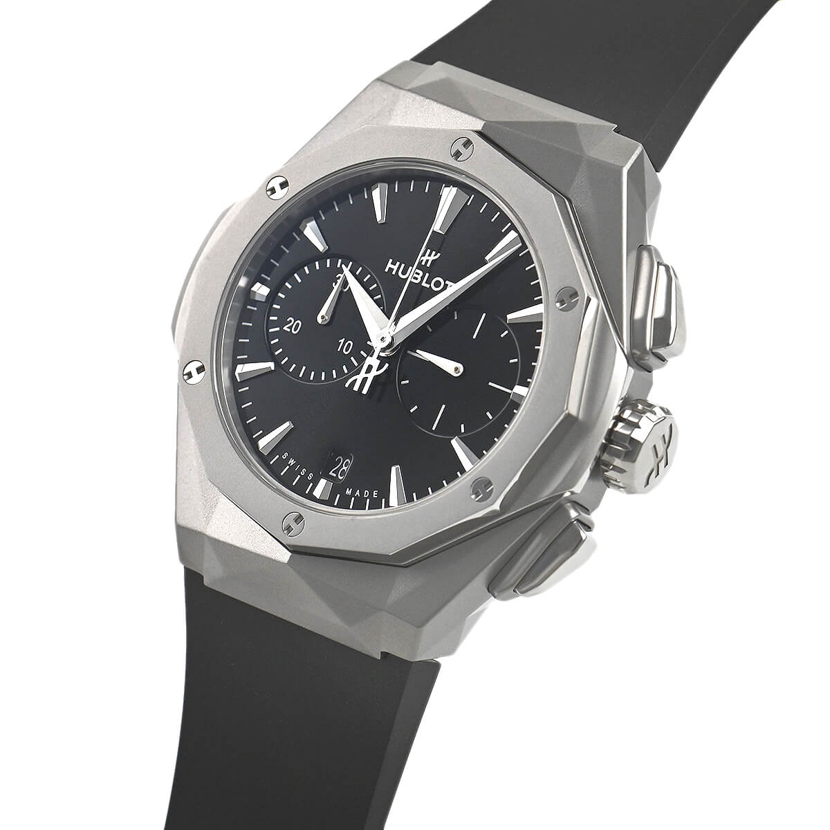 革新的な素材を使い時計製造を行なうウブロとフランス人現代アーティストの奇才、リチャード・オーリンスキー氏がコラボレートして生まれたのがこちらの【クラシックフュージョン オーリンスキー チタニウム】世界500本の限定モデルです。ケースには軽量でありながらも強靭なチタンを採用しマイクロブラスト加工&ポリッシュ仕上げにより非常にシャープでありながら滑らかなデザインとなっております。