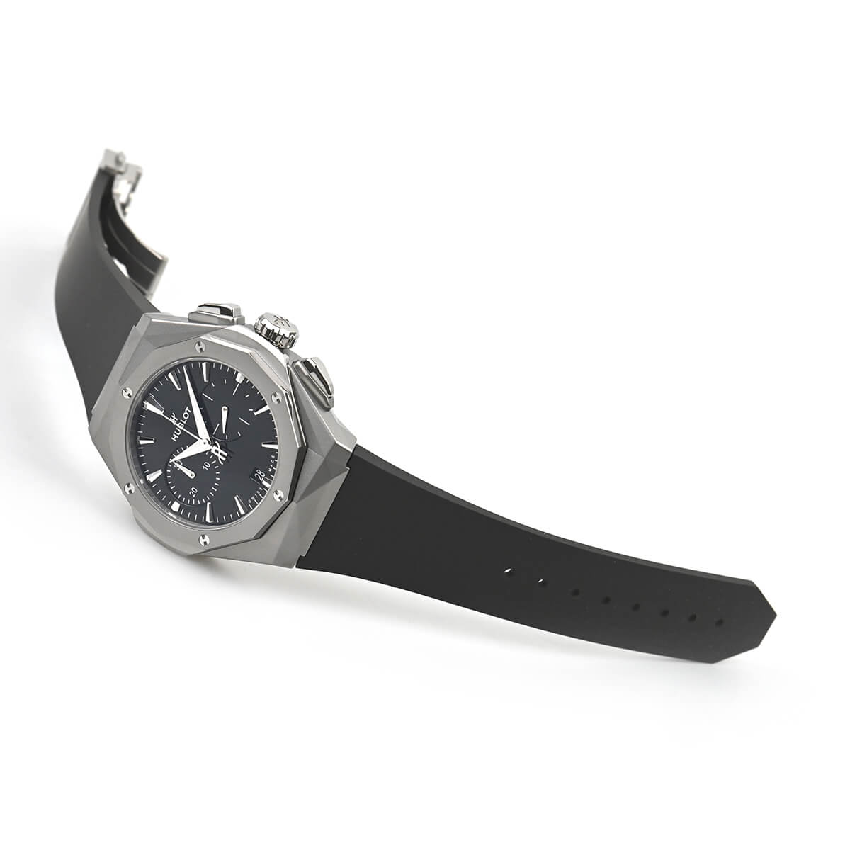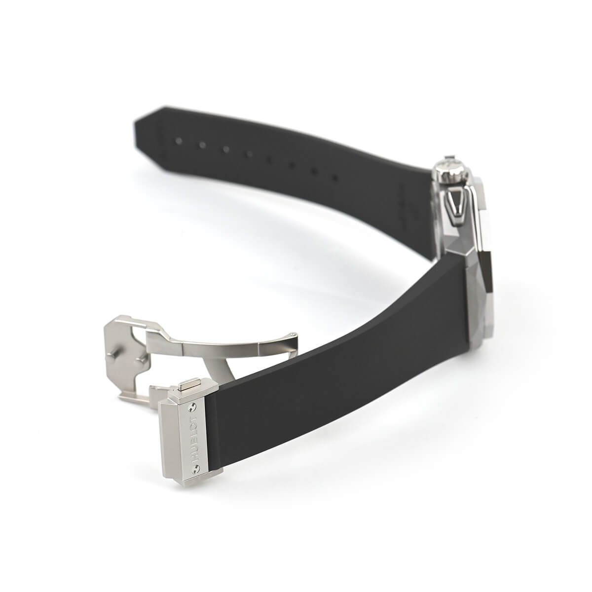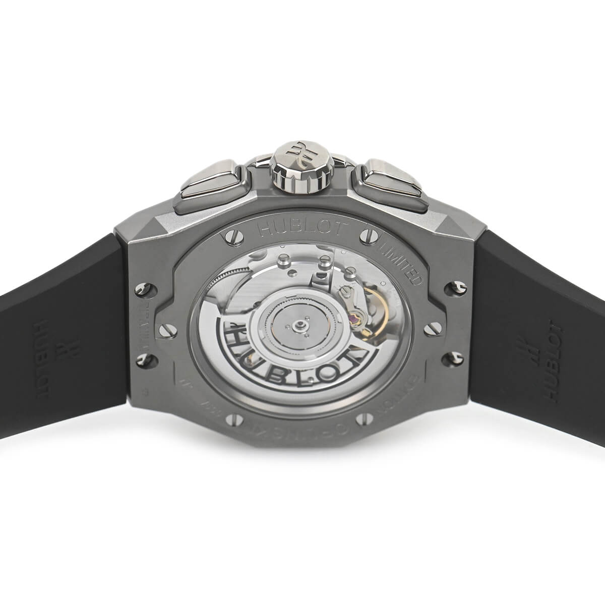 革新的な素材を使い時計製造を行なうウブロとフランス人現代アーティストの奇才、リチャード・オーリンスキー氏がコラボレートして生まれたのがこちらの【クラシックフュージョン オーリンスキー チタニウム】世界500本の限定モデルです。ケースには軽量でありながらも強靭なチタンを採用しマイクロブラスト加工&ポリッシュ仕上げにより非常にシャープでありながら滑らかなデザインとなっております。