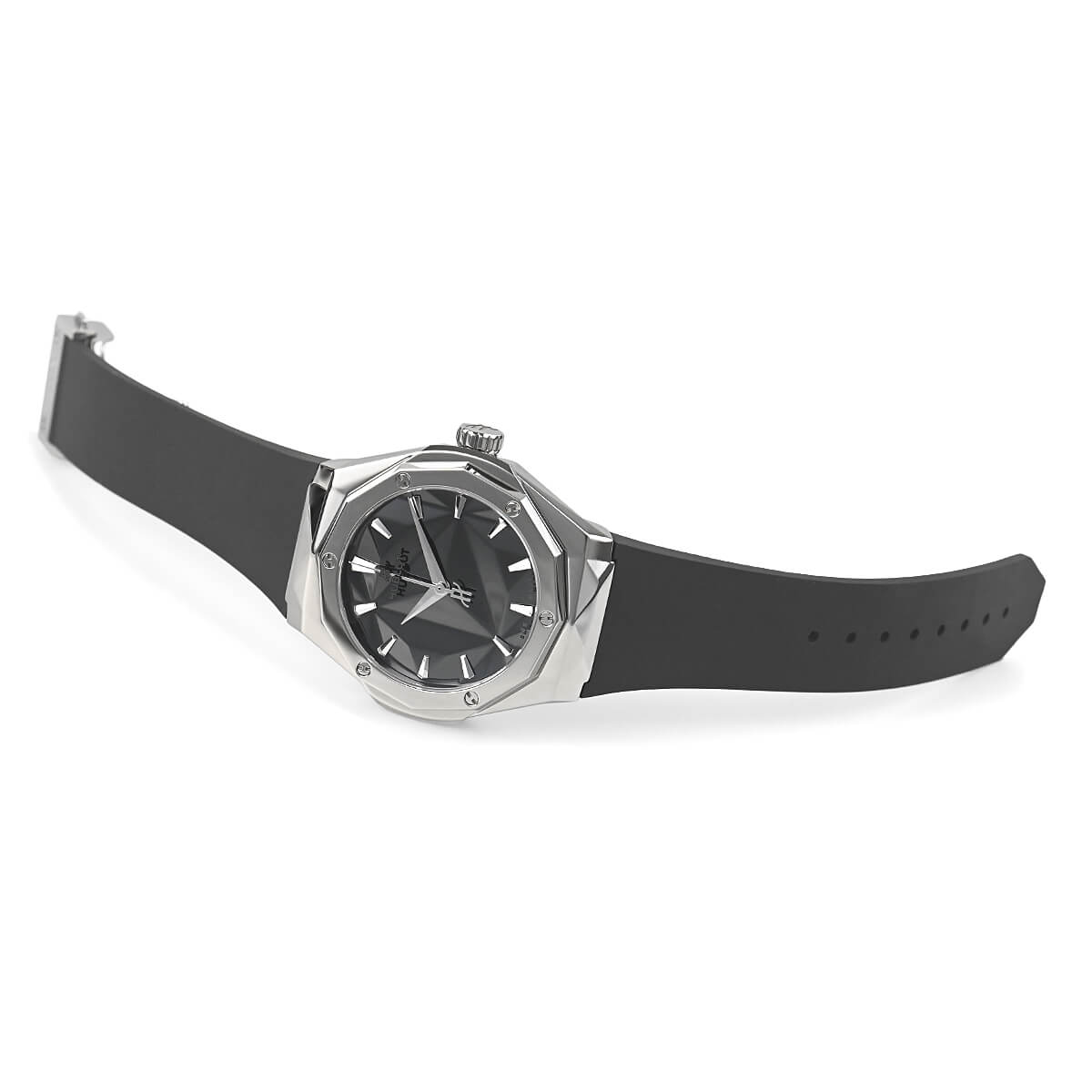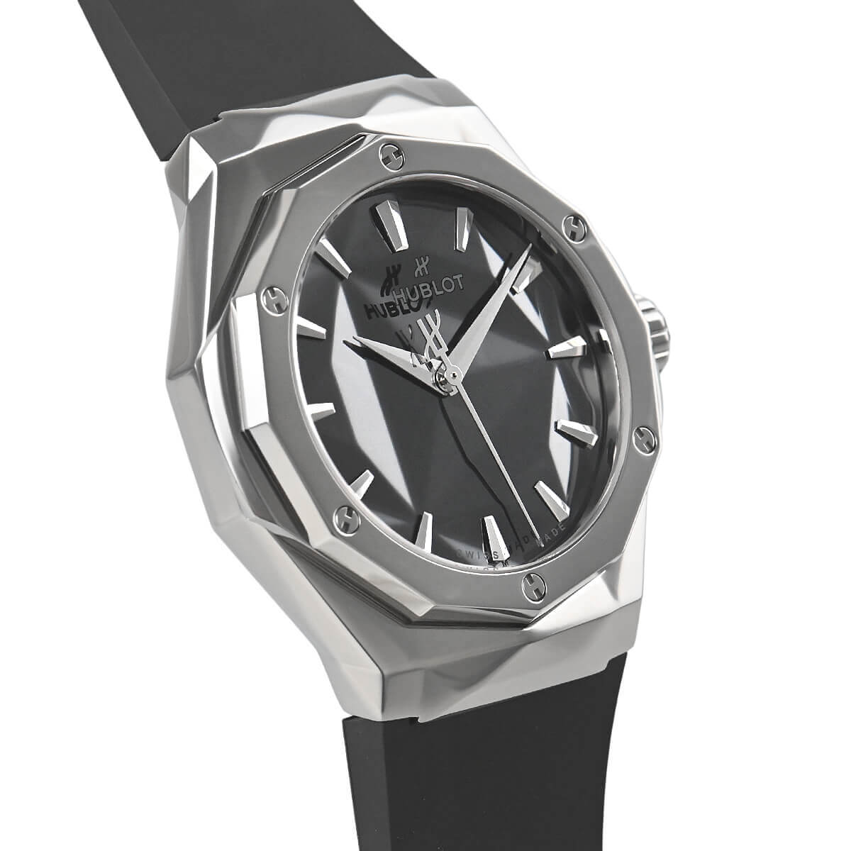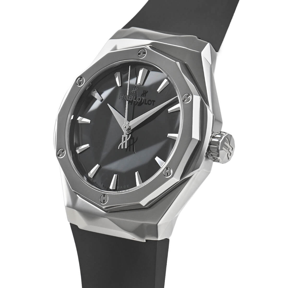 革新的な素材を使い時計製造をおこなうウブロと、フランス人現代アーティストの奇才、リチャード・オーリンスキー氏がコラボレートして生まれた【クラシックフュージョン オーリンスキー チタニウム】。これまでのクラシックフュージョンとは異なり、12角形のベゼルやラグ、そして文字盤全面にもダイヤモンドを彷彿させるファセット加工が施されており、キラキラと光を反射させ輝きを放ちます。
