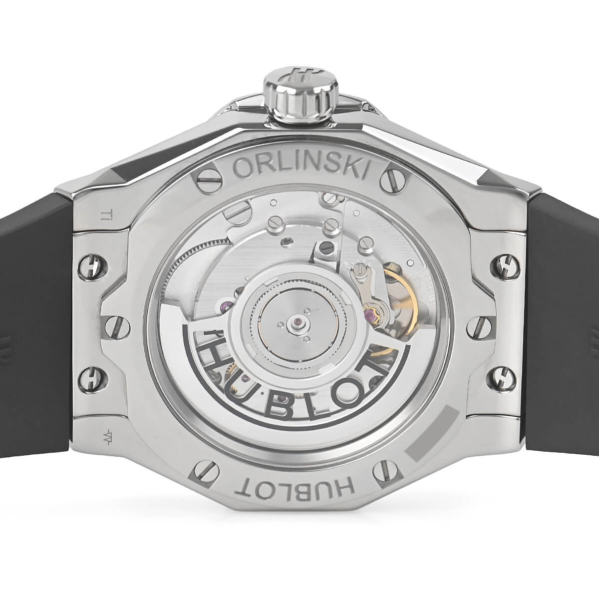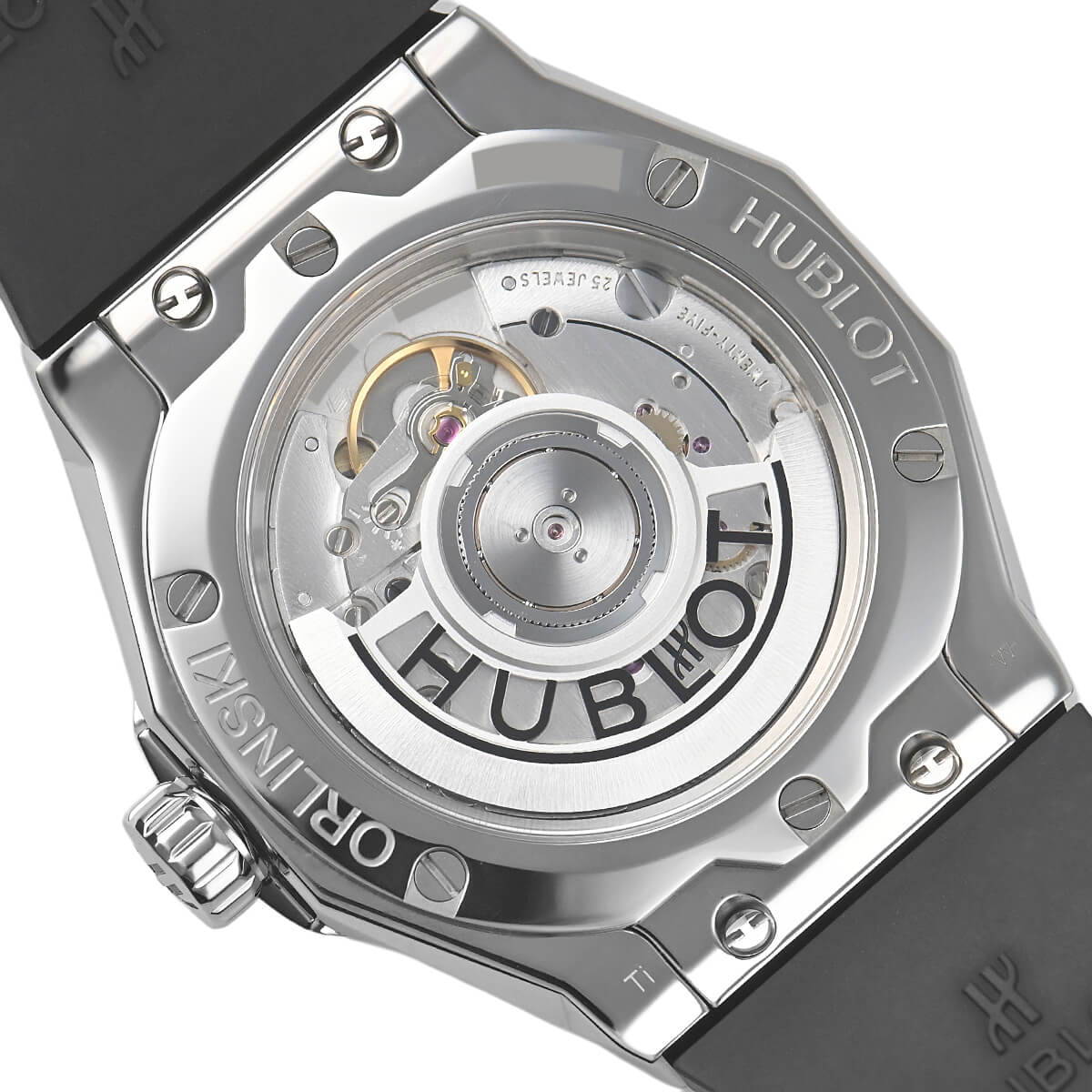 裏蓋はシースルーバックとなっており、42時間パワーリザーブのHUB1100がご覧になれます。