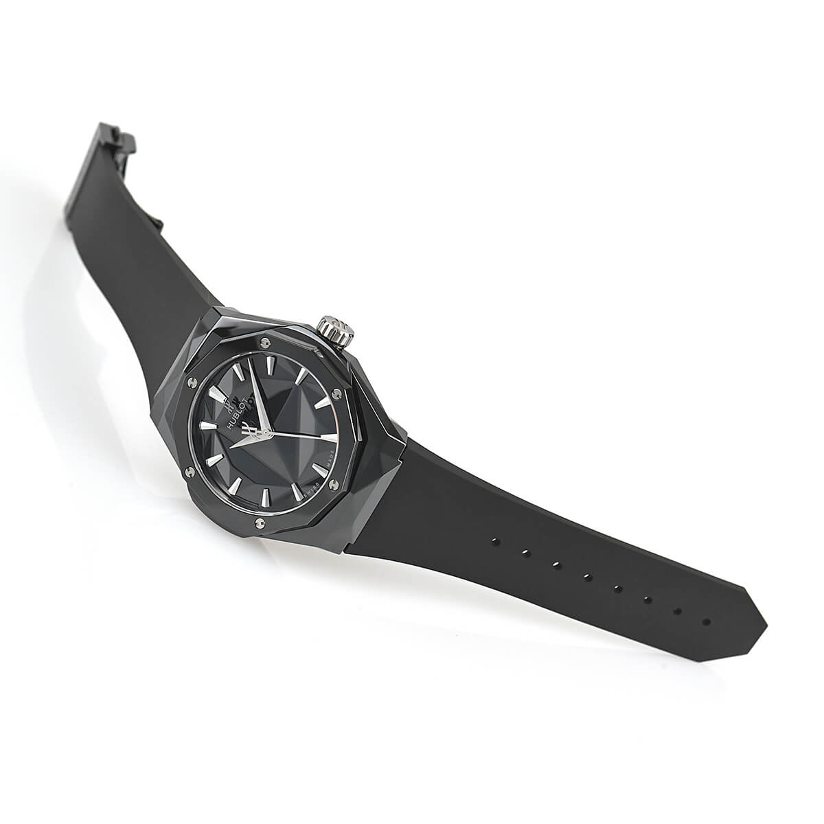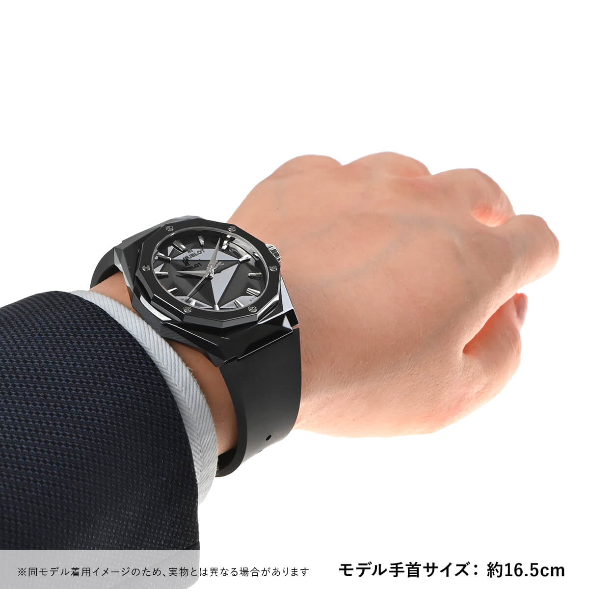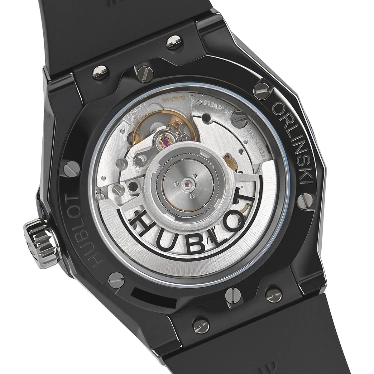 革新的な素材を使い時計製作を行うウブロと、フランス人現代アーティストの奇才、リチャード・オーリンスキー氏がコラボレートして生まれた【クラシックフュージョン オーリンスキー】。こちらはケースや文字盤、ラバーストラップをブラックカラーで統一した「ブラックマジック」です。