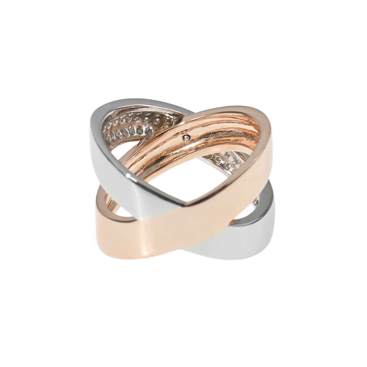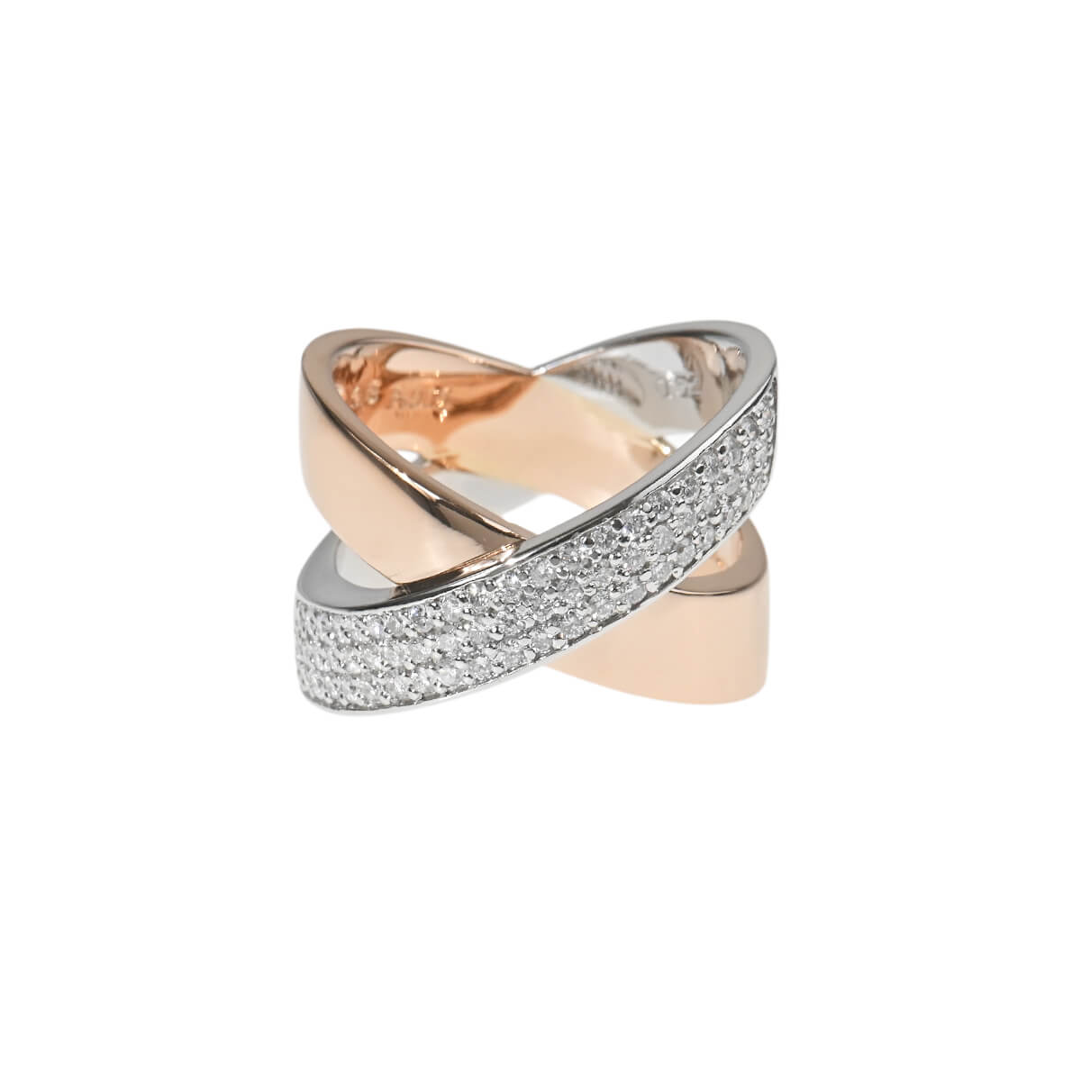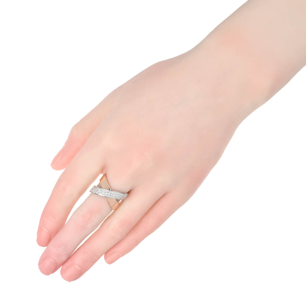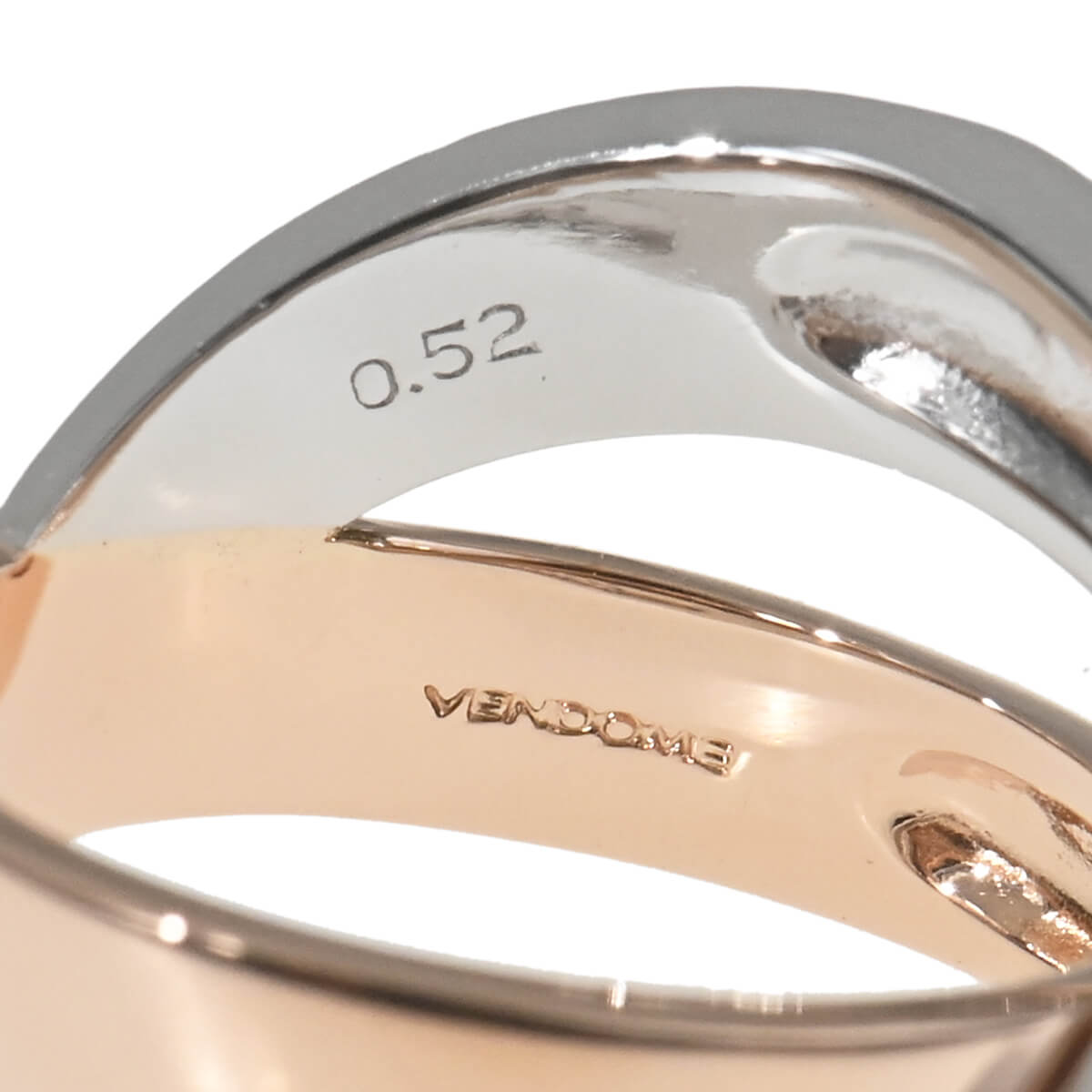 歴史あるドメスティックジュエリーブランド『Vendome Aoyama(ヴァンドーム青山)』。“新しい日本のジュエリーを創りたい”と、1973年、まだ日本の女性にとって、ジュエリーがファッションの一部ではなかった時代から、オリジナルデザインのジュエリーをメインにトレンドを取り入れつつ、永く愛せる洗練された変わらない輝きを届け続けています。艶やかに磨かれたピンクゴールドラインと、0.52ctものダイヤモンドがパヴェセッティングされたプラチナラインがクロスする、ボリュームたっぷりのコンビネーションリング。フランス語で“石畳”を意味する「パヴェ」の名の通り、ダイヤモンドが惜しげもなく敷き詰められたリングは、さまざまな角度で光をとらえ煌めきを放ちます。目を惹く、ユニークな造形でありながらシンプルで、洗練された美しさをもつお洒落なダイヤモンドジュエリーです。