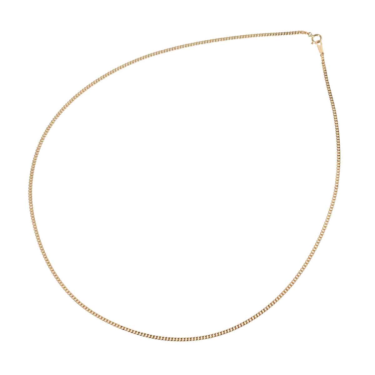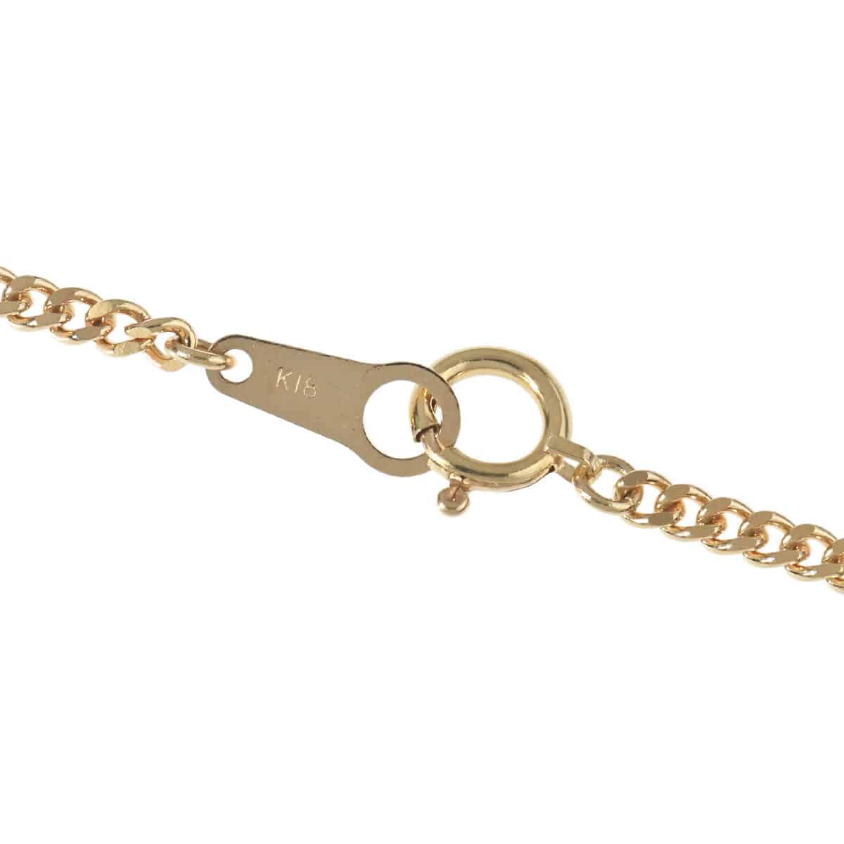 約55センチ、幅約2.2ミリ、約9グラムの、イエローゴールド製2面シングルキヘイチェーンネックレス。キヘイチェーンとは、あずき型のチェーンを90度ひねり、さらに押しつぶしたつくりのデザインチェーンのこと。押しつぶした面が綺麗に並んで同じ面を向き、連続していることによるなめらかな輝きが魅力のデザインチェーンです。上下2平面にカットが施された2面シングルのキヘイチェーンは、シンプルでスタンダードなデザイン。1本でつけるのはもちろん、ヘッドをとおしたり、レイヤードしたり、ユニセックスにも使えるシンプルなデザインが魅力。資産価値にも注目されるキヘイは他のチェーンとは違い、単なる装飾品としてだけでなく身につける資産としても人気です。