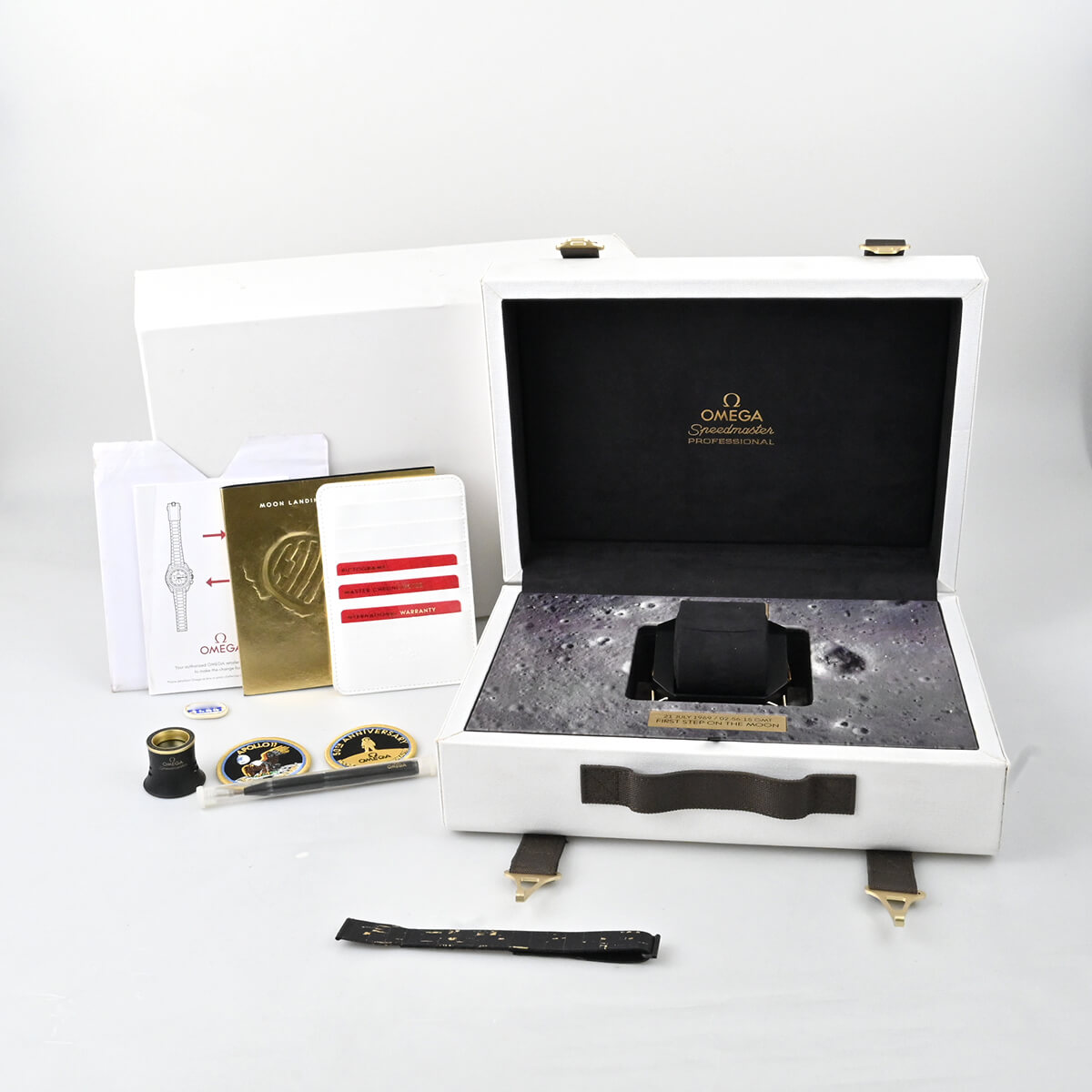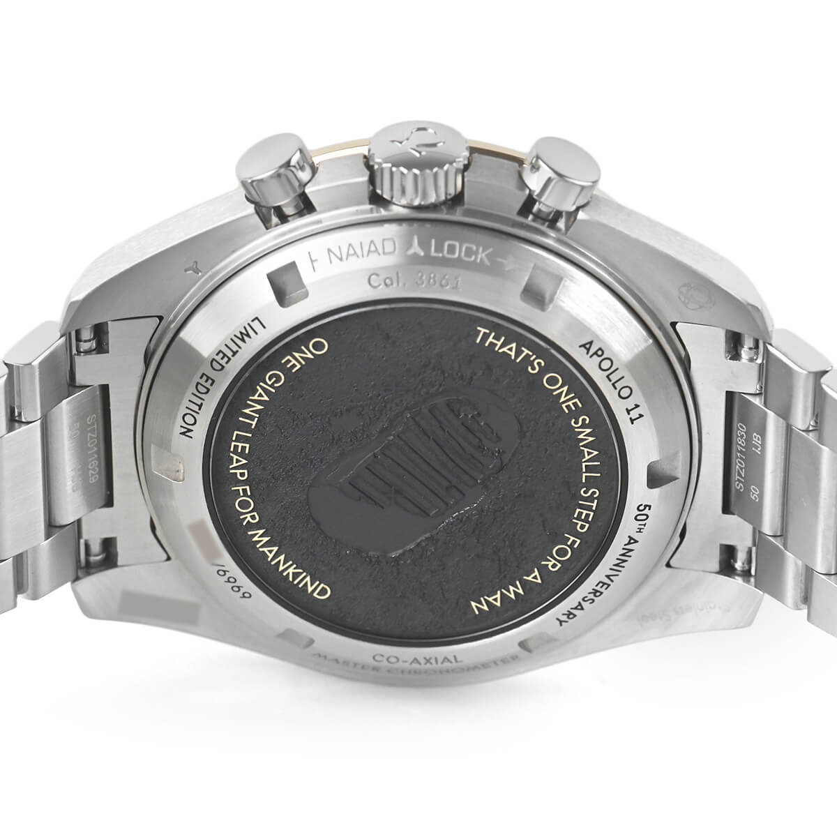 裏蓋には、1969年7月20日10:39(アメリカ東部夏時間)に月面から地球に送信されたニール・アームストロング船長の名言と足跡の画像が刻印されています。