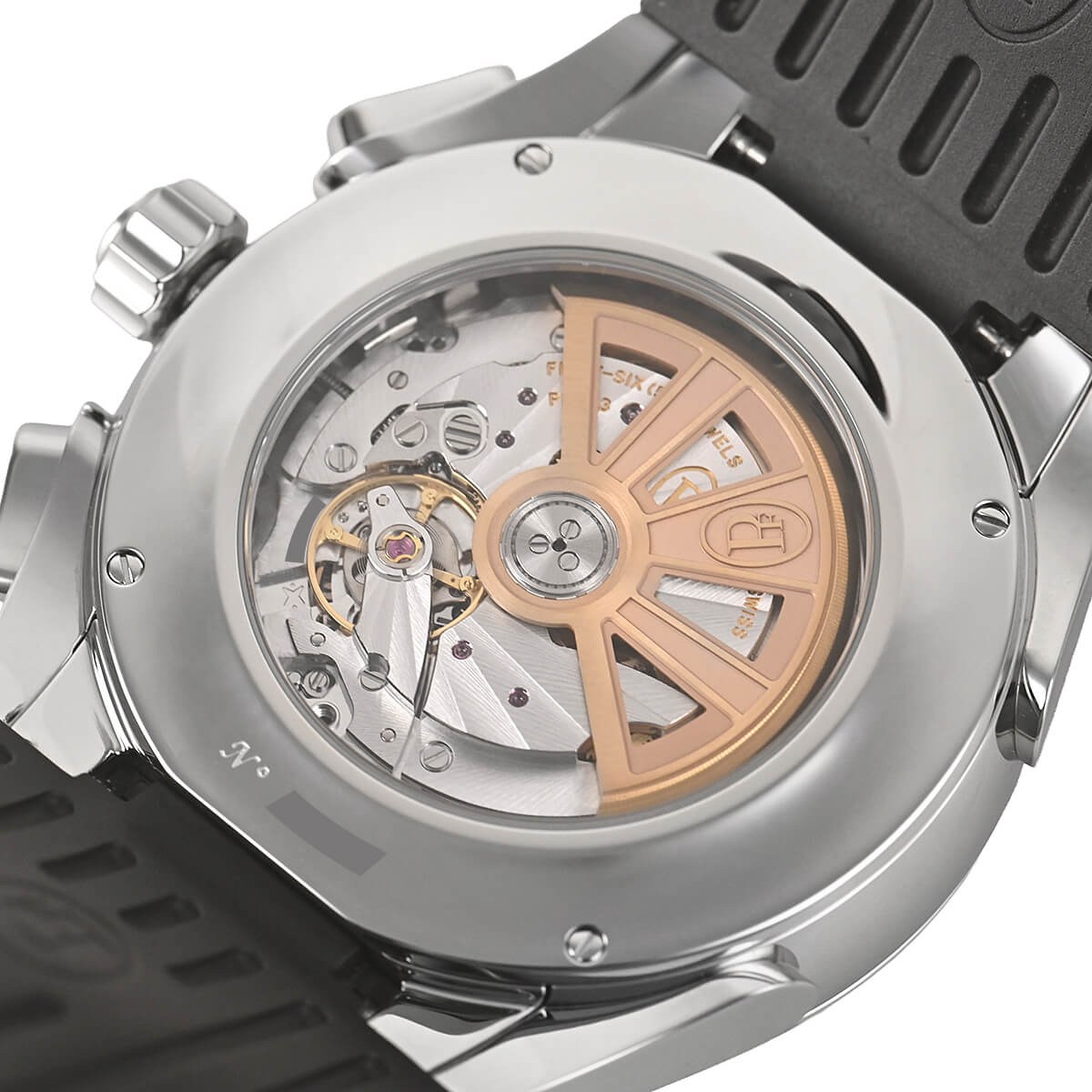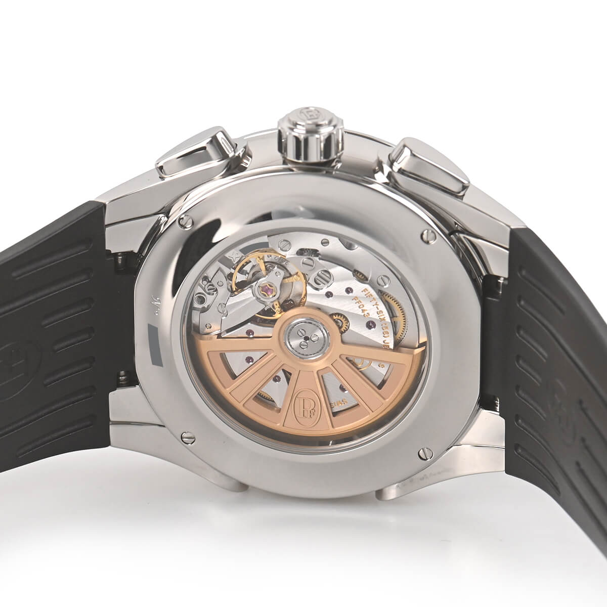 ムーブメントには複雑機構のアニュアルカレンダーとクロノグラフを搭載した45時間パワーリザーブ、自社製ムーブメントのPF043を搭載し、12時位置にビッグカレンダー表示、3時位置には月表示窓を配置します。