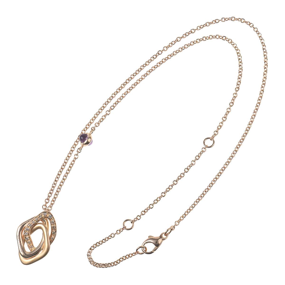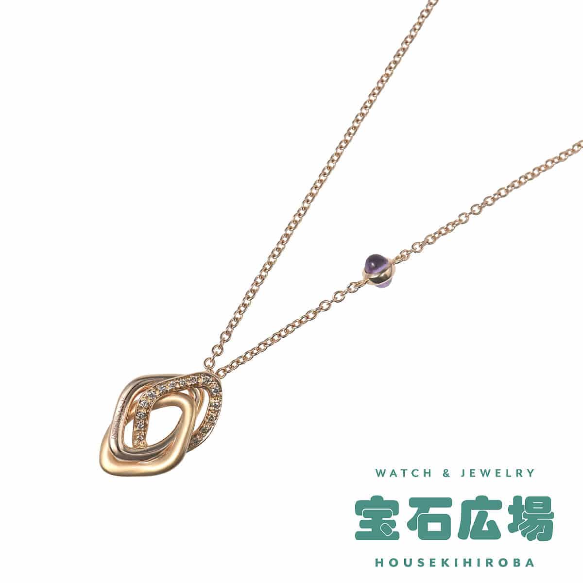 1919年に宝石商としてイタリア・ミラノで創業したブランド『ANTONINI(アントニーニ)』。優れたバランス感覚とセンスが光るモダンなデザインのジュエリーは、“宝石箱にしまっておくジュエリーではなく、いつでも使えるジュエリー”をテーマに全て一流の職人の手によってハンドメイドで生み出されています。ポリッシュとサテン、そしてダイヤモンドで描かれたラインが重なり合って形づくるモチーフが、重厚感あるチェーンにあしらわれたピンクゴールド製ペンダントネックレス。チェーンにセットされたカボションシェイプのアメシストが、デザインのアクセントになっています。光を纏ったダイヤモンドがエレガンスを湛えてスタイリングを印象づける、洗練された個性を感じるお洒落なダイヤモンドジュエリーです。