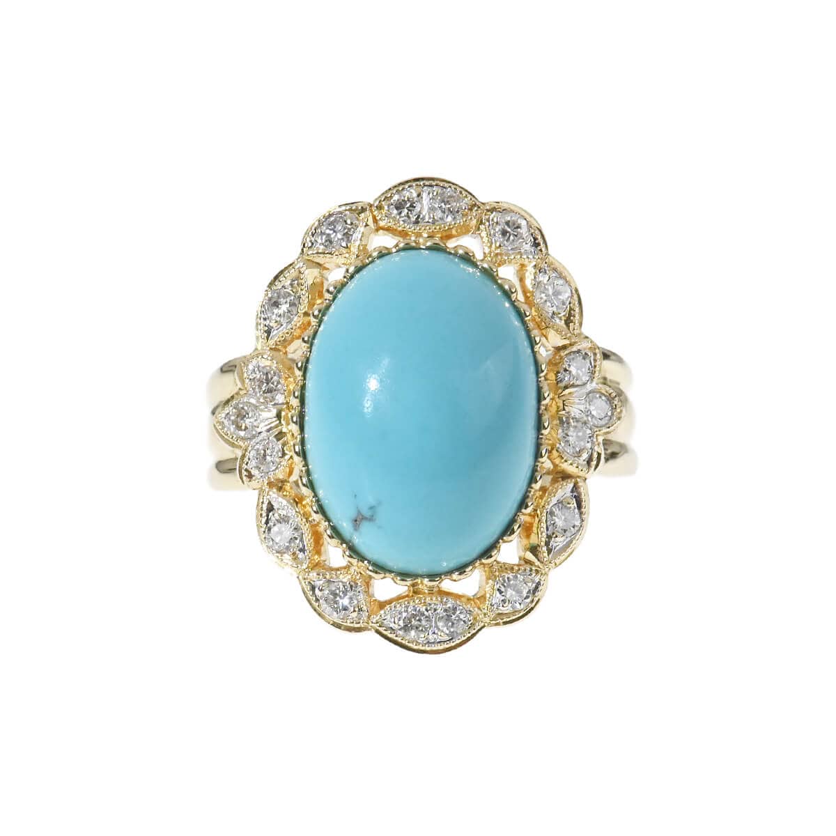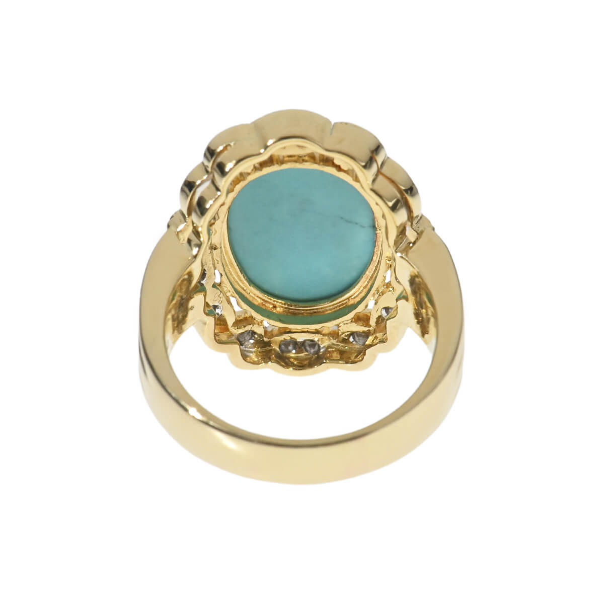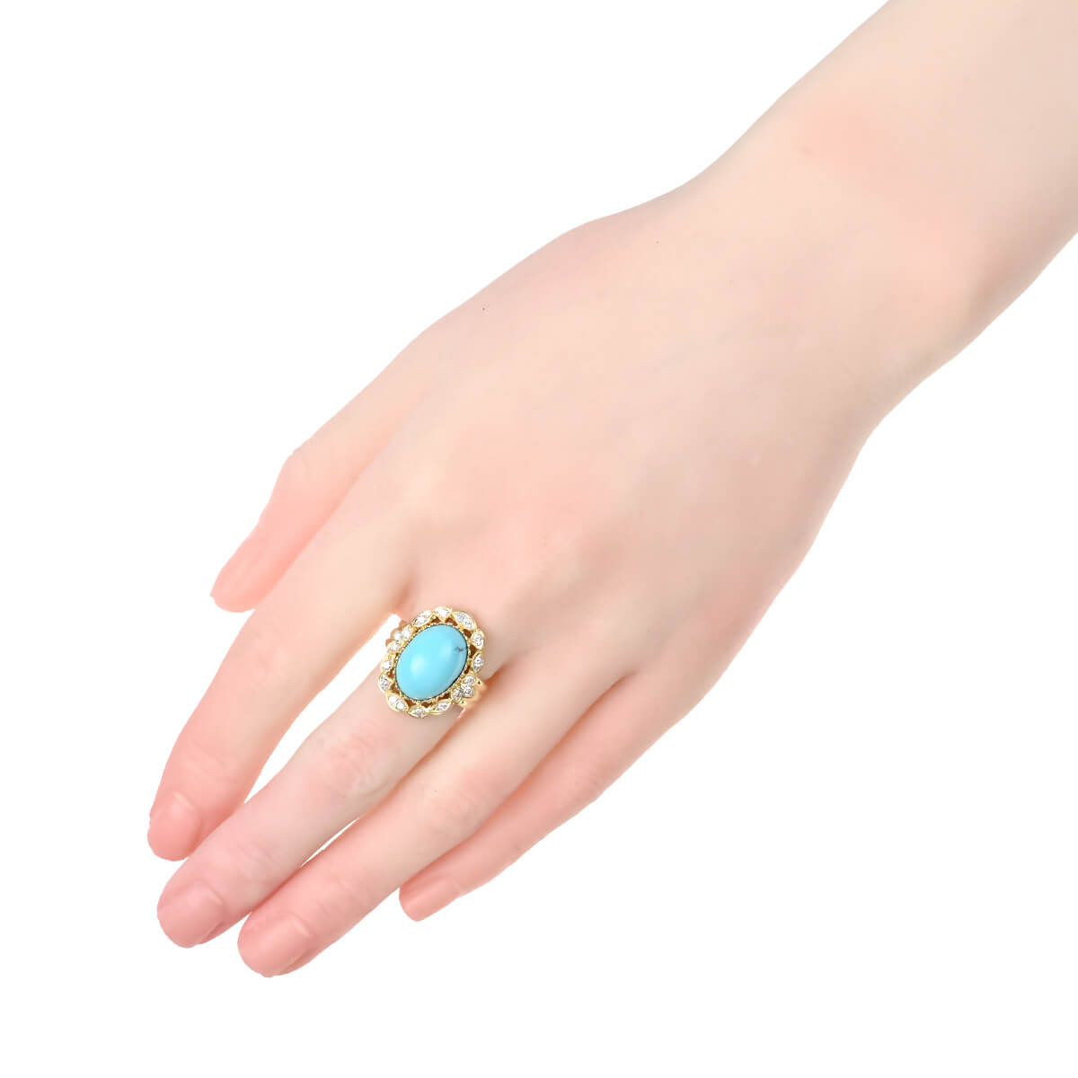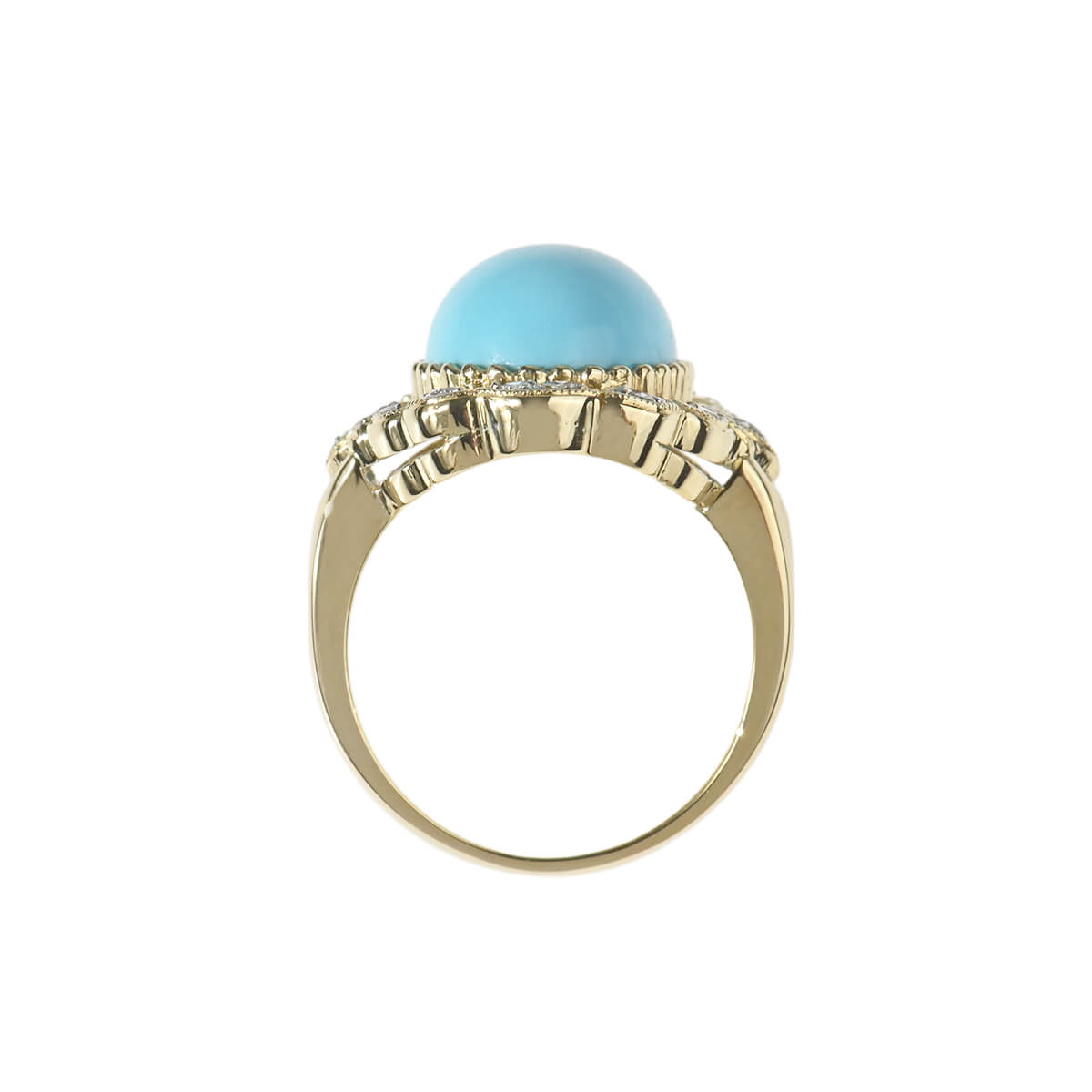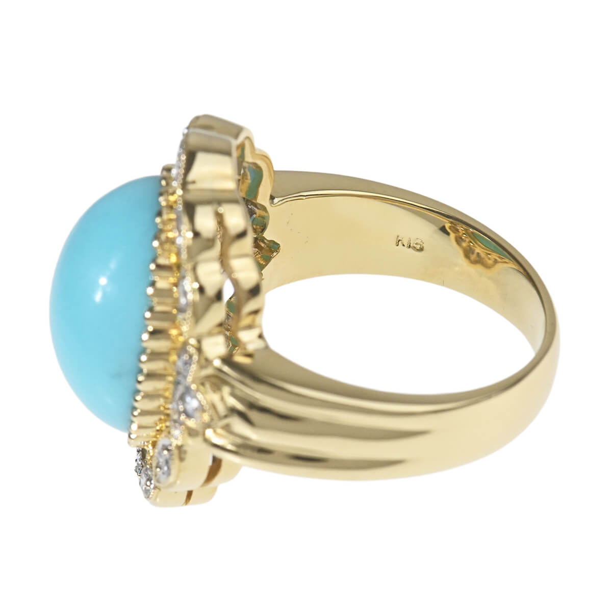 “ターコイズブルー”という色名が生まれるほど美しい、この石ならではの色あいが特長で、様々な表情を持つジェムストーンであるターコイズをメインにデザインされたイエローゴールド製リング。大きなターコイズの周りを飾るダイヤモンドの輝きと、ブルーの反対色でもあるイエローゴールドが全体の雰囲気をよりエレガントに、華やかに仕上げています。デイリーのカジュアルのアクセントやドレスアップにはもちろん、和装でのコーディネートも素敵。大胆な美しさと洗練された個性で指先を彩る、コストパフォーマンスの高さも魅力の美しく上質なカラーストーンジュエリーです。