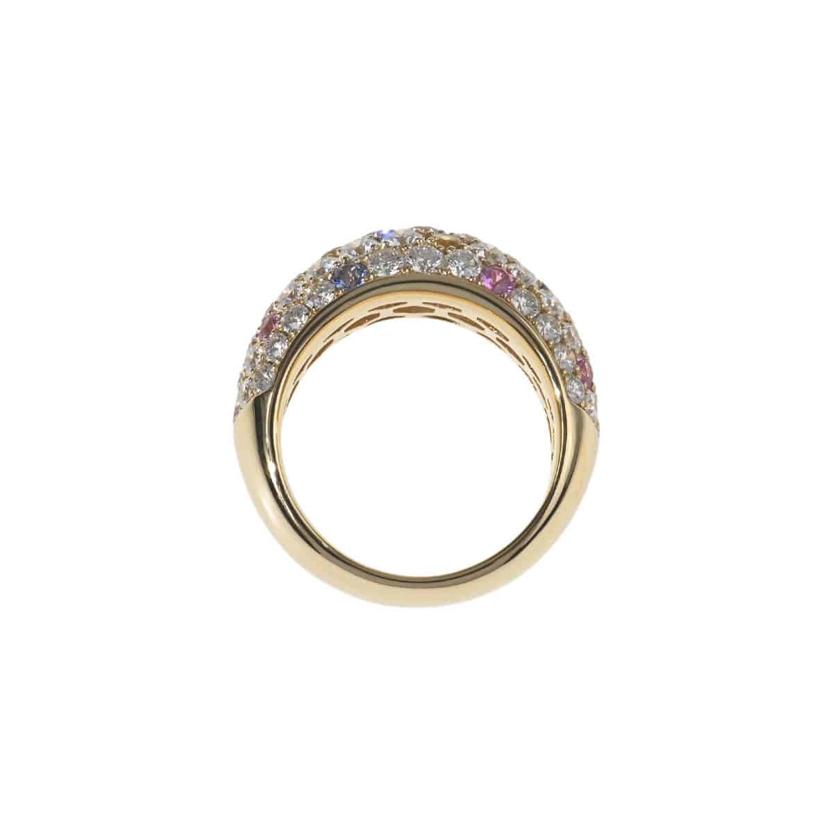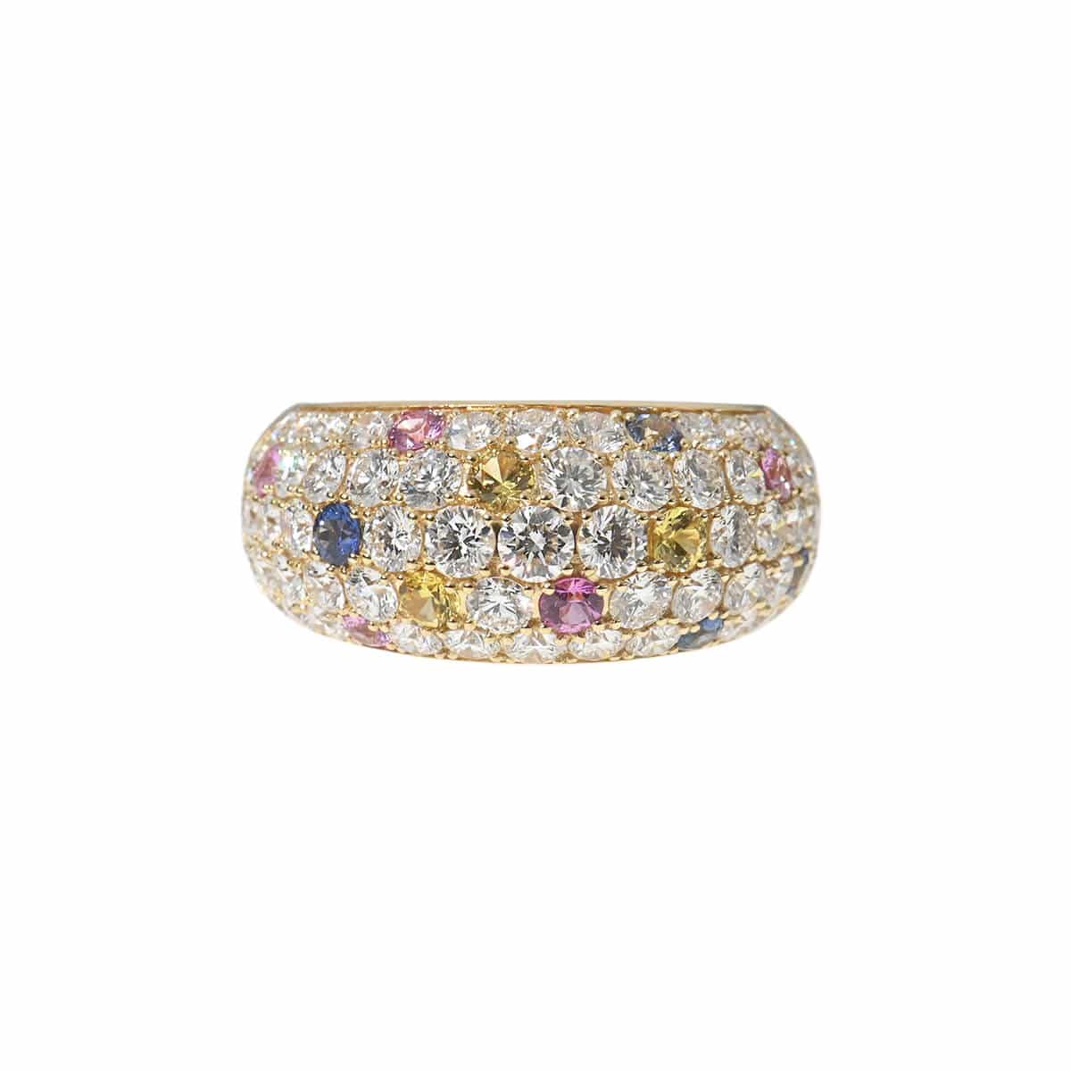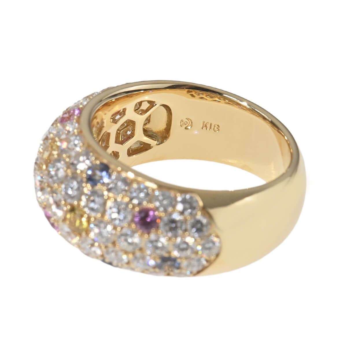 パール&ダイヤモンドジュエリーの未知なる世界を切り拓き、美しくそして大胆に、比類なき美意識をもって、身に纏うアートのようなモダンアートクリエイションを追求する日本発のラグジュアリージュエラー『TASAKI(タサキ)』。世界に誇る基準のハイクオリティ、繊細かつ革新的なクリエイティビティ、そして最高の素材を最高美のジュエリーへと昇華させる、磨き抜かれたクラフツマンシップをもつ、日本を代表するブランドのひとつです。ボリュームたっぷりの優美なフォルムのリングにダイヤモンドを敷き詰めて、さらに色とりどりのカラーサファイアを散りばめたイエローゴールド製リング。ダイヤモンドの大胆なきらめきと、イエロー、ブルー、ピンクのサファイアがエレガントで華やかなコントラストを魅せています。洗練された大人の個性と上質なストーンを楽しめる、美しく、優美で上質なハイジュエリーです。