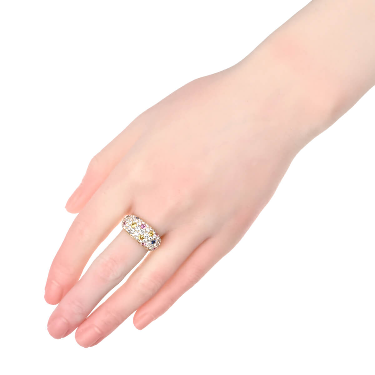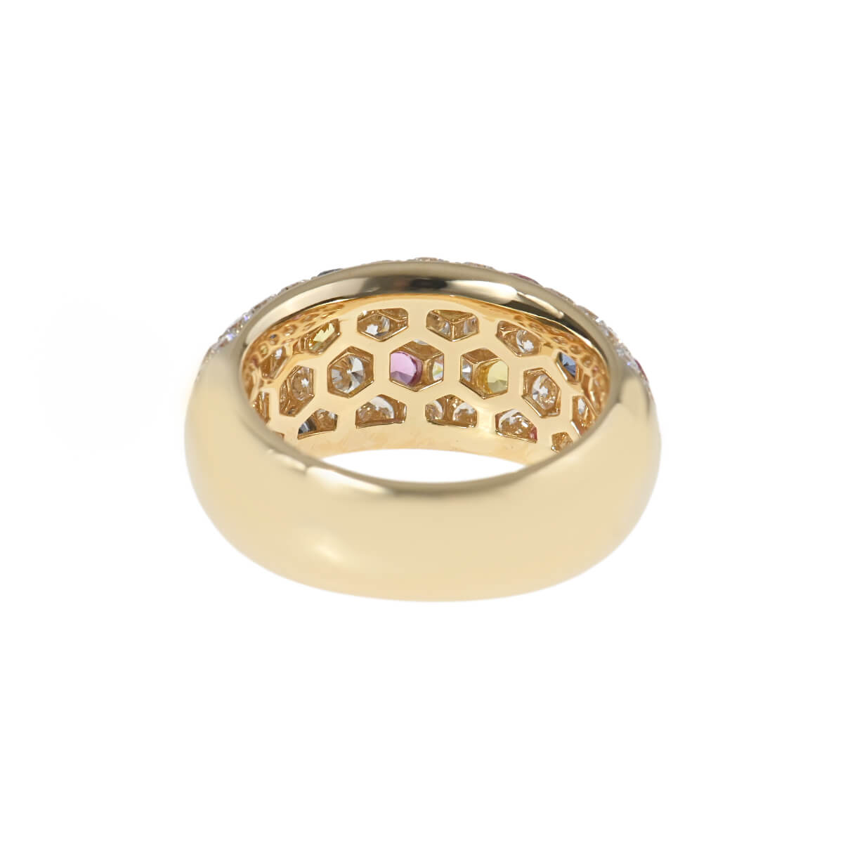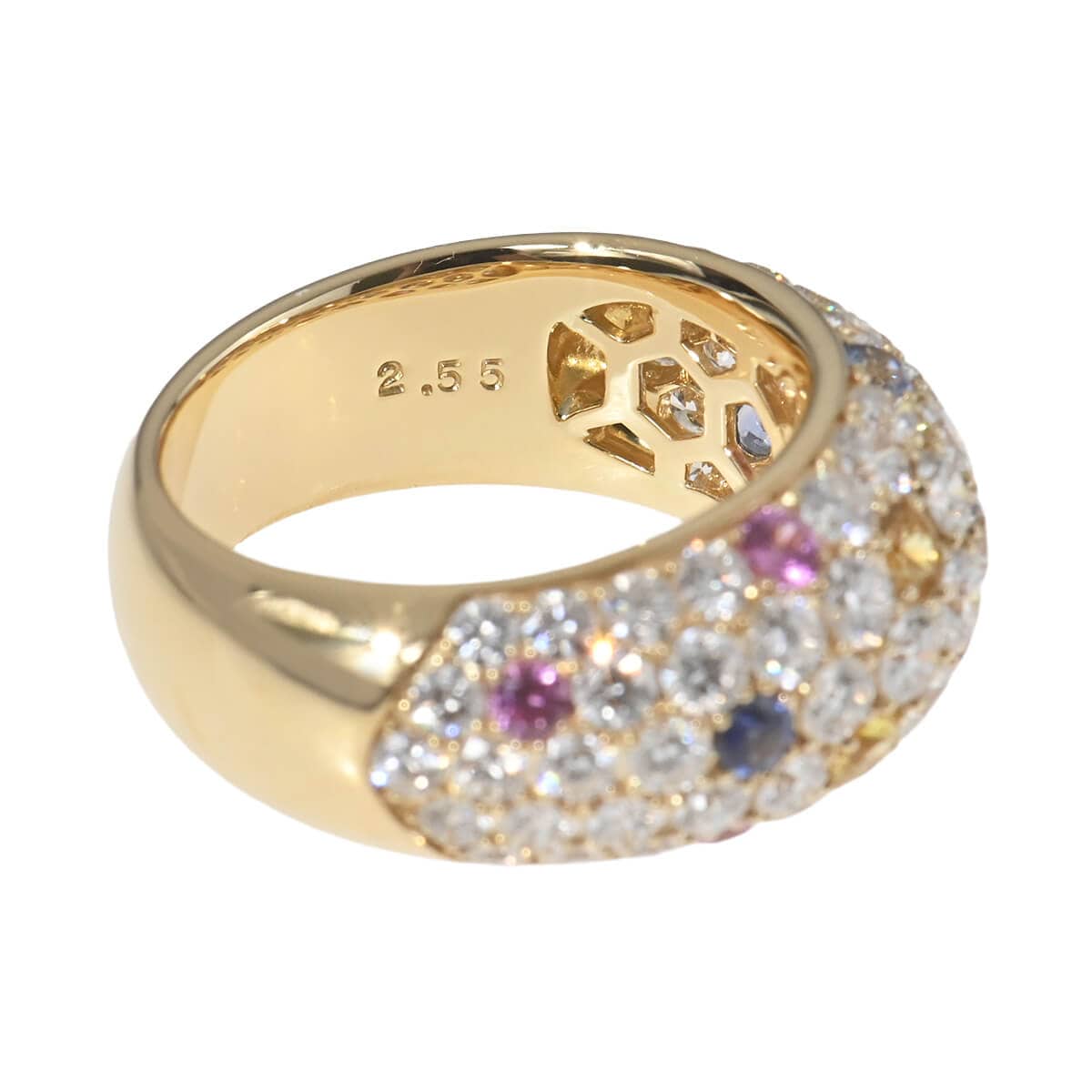 パール&ダイヤモンドジュエリーの未知なる世界を切り拓き、美しくそして大胆に、比類なき美意識をもって、身に纏うアートのようなモダンアートクリエイションを追求する日本発のラグジュアリージュエラー『TASAKI(タサキ)』。世界に誇る基準のハイクオリティ、繊細かつ革新的なクリエイティビティ、そして最高の素材を最高美のジュエリーへと昇華させる、磨き抜かれたクラフツマンシップをもつ、日本を代表するブランドのひとつです。ボリュームたっぷりの優美なフォルムのリングにダイヤモンドを敷き詰めて、さらに色とりどりのカラーサファイアを散りばめたイエローゴールド製リング。ダイヤモンドの大胆なきらめきと、イエロー、ブルー、ピンクのサファイアがエレガントで華やかなコントラストを魅せています。洗練された大人の個性と上質なストーンを楽しめる、美しく、優美で上質なハイジュエリーです。