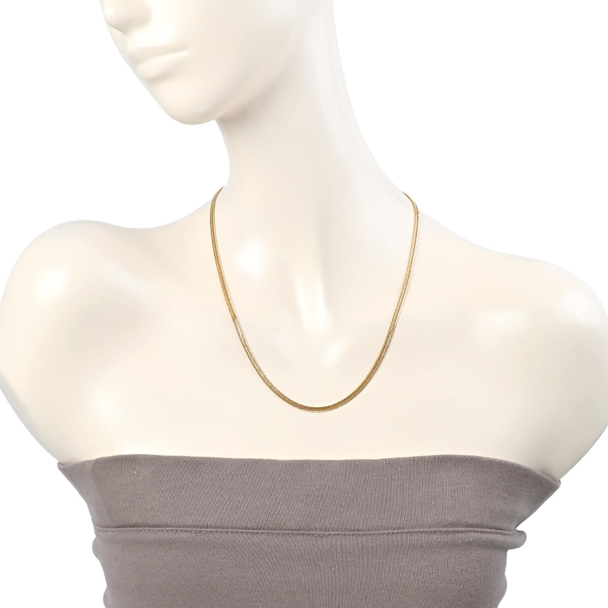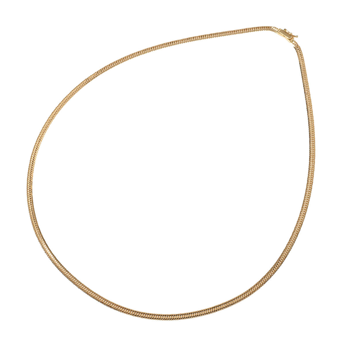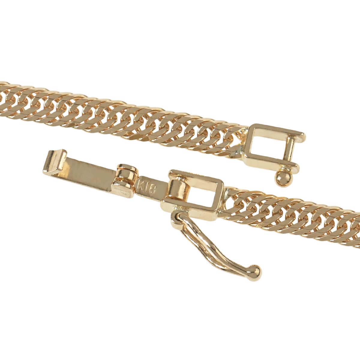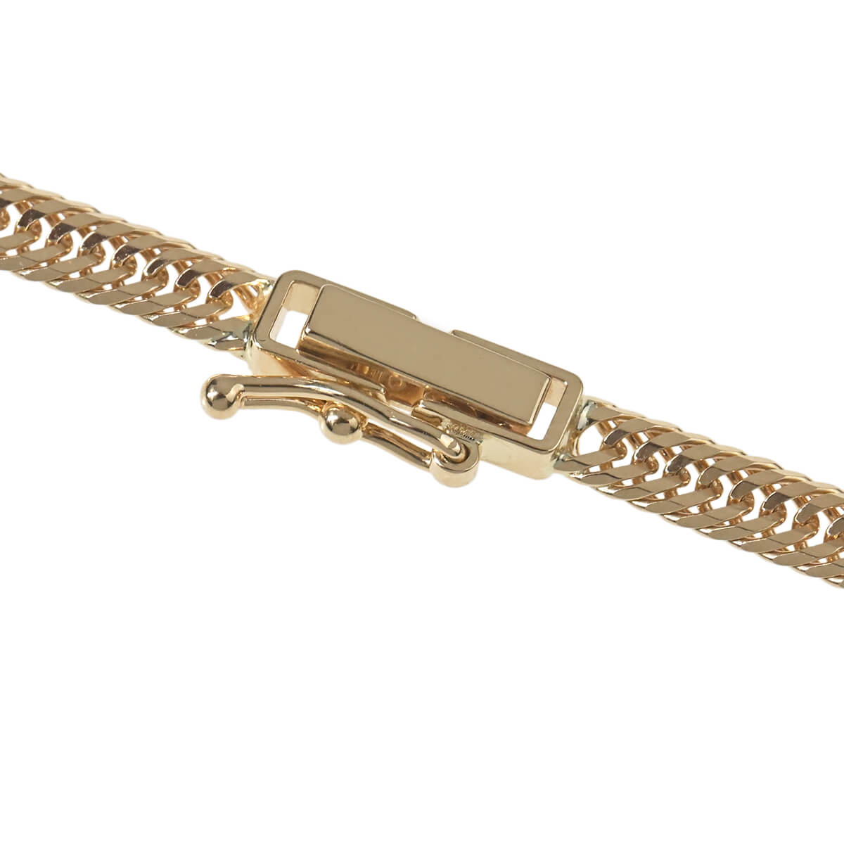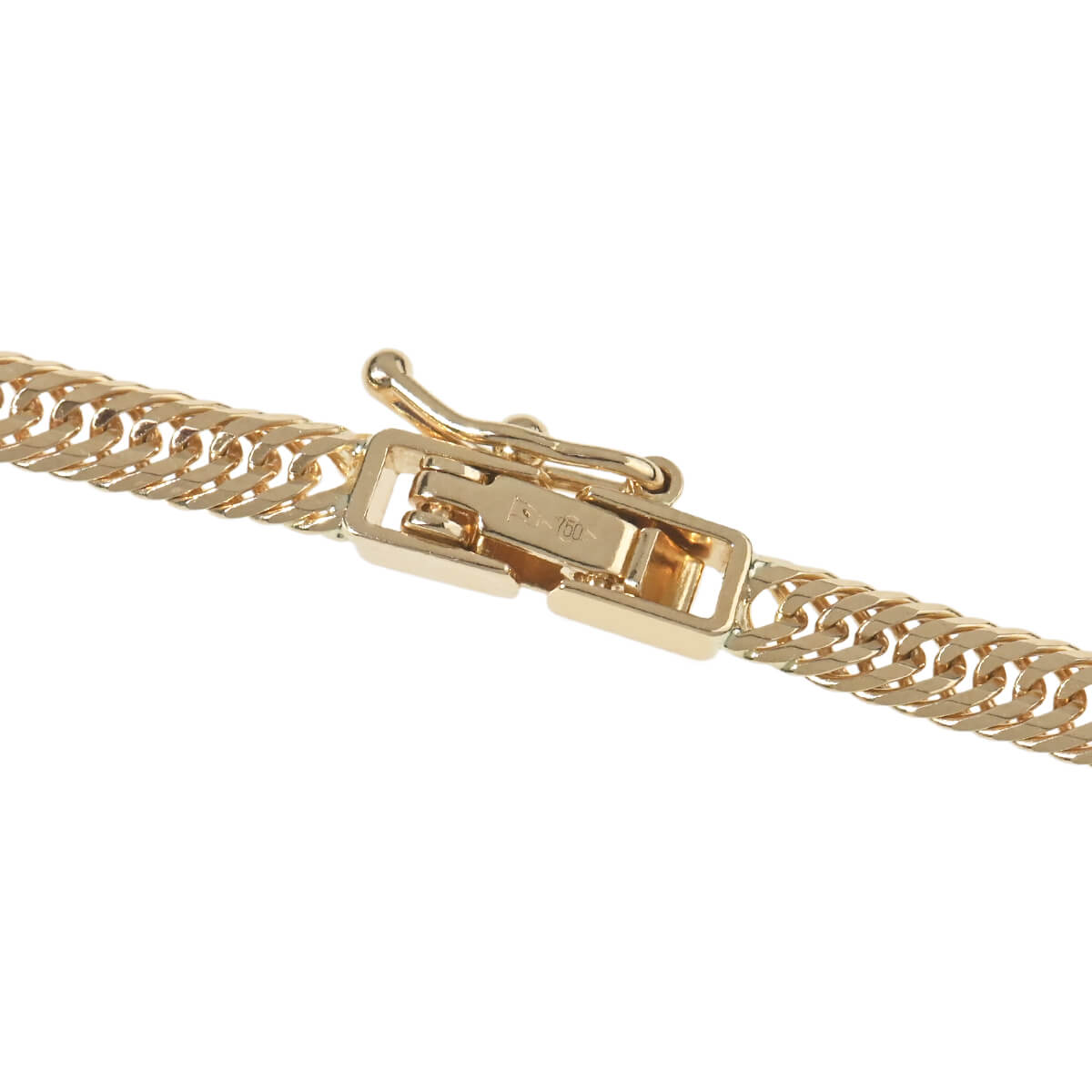 約50センチ、幅約3.3ミリ、重量約12グラムの、イエローゴールド製12面トリプルのキヘイチェーンネックレス。キヘイチェーンとは、あずき型のチェーンを90度ひねり、さらに押しつぶしたつくりのデザインチェーンのこと。押しつぶした面が綺麗に並んで同じ面を向き、連続していることによるなめらかな輝きが魅力のデザインチェーンです。カット面が多いほど輝きと華やかさが増し、面数が多いほど加工の手間がかかっており、価値があるとされるキヘイチェーン。12面カットが施されたコマが3コマずつ滑らかに繋がれた、コマの隙間がほとんどないデザインの重厚感ある12面トリプルキヘイチェーンは、胸元でキラキラと光を反射してこれ1本でも華やかな存在感を放ちます。資産価値にも注目されるキヘイは他のチェーンとは違い、単なる装飾品としてだけでなく身につける資産としても人気です。
