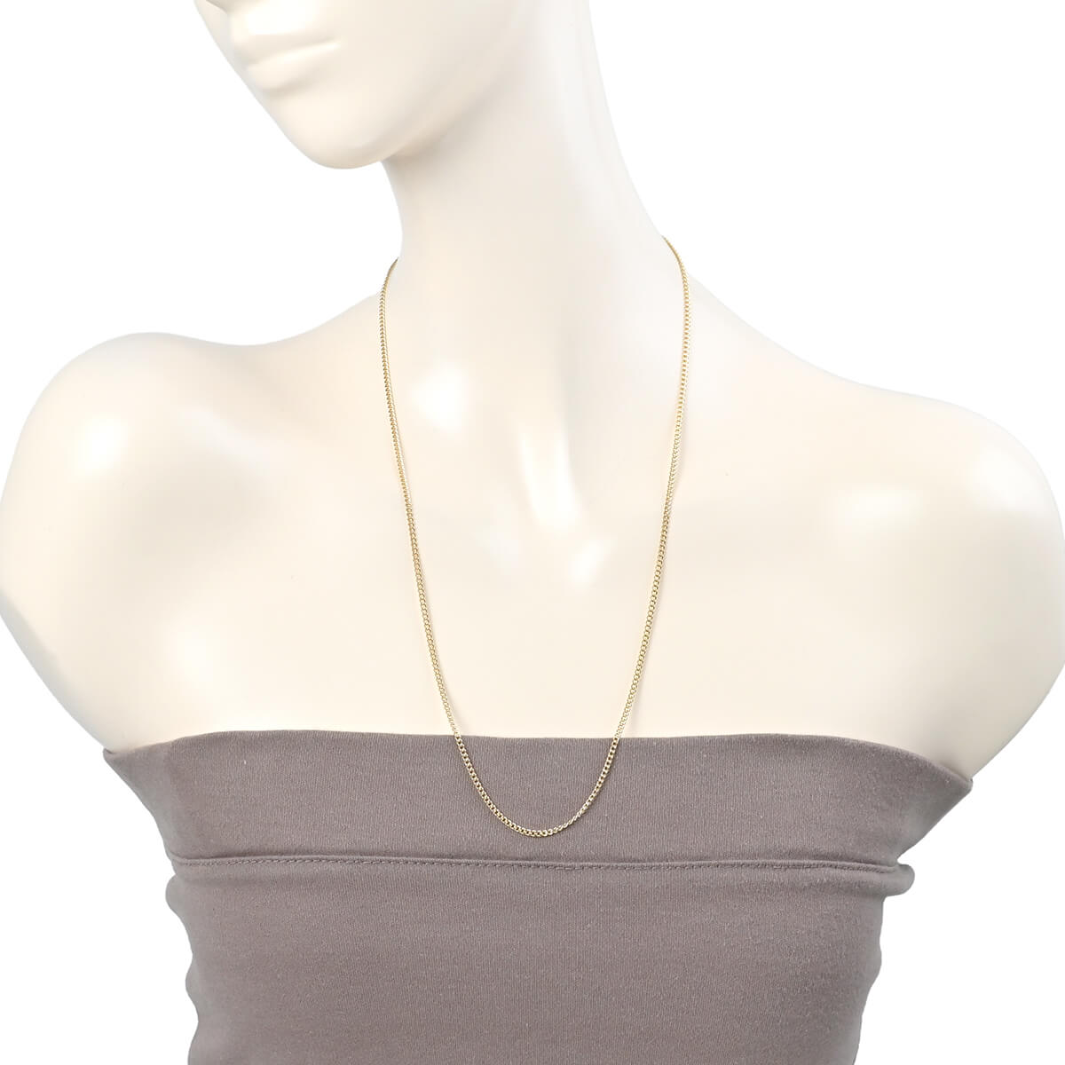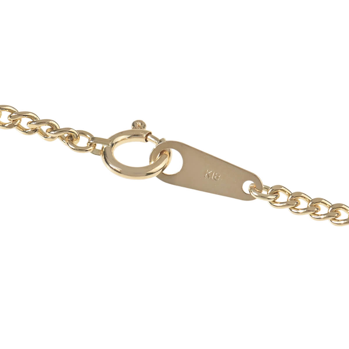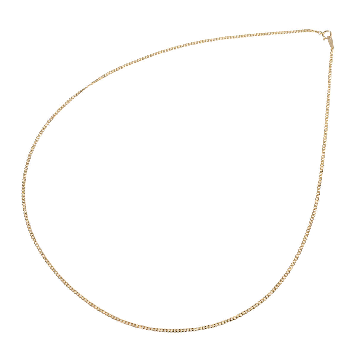 約50センチ、幅約2.5ミリ、約10グラムの、細めのイエローゴールド製2面シングルキヘイチェーンネックレス。キヘイチェーンとは、あずき型のチェーンを90度ひねり、さらに押しつぶしたつくりのデザインチェーンのこと。押しつぶした面が綺麗に並んで同じ面を向き、連続していることによるなめらかな輝きが魅力のデザインチェーンです。上下2平面にカットが施された2面シングルのキヘイチェーンは、カジュアルでスタンダードなデザイン。1本でつけるのはもちろん、ヘッドをとおしたり、レイヤードしたり、シンプルに使えるデザインが魅力。資産価値にも注目されるキヘイは他のチェーンとは違い、単なる装飾品としてだけでなく身につける資産としても人気です。
