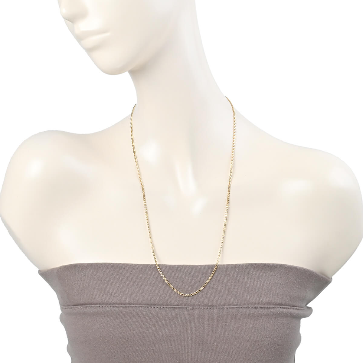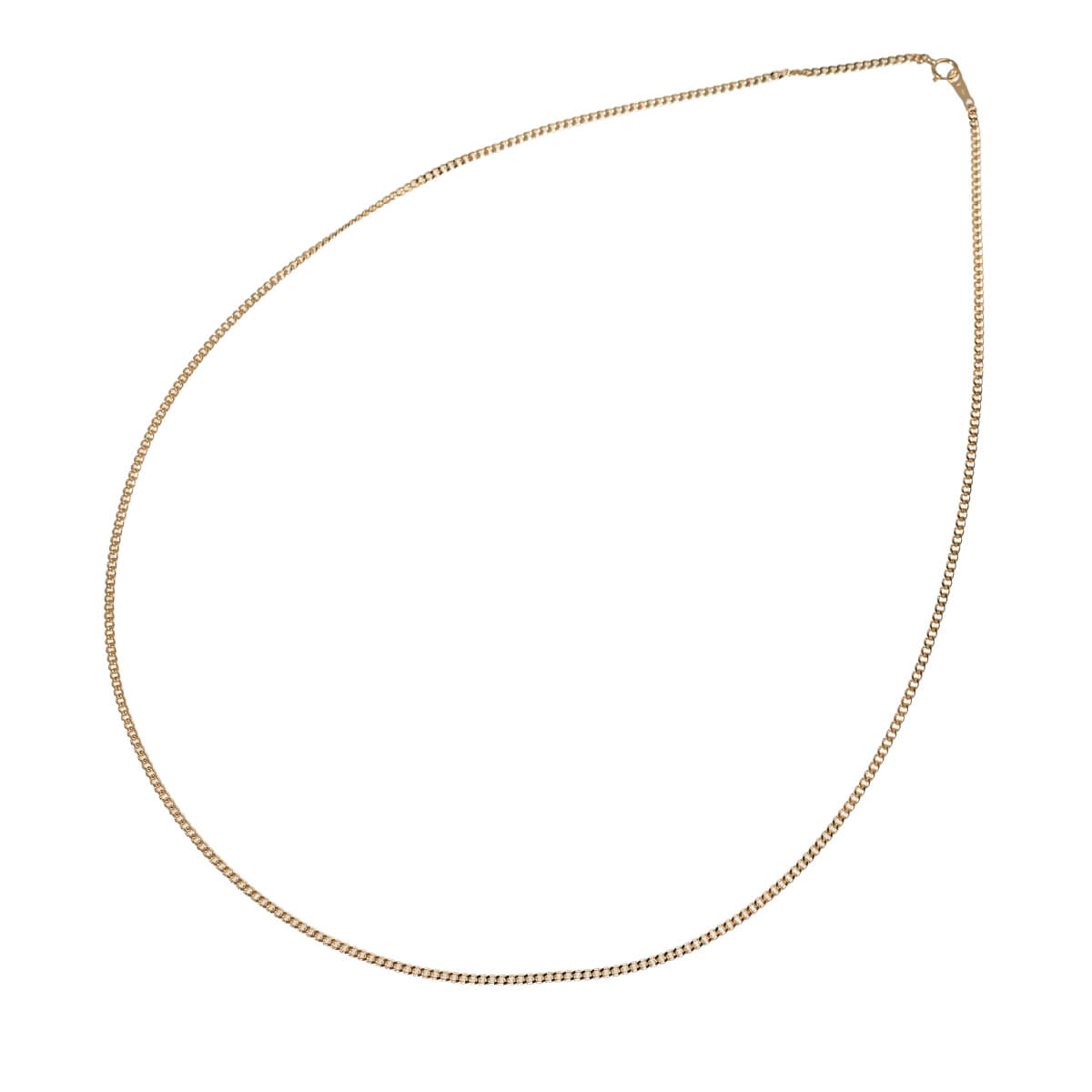約60センチ、幅約2.3ミリ、約10グラムの、細めのイエローゴールド製2面シングルキヘイチェーンネックレス。キヘイチェーンとは、あずき型のチェーンを90度ひねり、さらに押しつぶしたつくりのデザインチェーンのこと。押しつぶした面が綺麗に並んで同じ面を向き、連続していることによるなめらかな輝きが魅力のデザインチェーンです。上下2平面にカットが施された2面シングルのキヘイチェーンは、カジュアルでスタンダードなデザイン。1本でつけるのはもちろん、ヘッドをとおしたり、レイヤードしたり、シンプルに使えるデザインが魅力。資産価値にも注目されるキヘイは他のチェーンとは違い、単なる装飾品としてだけでなく身につける資産としても人気です。