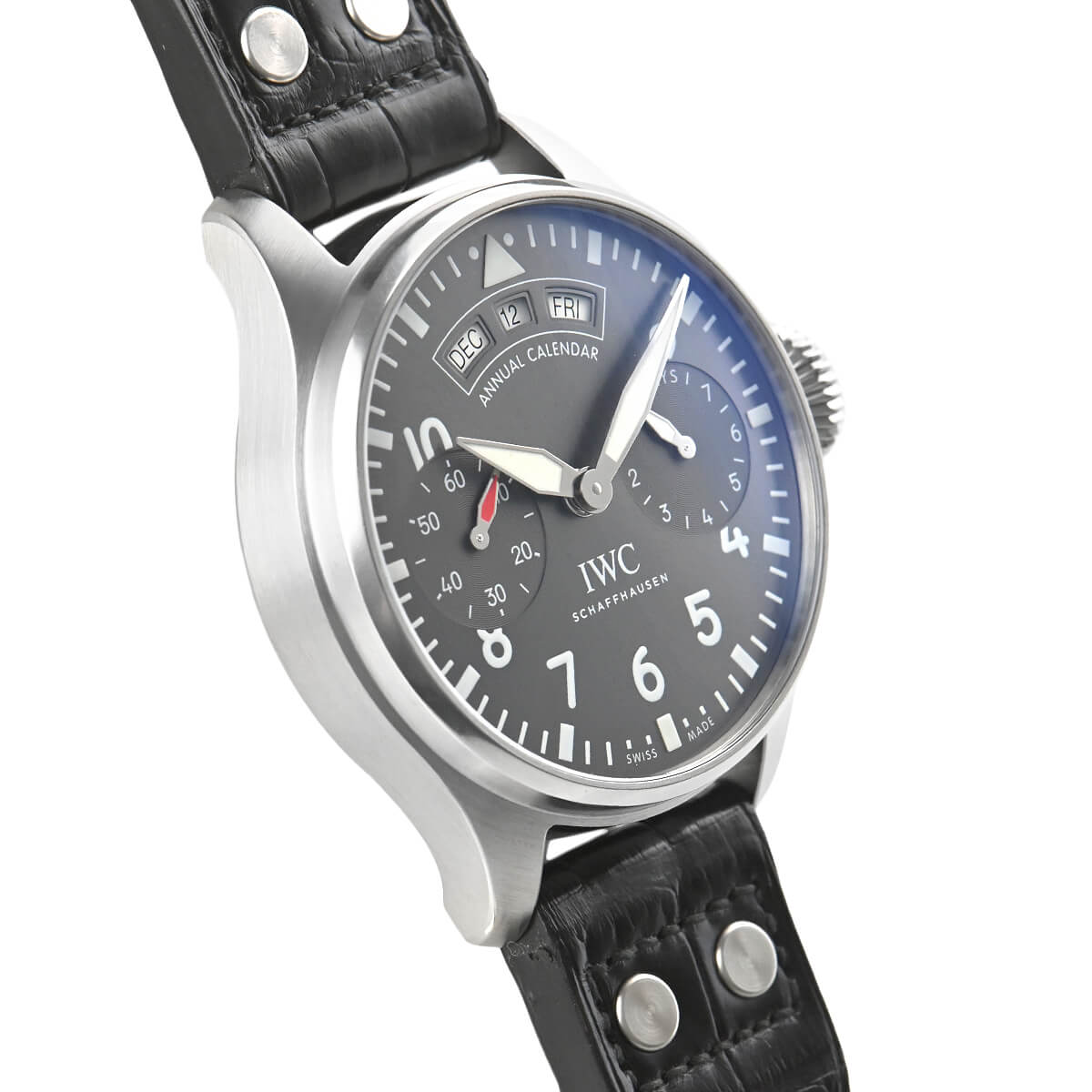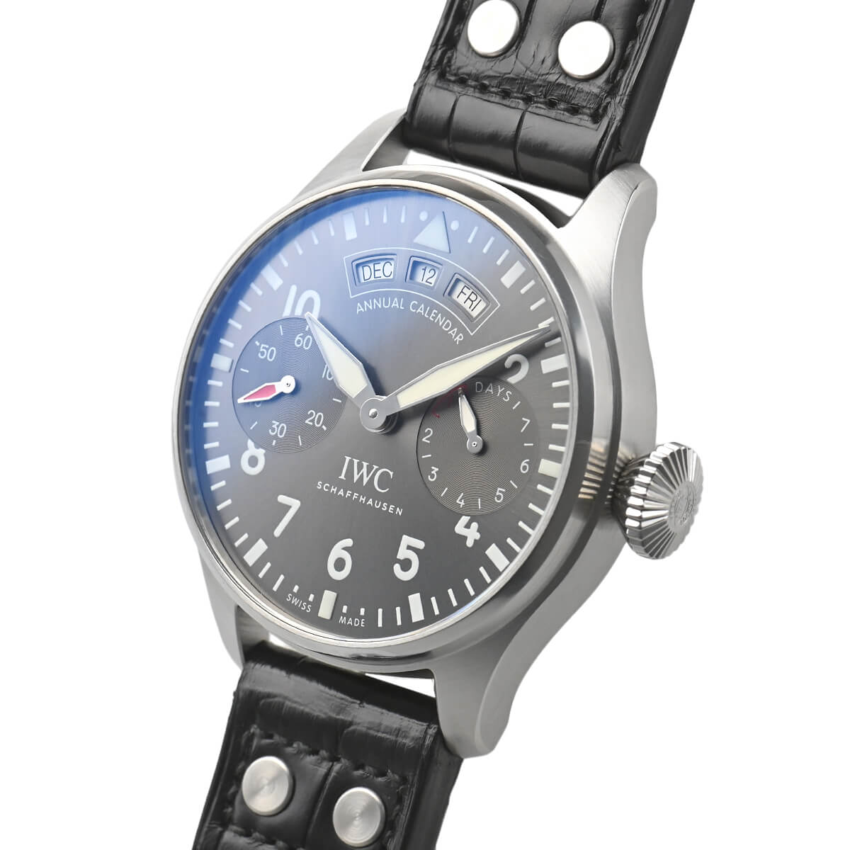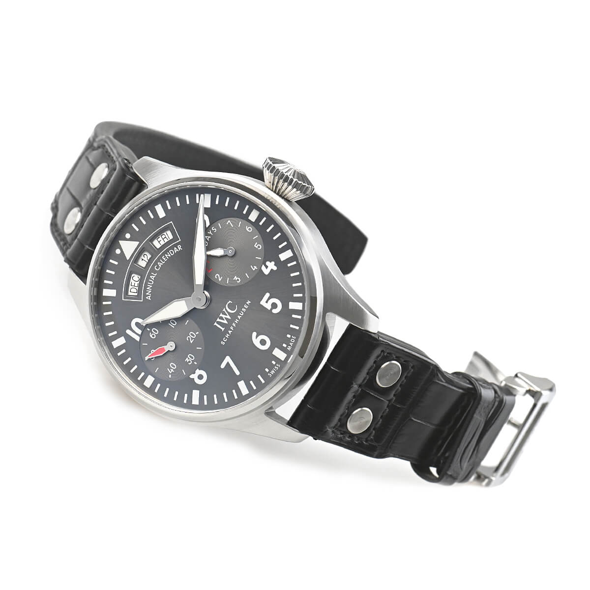第二次世界大戦時のドイツ空軍が採用したパイロットウォッチをモチーフに作られた「ビッグパイロットウォッチ」。こちらは大の月と小の月は自動で日付表示をおこない、一年間で唯一、2月の末にカレンダー調整が必要なアニュアルカレンダー機能を搭載した【ビッグパイロットウォッチ アニュアルカレンダー スピットファイア】です。