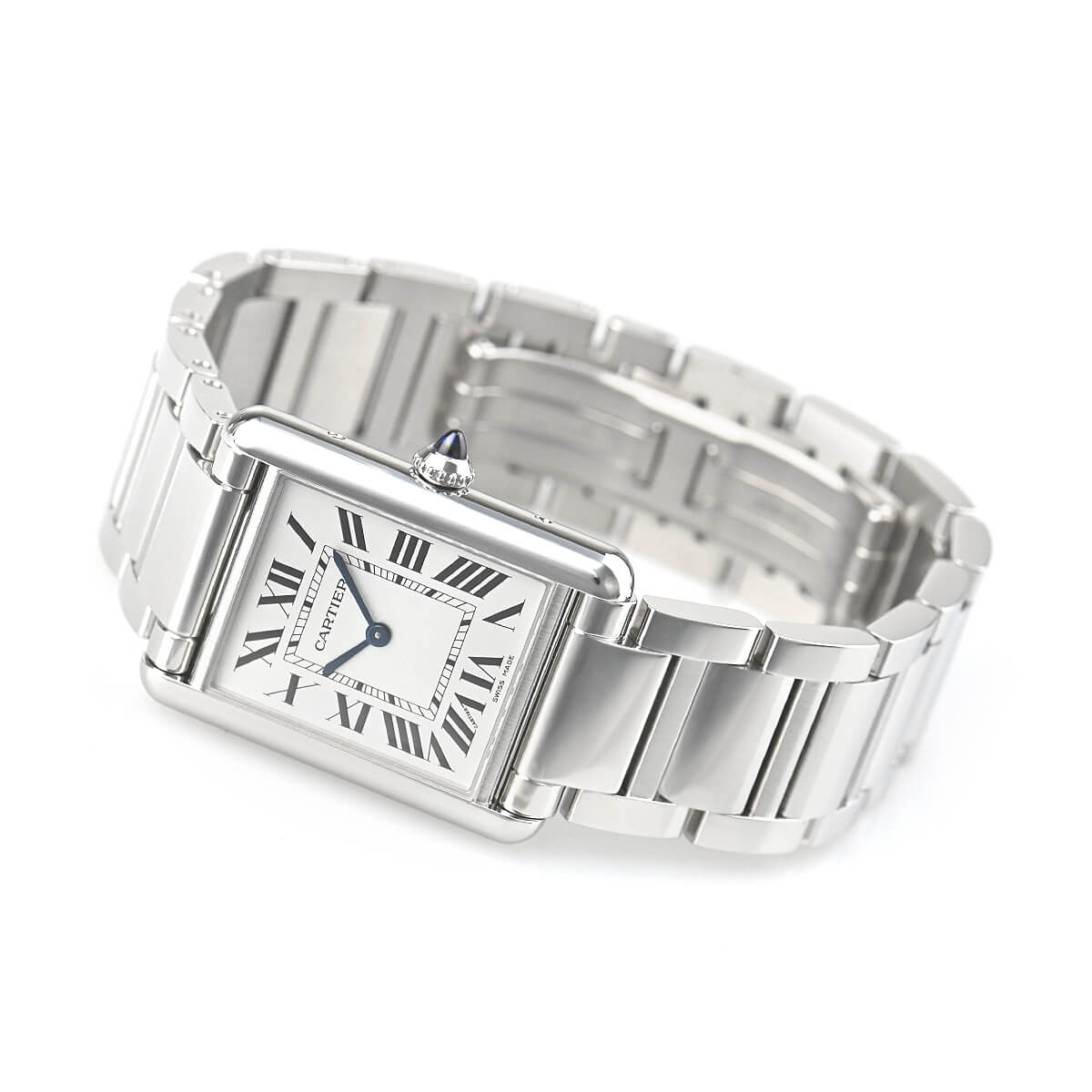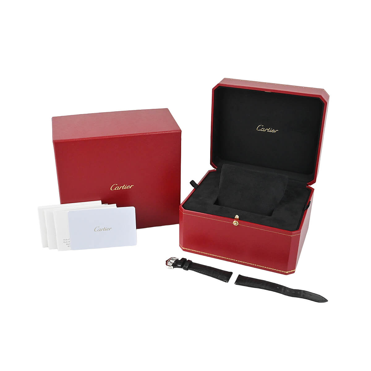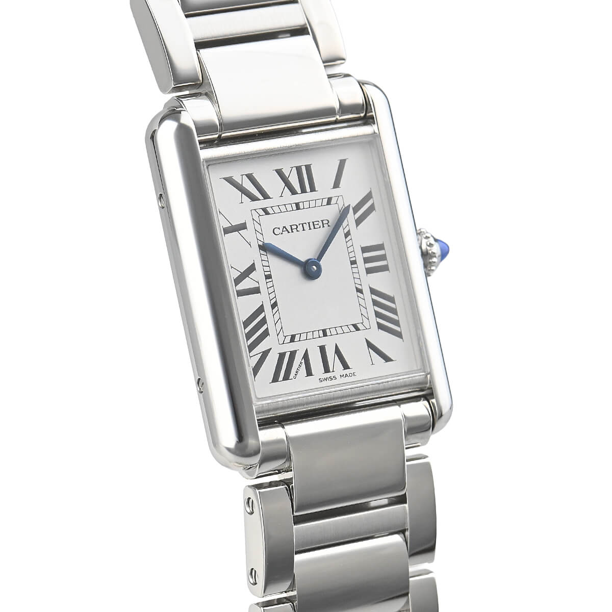 シンプルな美しさの中にブルースチールの針やローマンインデックスなどカルティエらしさに溢れています。
