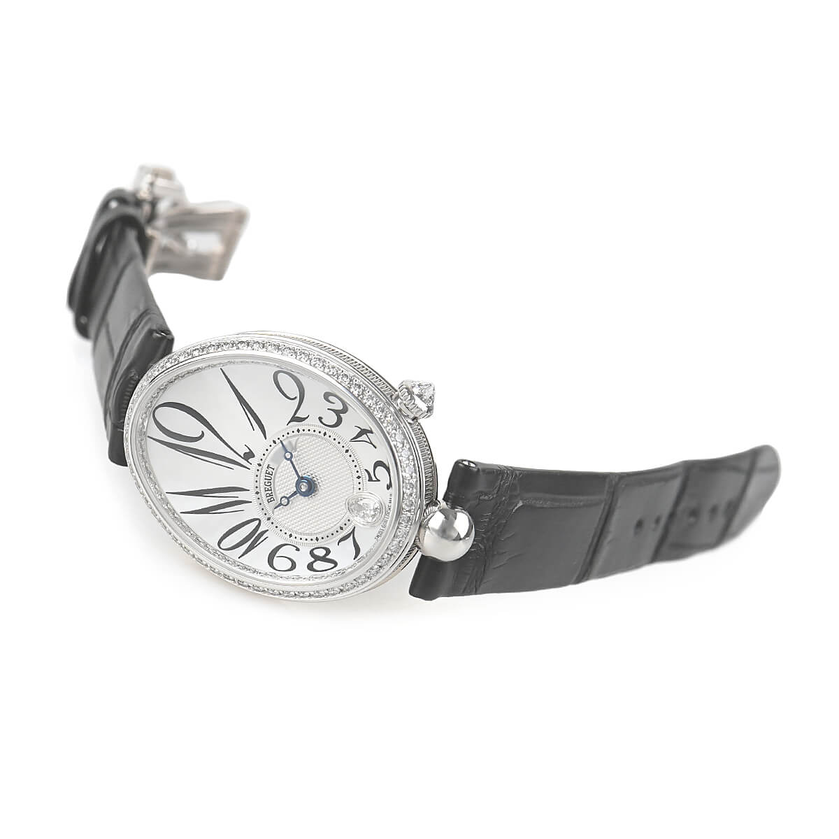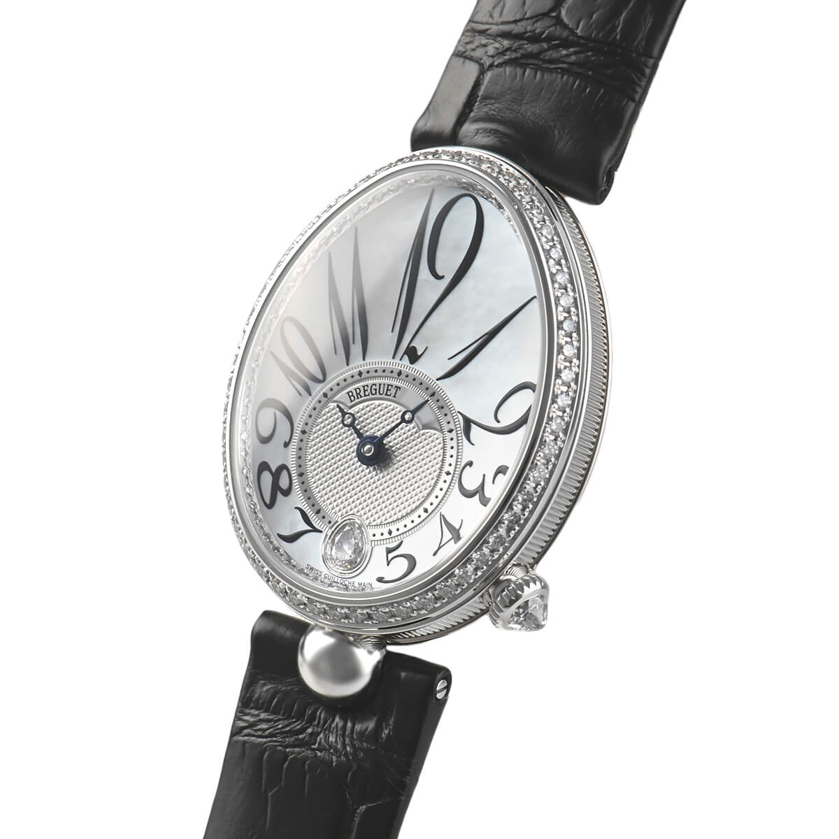 文字盤の6時位置だけでなく、ベゼルやフランジにもダイヤセッティングを施しており、時計が貴族のための特別なものだった時代の雰囲気を今に伝えています。