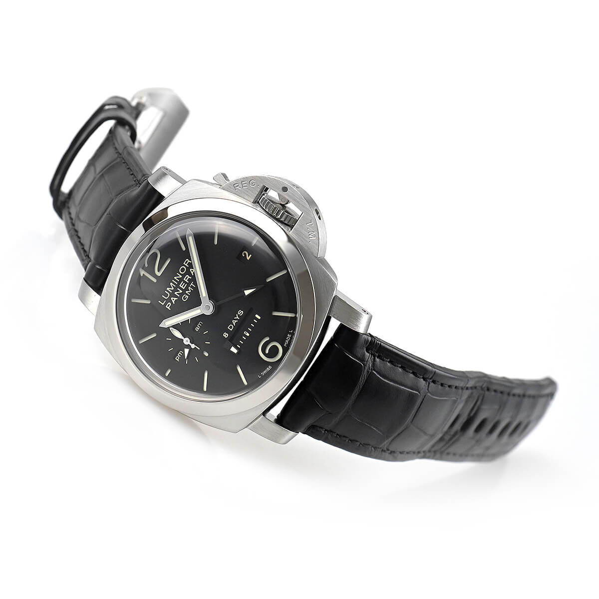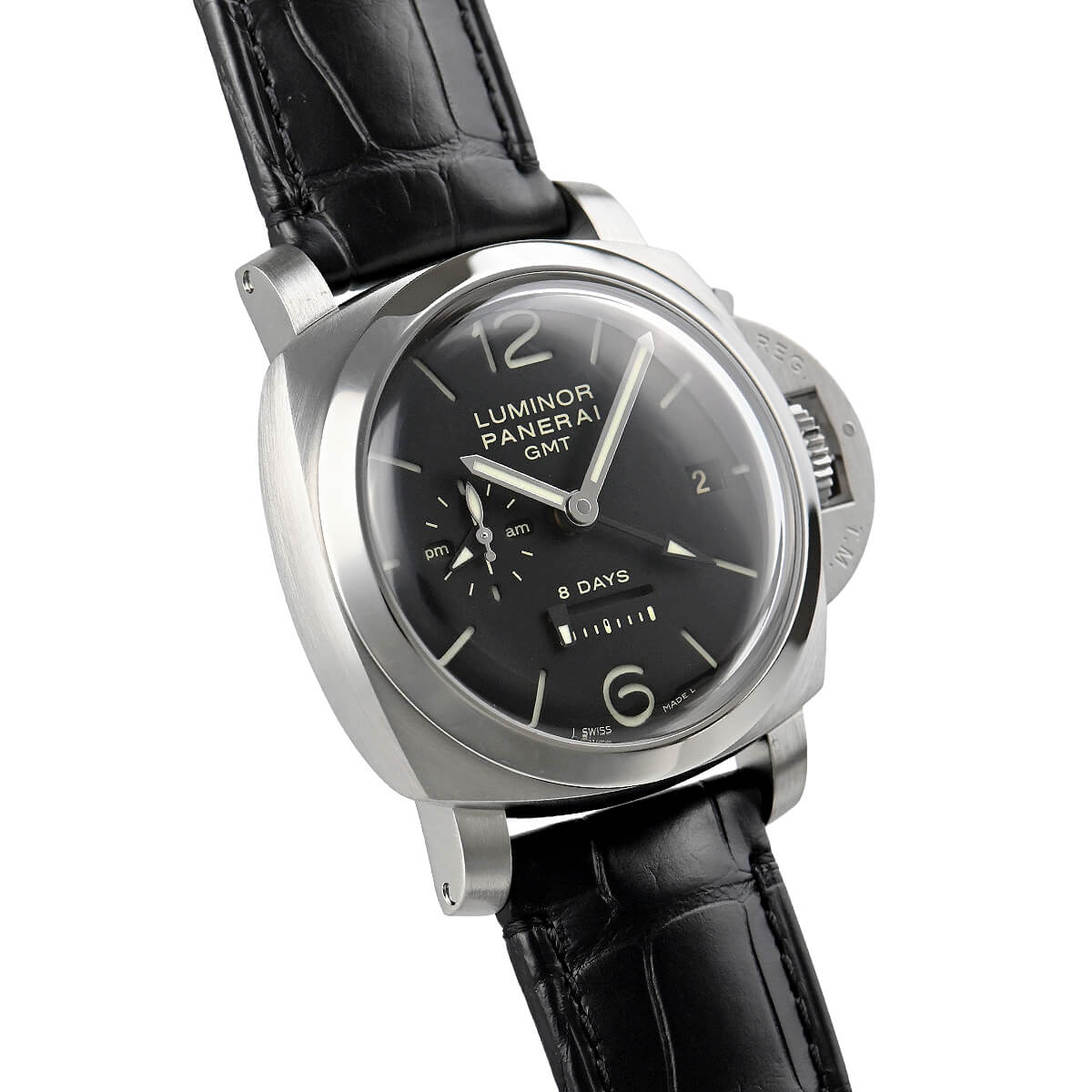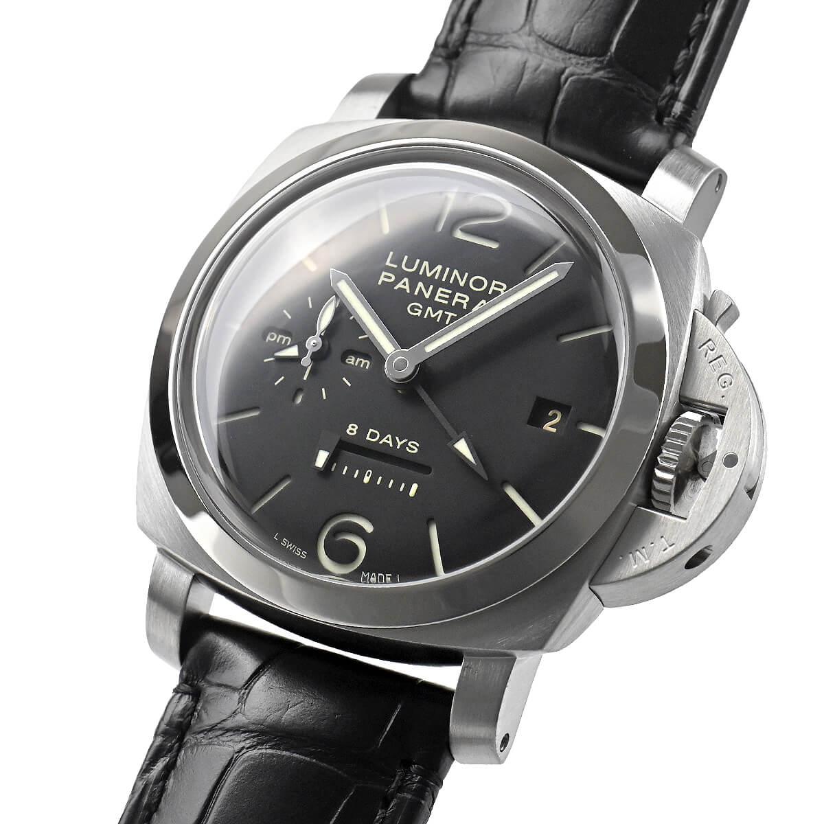 R番“2015年製”【PAM00233】ルミノール1950 8デイズGMTが入荷しました。横移動式のパワーリザーブ表示を可能とした、パネライムーブメントのCal.2002を搭載。
