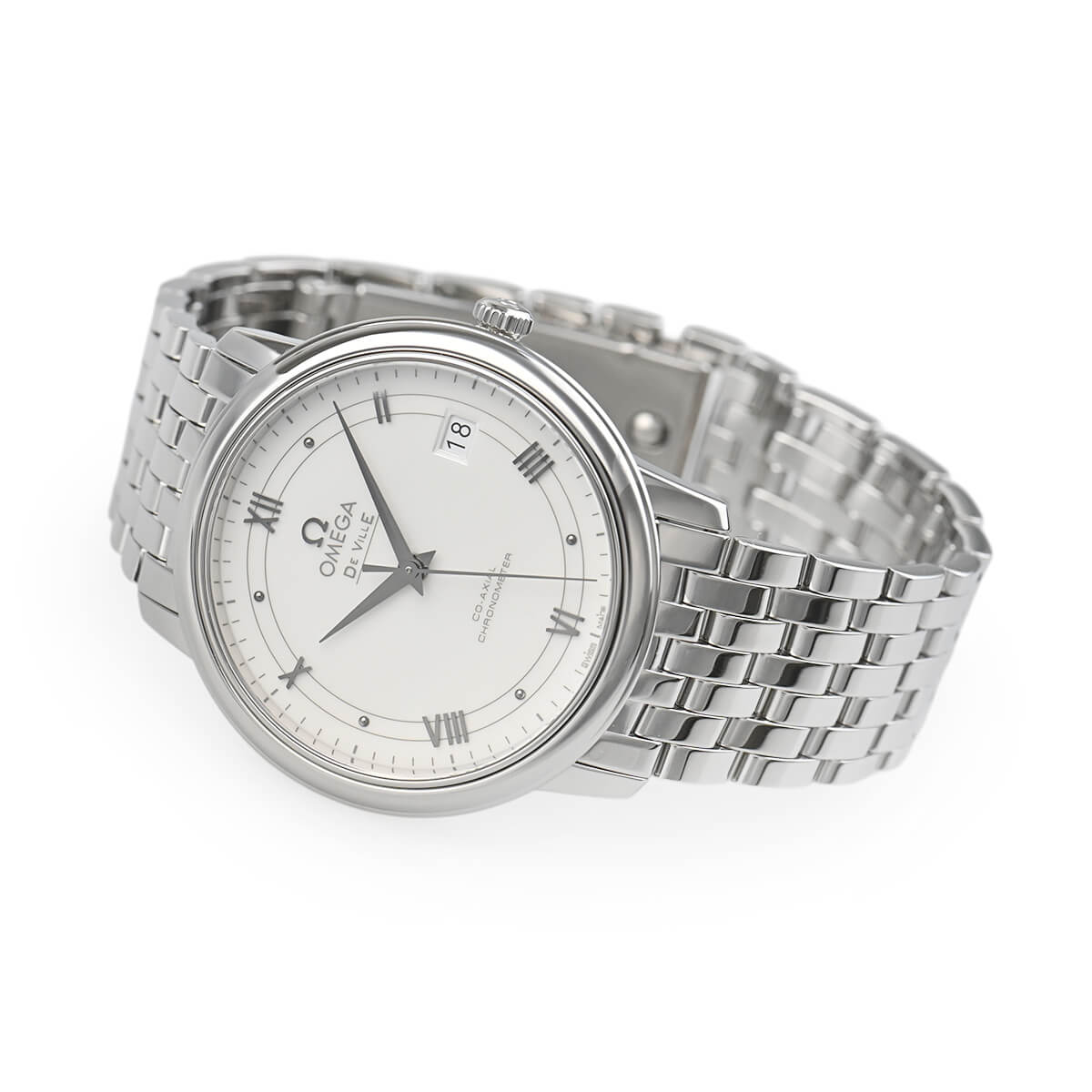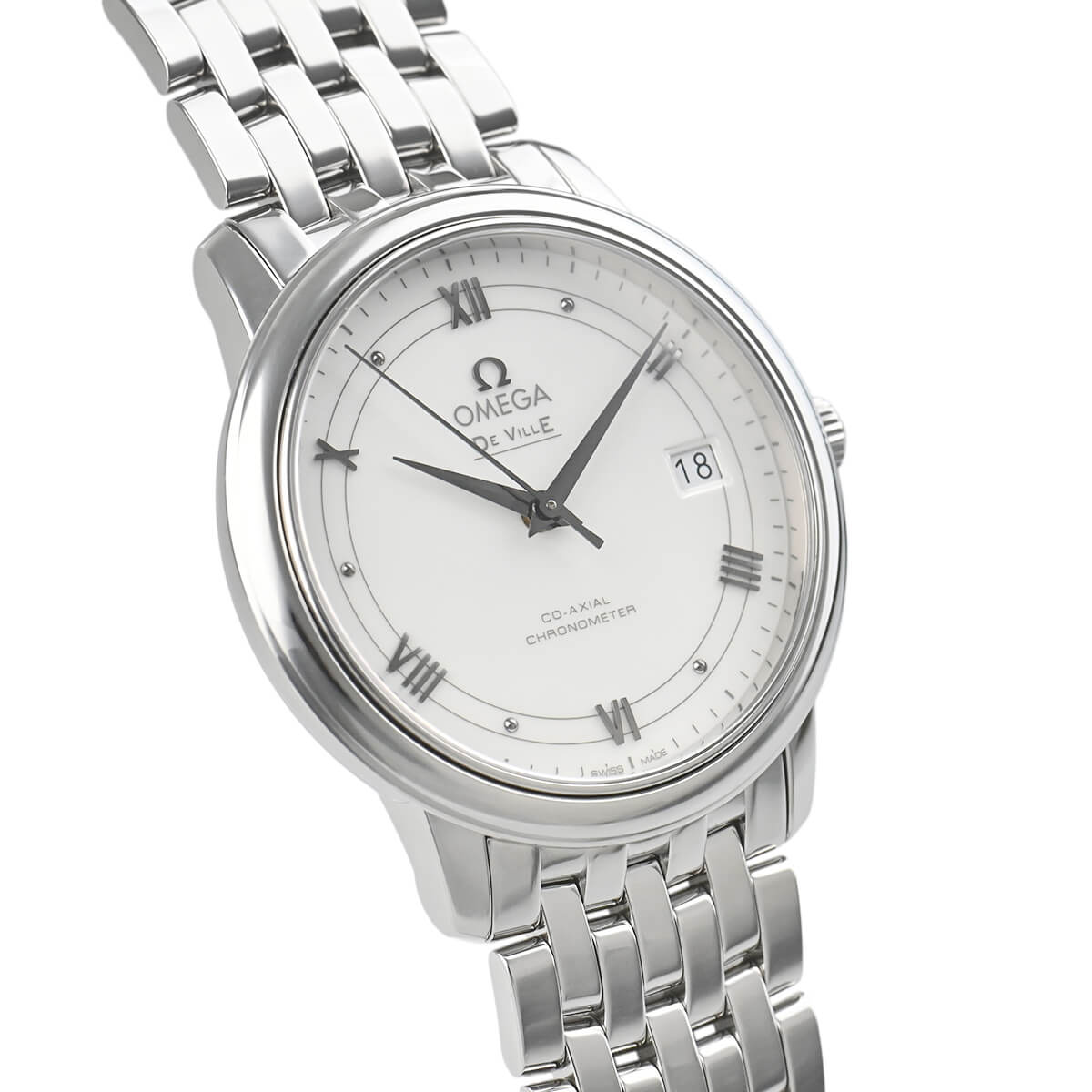 オーソドックスなデザインの「デ・ヴィル プレステージ」。こちらはオメガが誇るコーアクシャルエスケープメントを搭載した自動巻きモデルです。