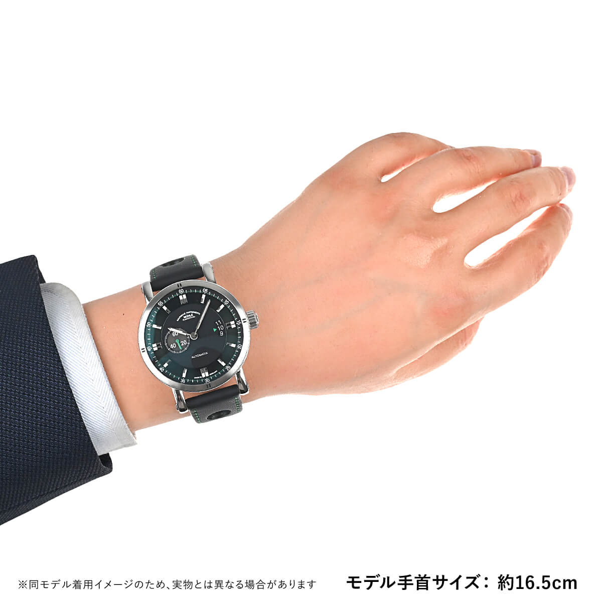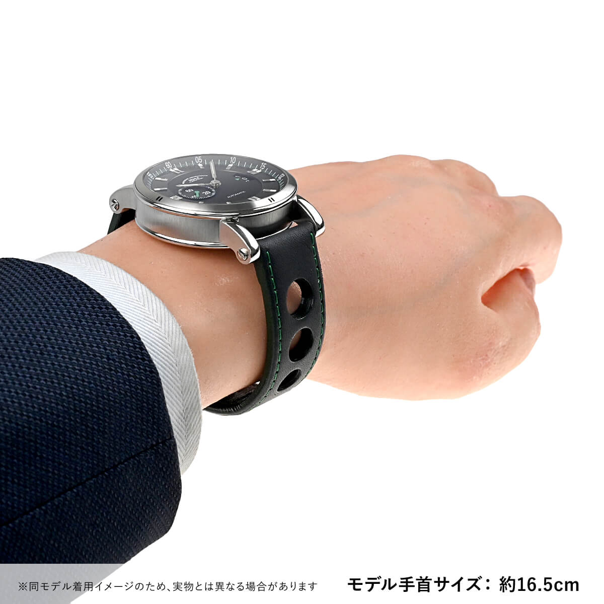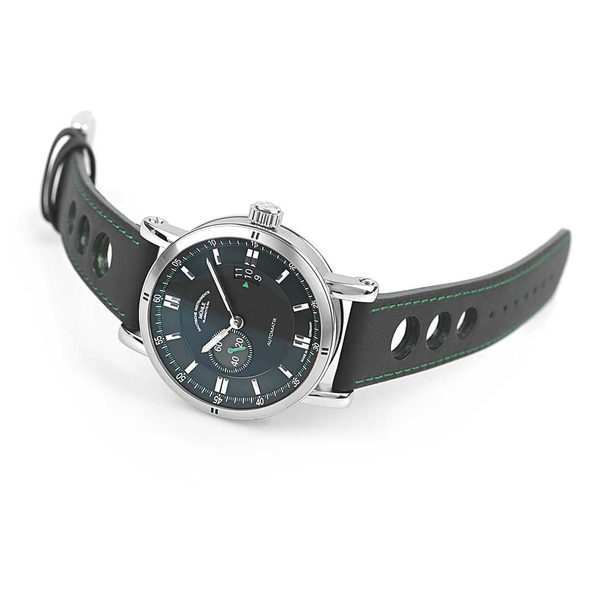 視認性の良い文字盤にグリーン色のアクセントとパンチングされたカーフストラップのステッチの色を合わせ