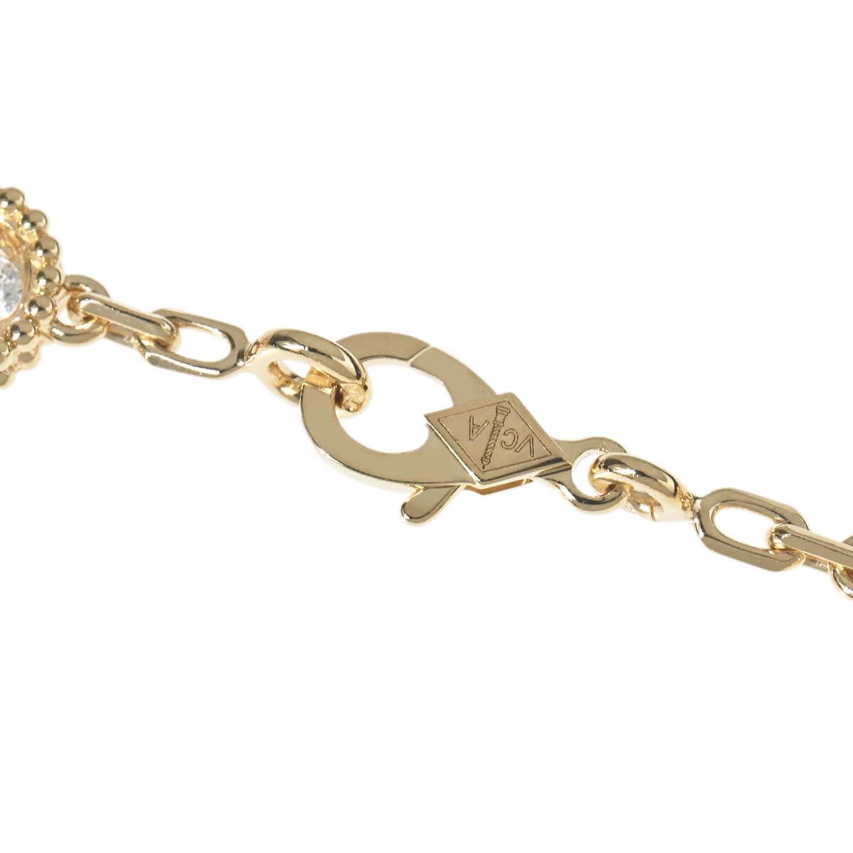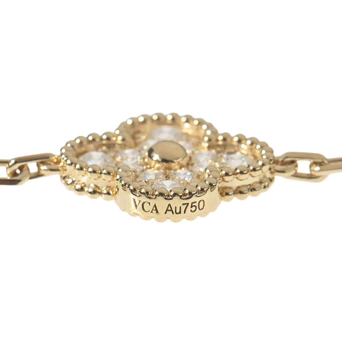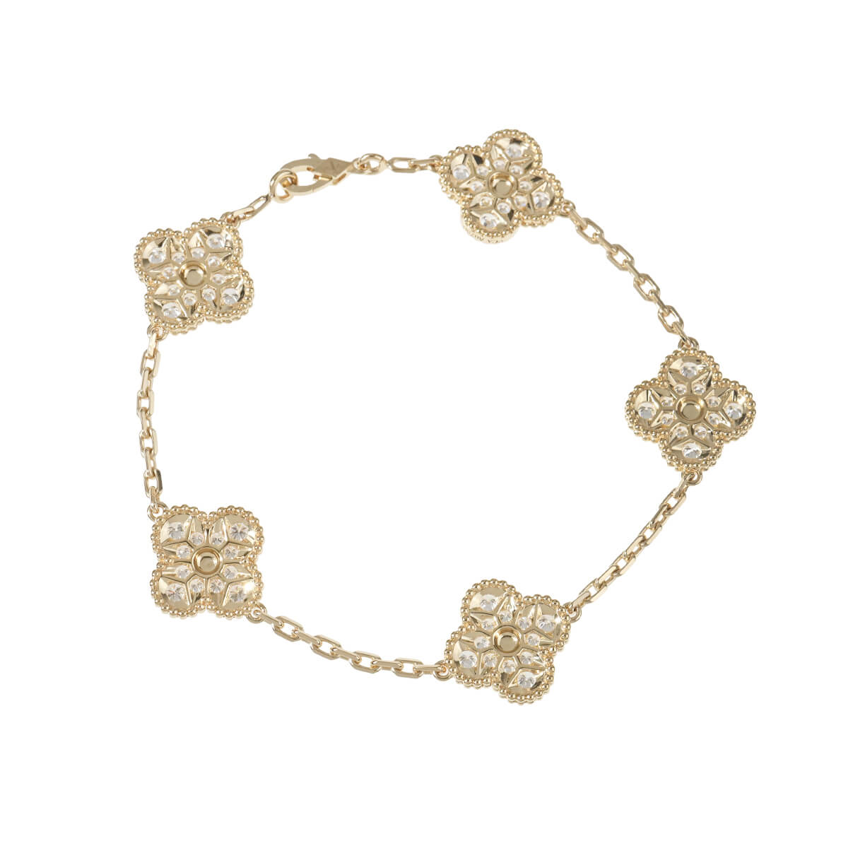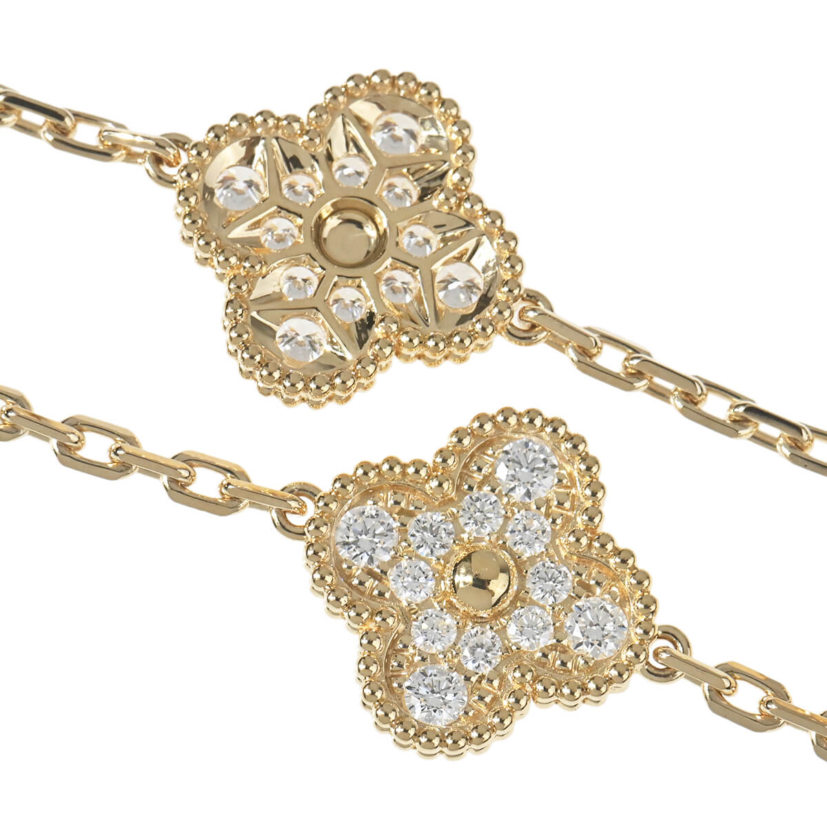 1968年に初めて誕生した幸運のシンボル「アルハンブラ」の特徴を受け継ぎ、『VanCleef&Arpels(ヴァンクリーフ&アーペル)』ならではの独創性と時を超えるエレガンスを湛える「ヴィンテージアルハンブラ」コレクション。極上の煌めきを放つダイヤモンドの煌めきをまとった喜びに満ちた幸運のモチーフが5つ連なり、ひときわ目を引く存在感を放つ「ヴィンテージアルハンブラ」イエローゴールド製ブレスレットです。定番コレクションながら定番モデルとは一線を画す、このうえなくエレガントで優美なブレスレットは、身に着けるだけで特別な気分に。愛らしいゴールドビーズに縁どられた四つ葉のクローバーに着想を得た幸運のシンボルが、デコルテで圧倒的な存在感を放ちます。たくさんつけてもしつこくなく、むしろ“素敵”にまとまる、不思議な個性をもつアルハンブラはコレクションで揃えていって、バリエーションを魅せるのも楽しいですね。
