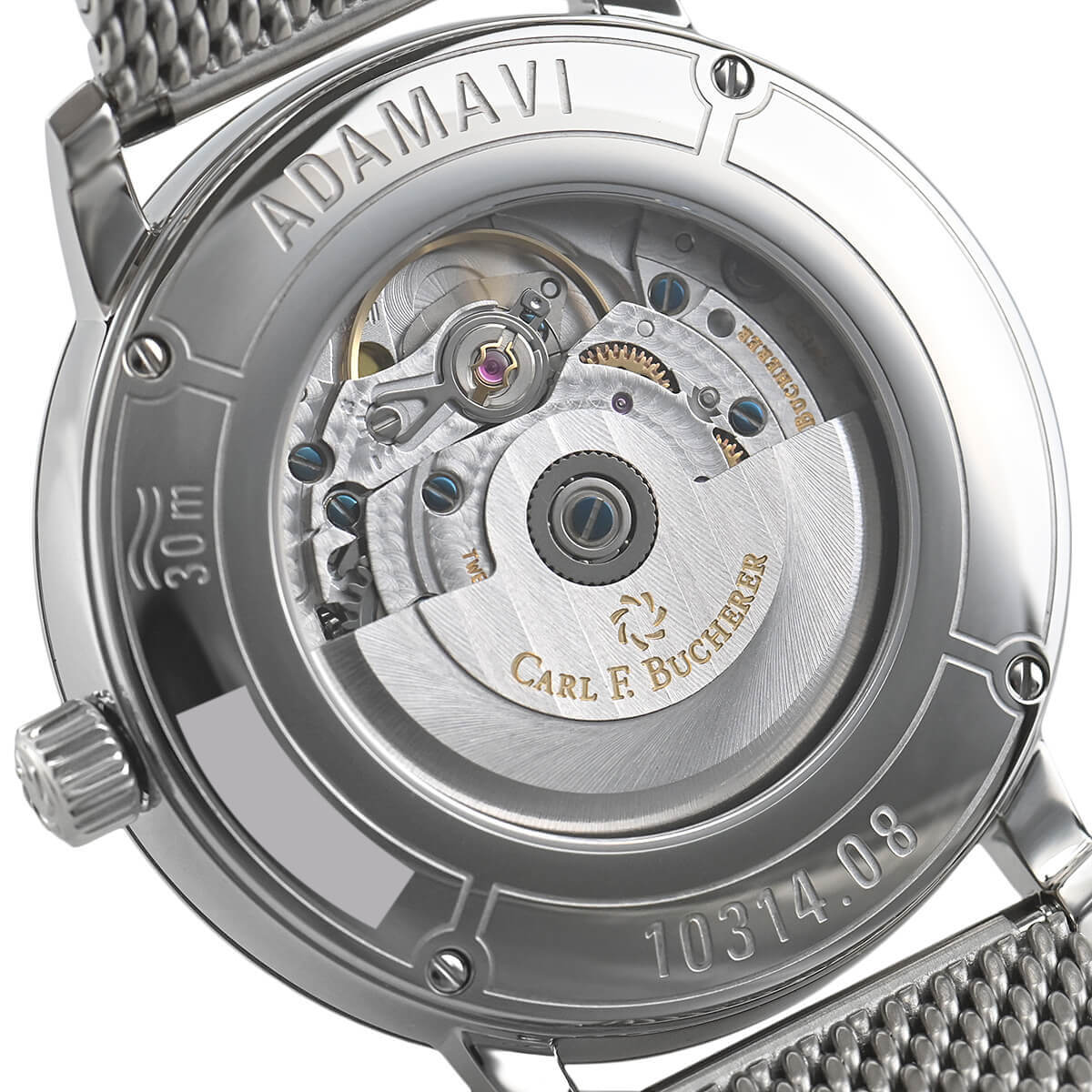 ラテン語で“好きになる”“喜びを覚える”を意味する「アダマレ」から名が付けられた「アダマビ」。シンプルな中三針のモデルですが、ミラネーゼブレスレットと組み合わせることで個性を演出しています。