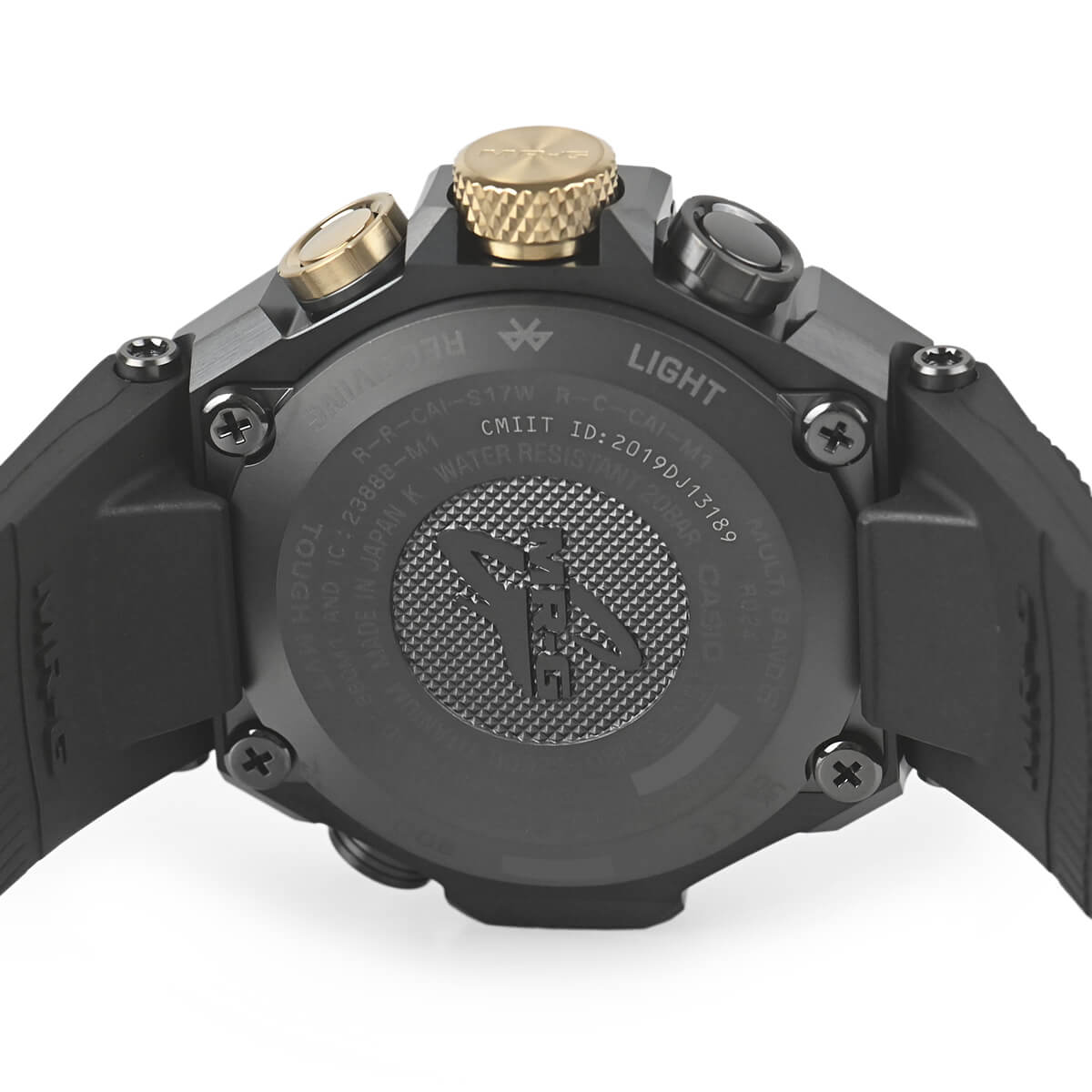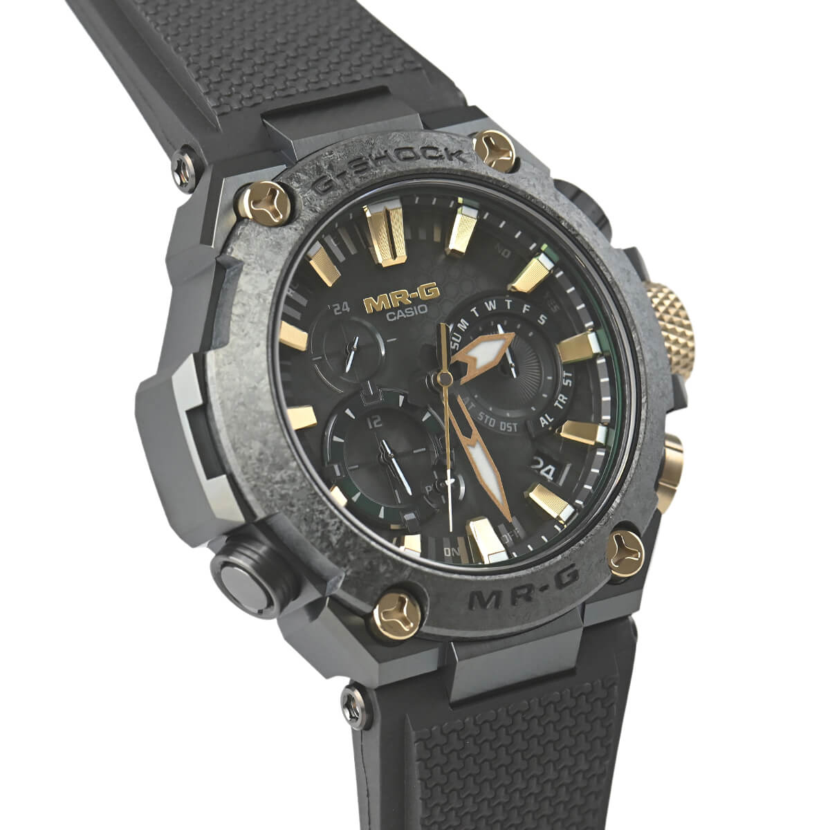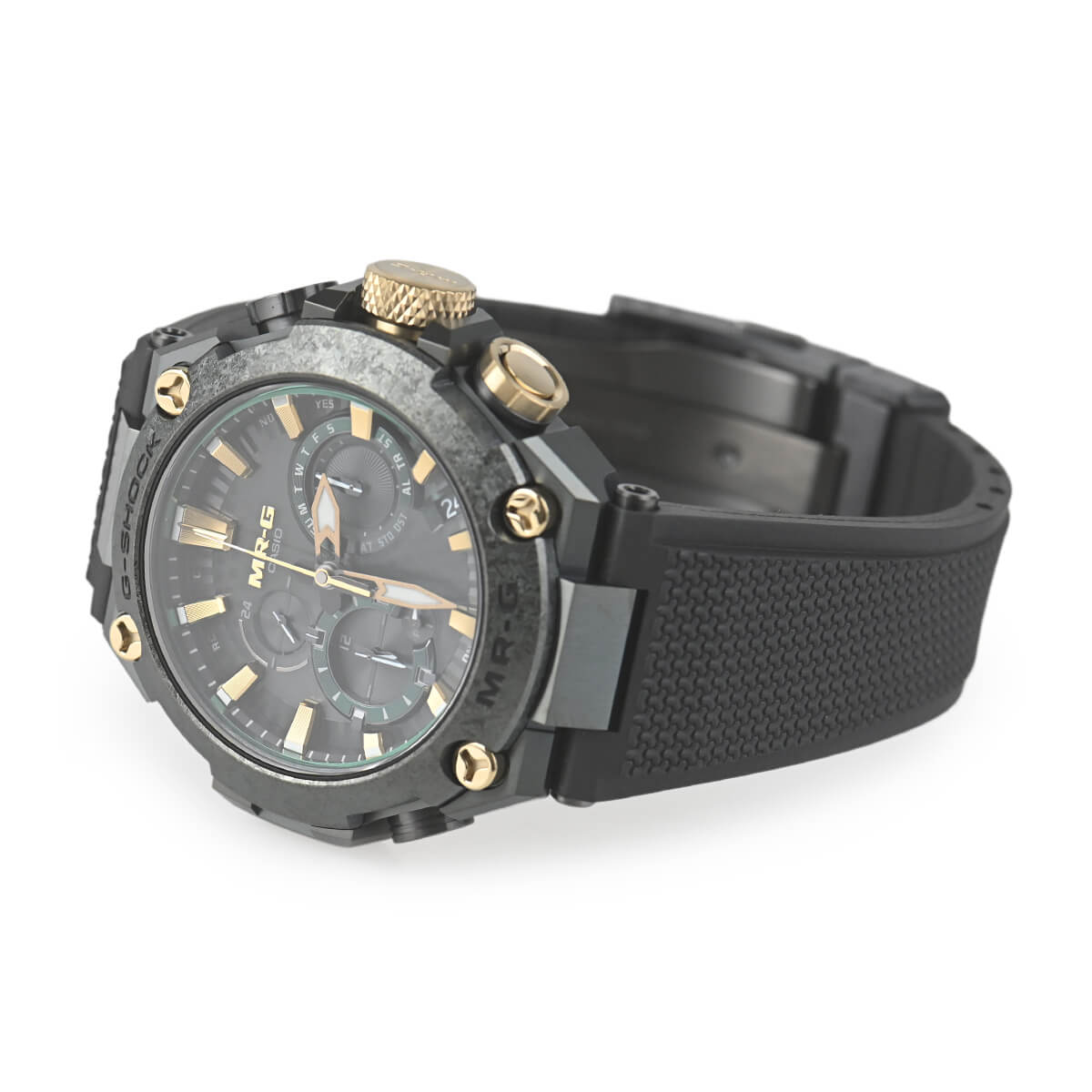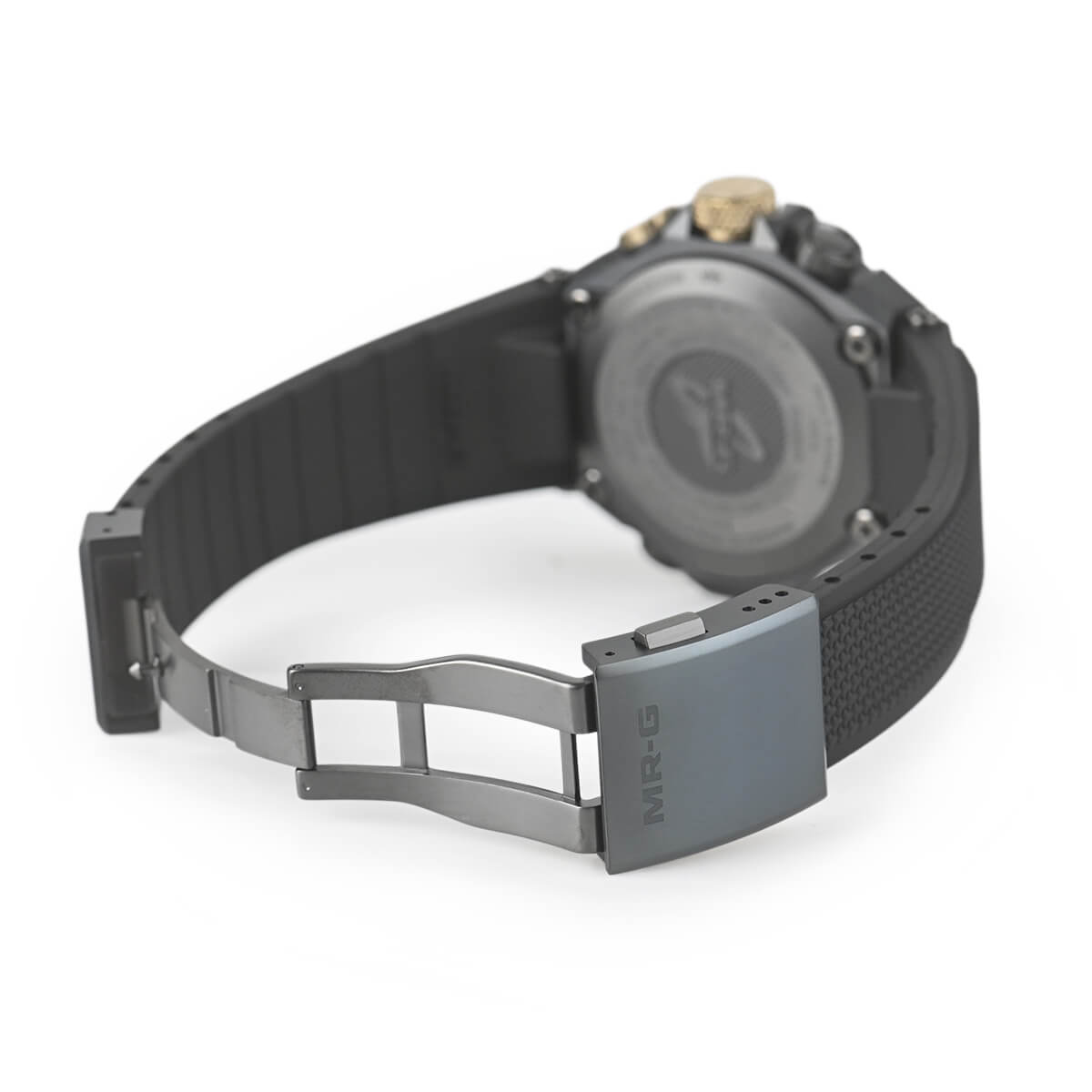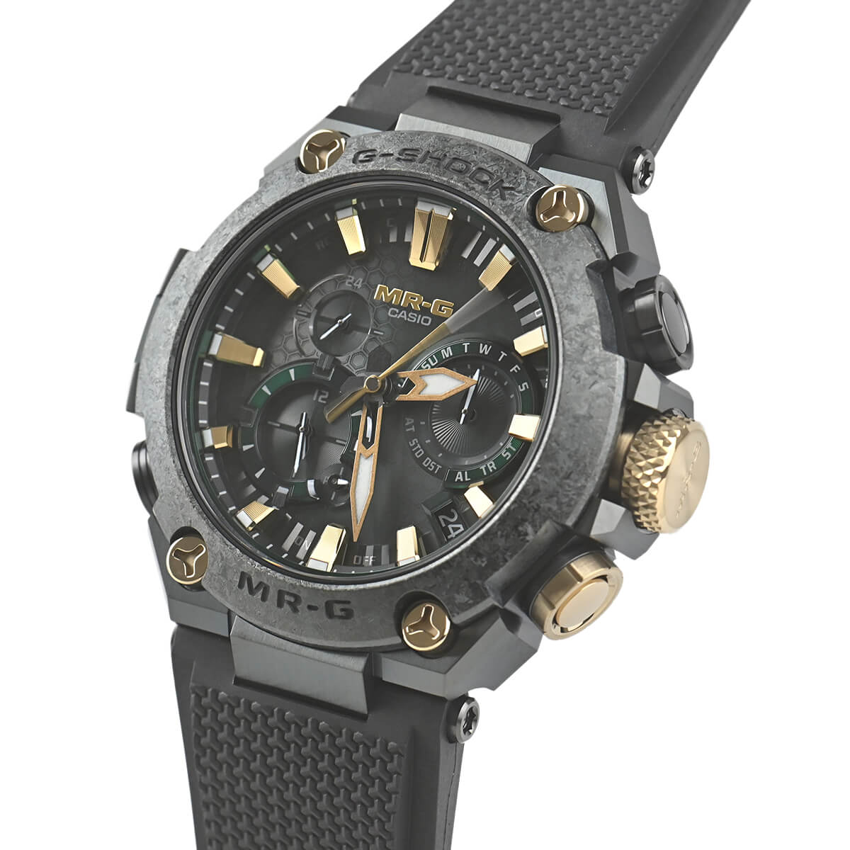 G-SHOCK最上級ラインのMR-Gシリーズ。日本の伝統色「鐵色(くろがねいろ)」をテーマに、甲冑の素材である鉄を熱した際に現れる深い青緑色を、深層硬化処理とグリーンDLCコーティングを施したチタン外装で表現。