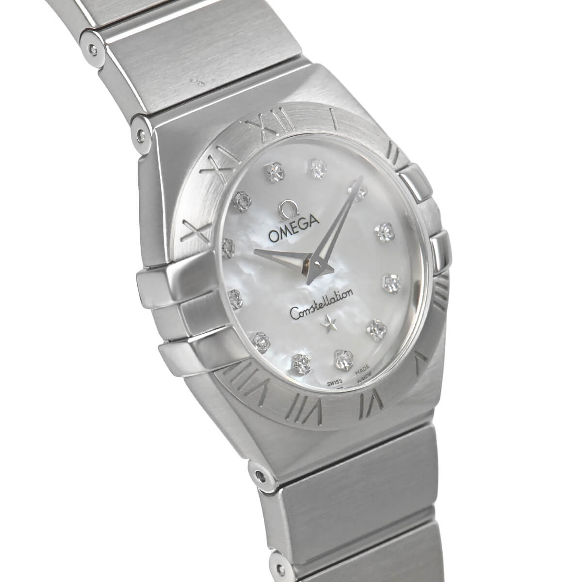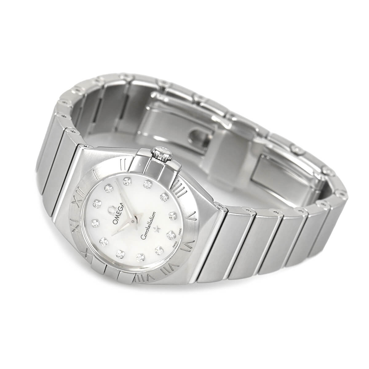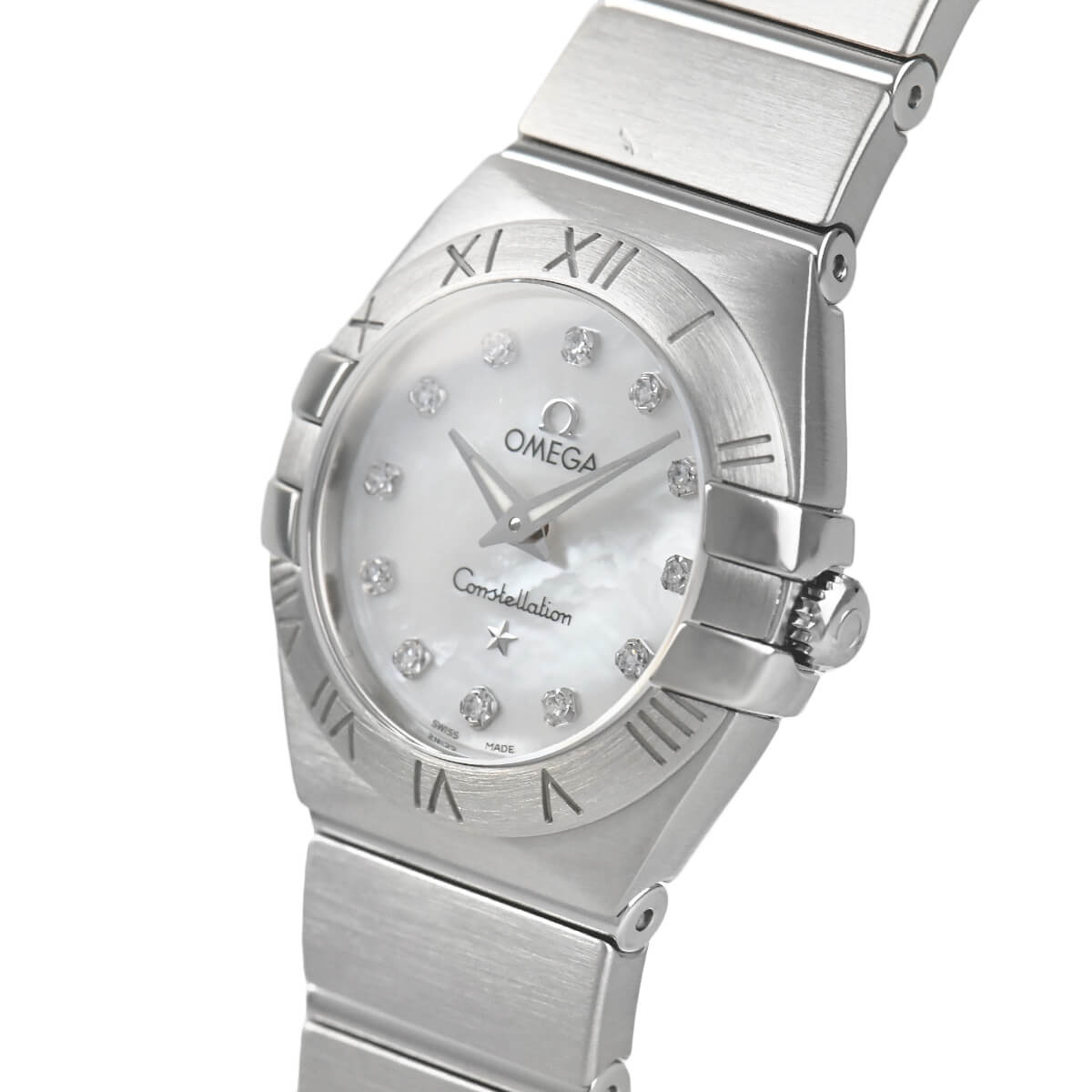 1952年に誕生した「コンステレーション」は、今ではオメガを代表するシリーズに成長しています。こちらはホワイト マザー・オブ・パールの文字盤に12ポイントのダイヤモンドをセッティングしたフェミニンで上品なモデルです。