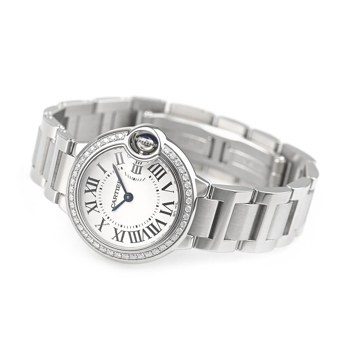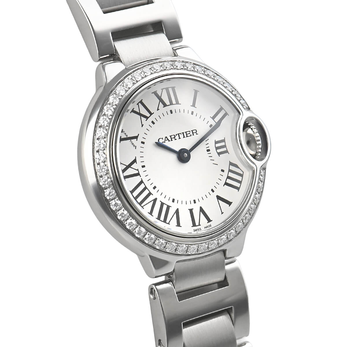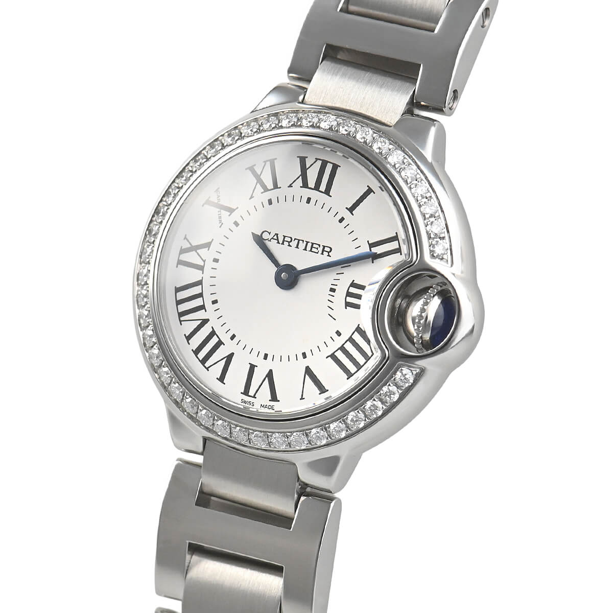 こちらは28mm径のレディースモデルで、ステンレスケースにダイヤモンドをセッティングしたモデル。ジュエラーの時計としての華やかさがご希望の方にオススメです。