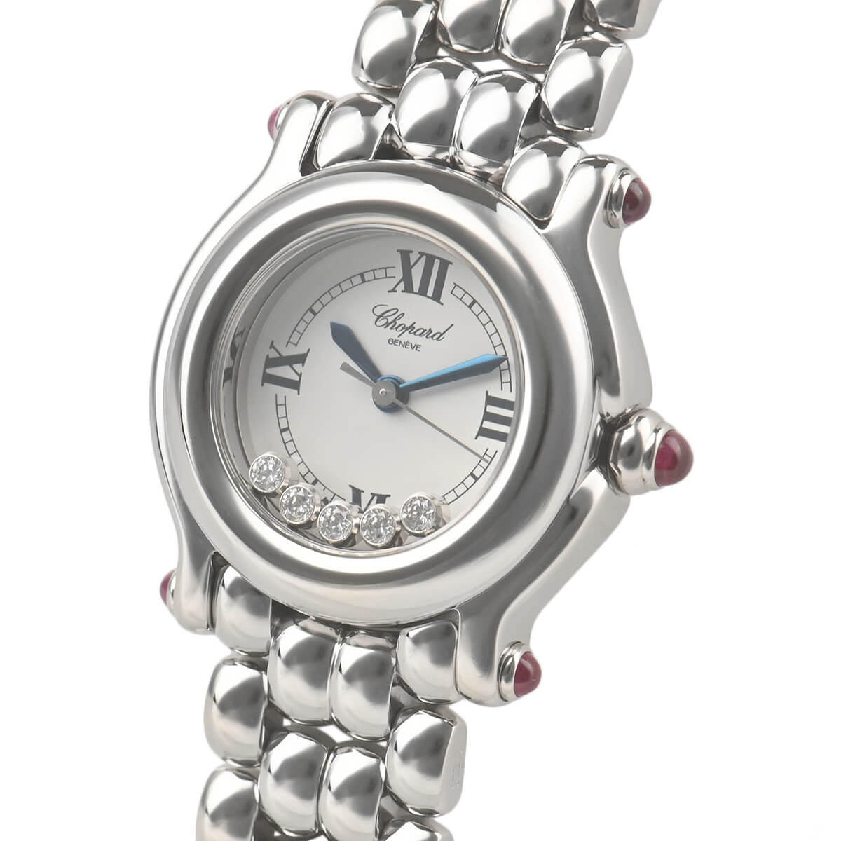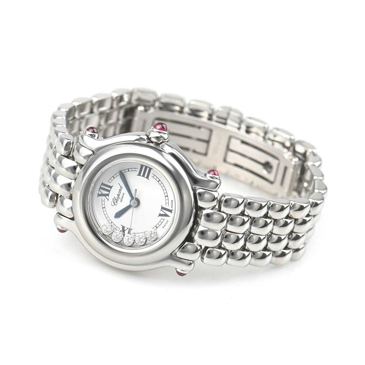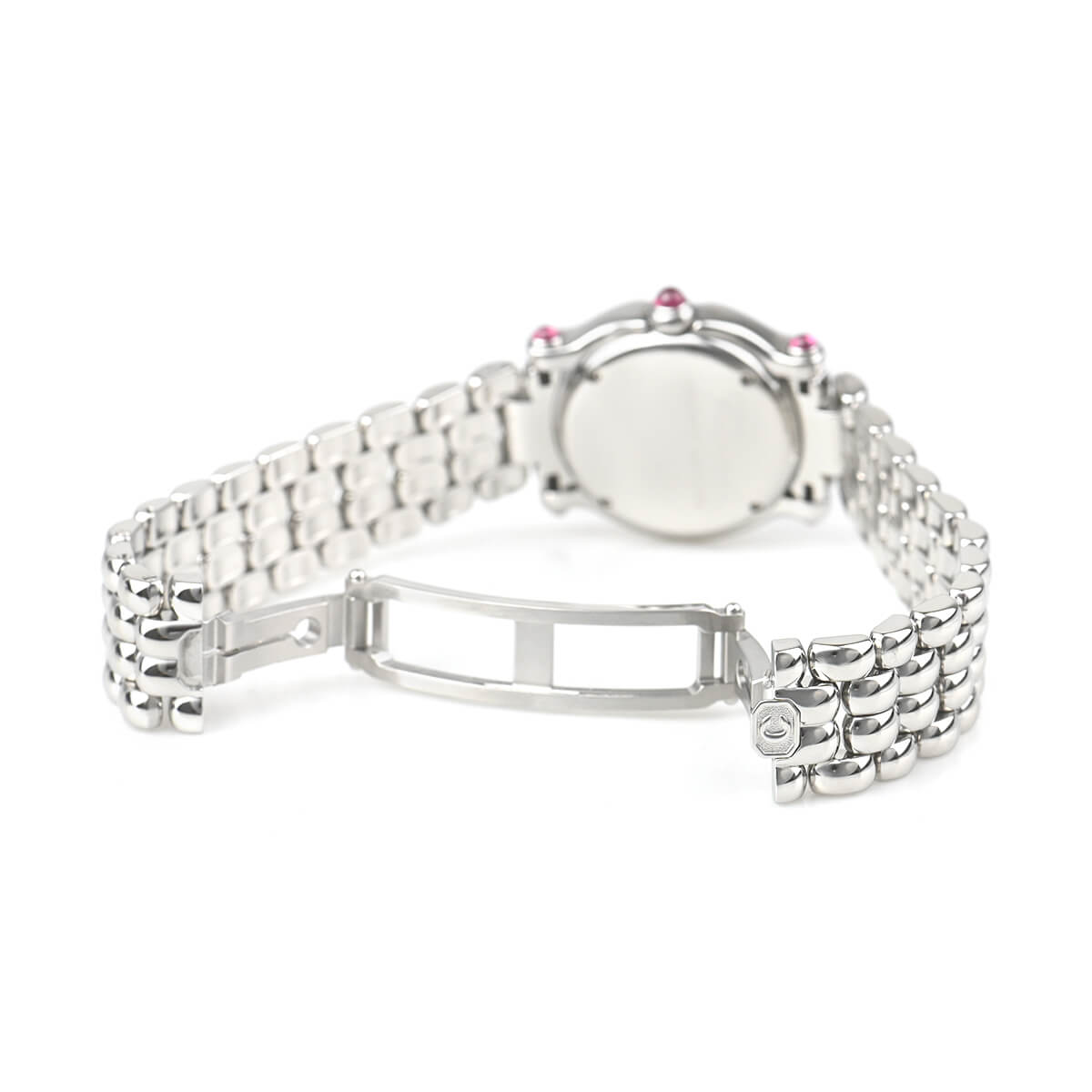 ショパールを代表する個性派ウォッチ「ハッピースポーツ」が入荷しました。ハッピースポーツはカボションの石とダイヤルの組み合わせに様々な種類がありますが、今回入荷したのはピンクサファイヤカボションにホワイトダイヤルのモデル。
