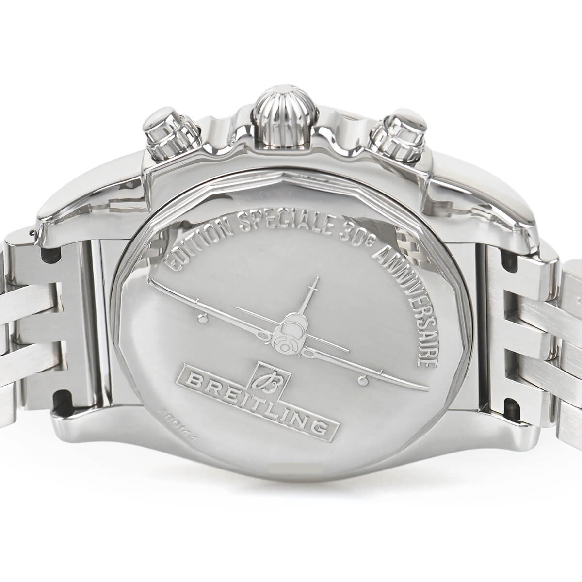 イタリア空軍アクロバット飛行チーム“フレッチェ・トリコローリ”の要請を受け設計された初代「クロノマット」をオマージュして作られた「クロノマット・エアボーン」。こちらはクロノマット誕生の30周年記念モデルで、ケースバックにフレッチェ・トリコローリの愛機が刻まれています。