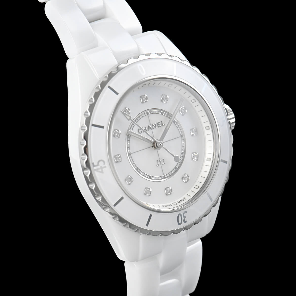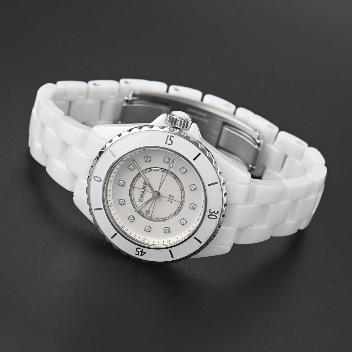 こちらはホワイトセラミックの33mmケースで、ホワイト・マザーオブパールダイアルには12ポイントのダイヤセッティングを施したレディースモデル。