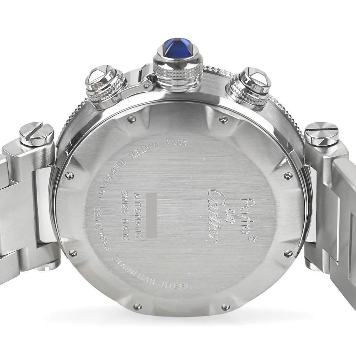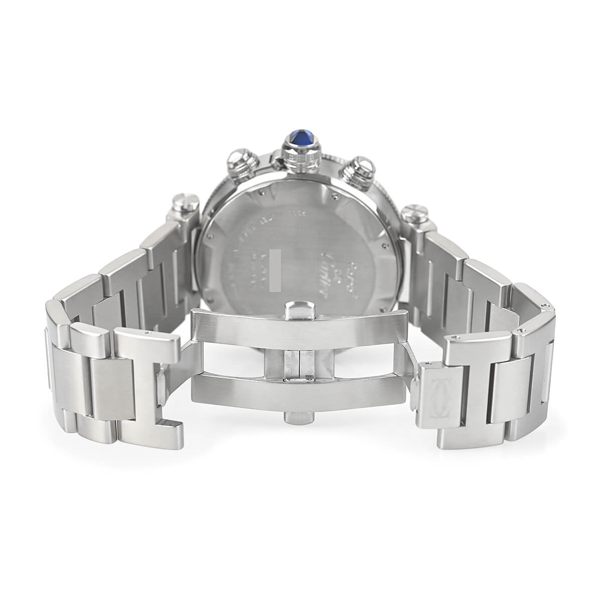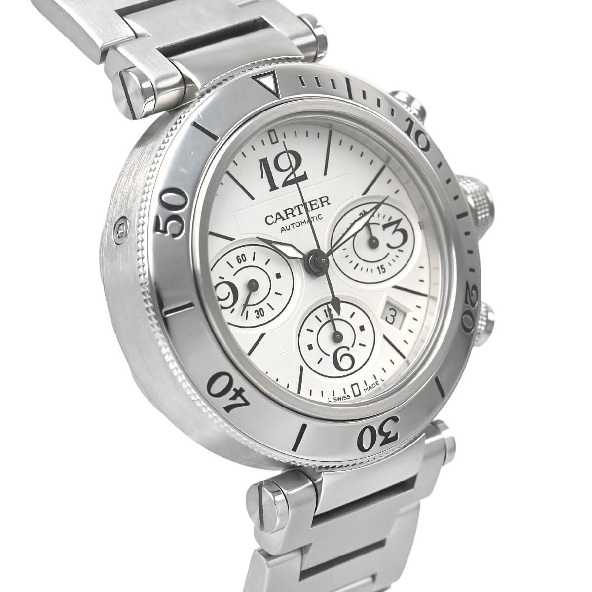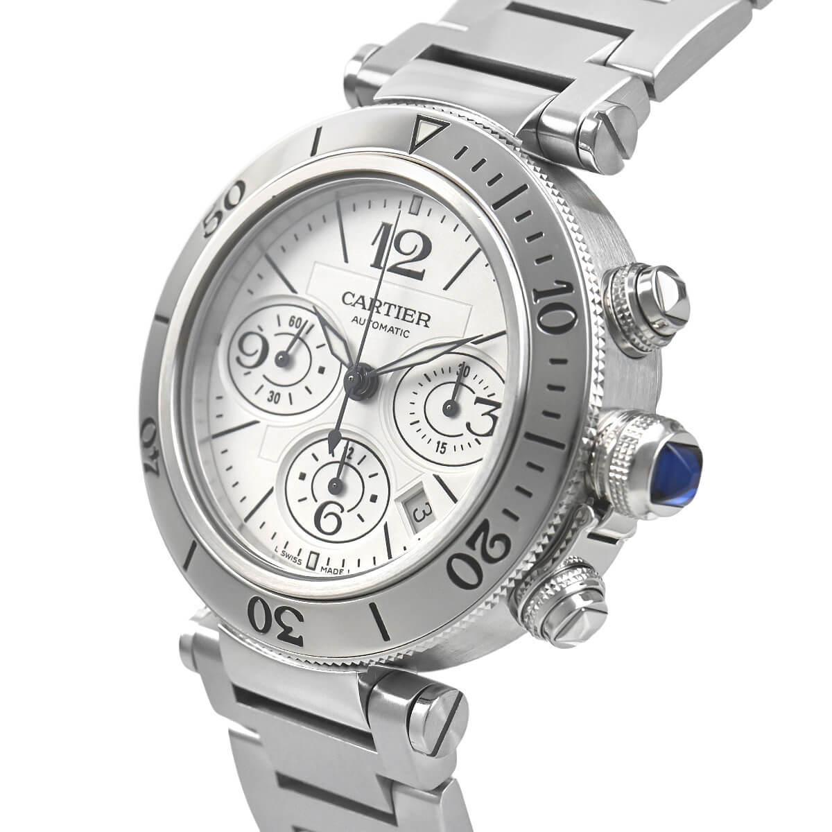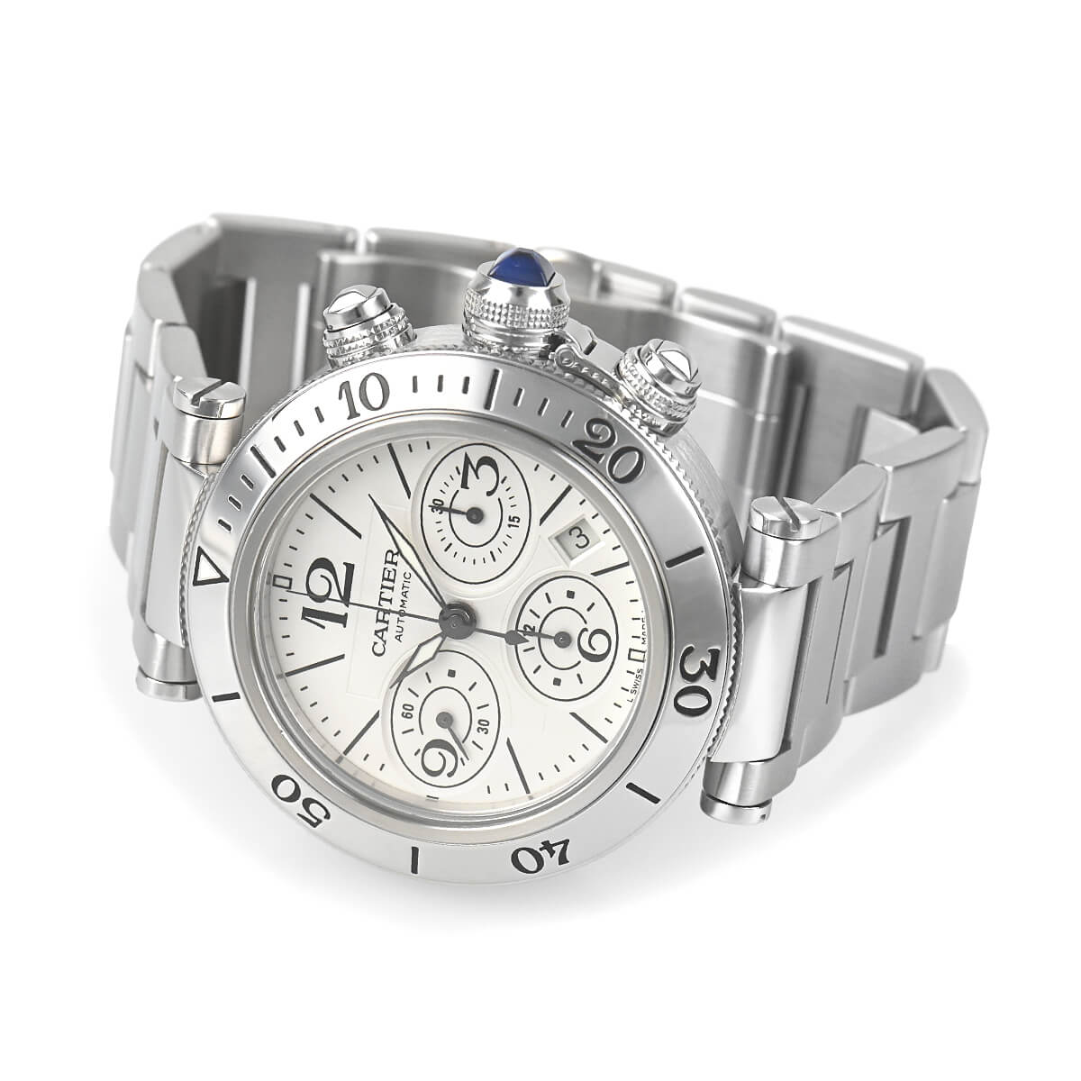 ケース径42.5mmとパシャシリーズの中では大ぶりな「パシャ シータイマー クロノグラフ」。カルティエらしくスポーティかつエレガントな雰囲気を持ち合わせています。