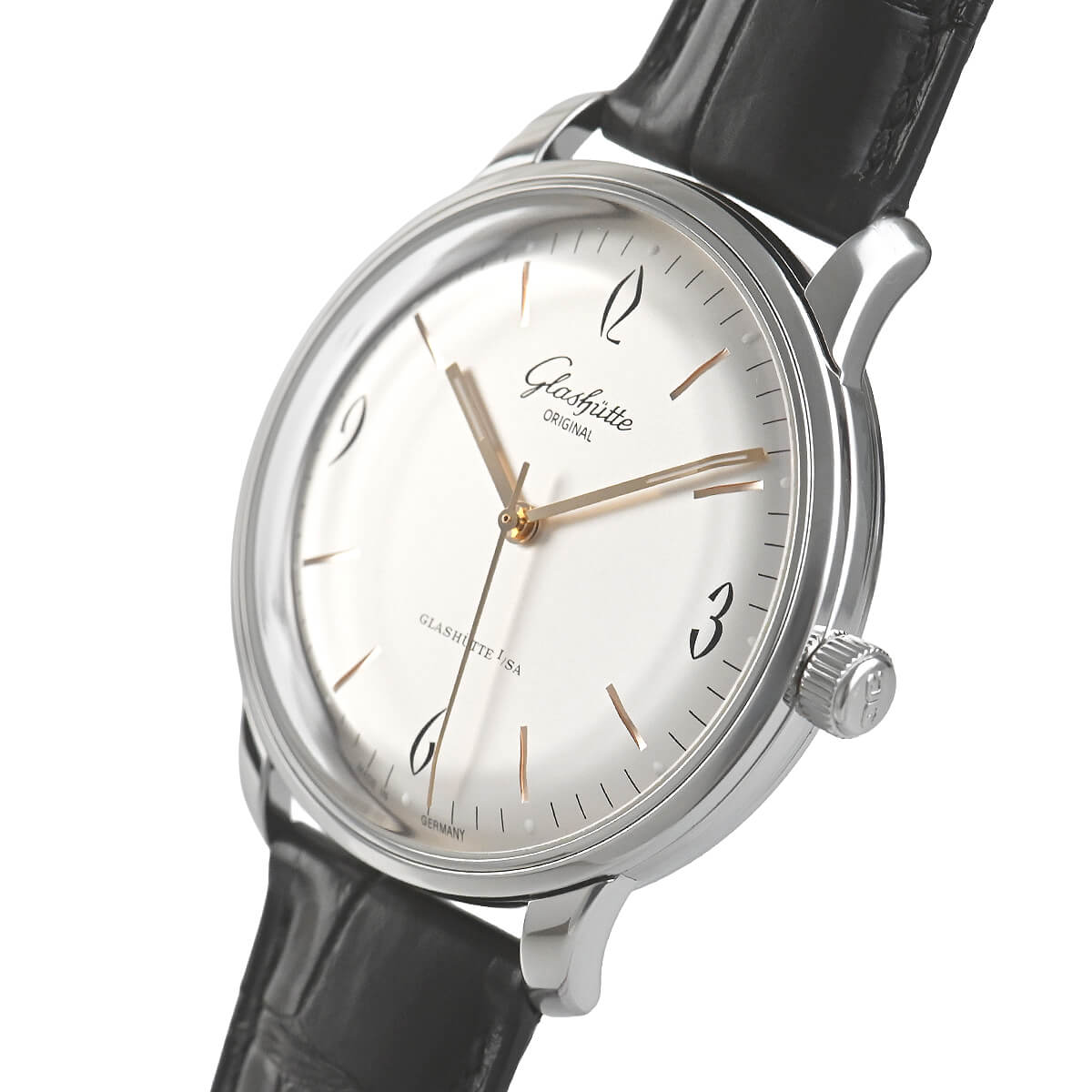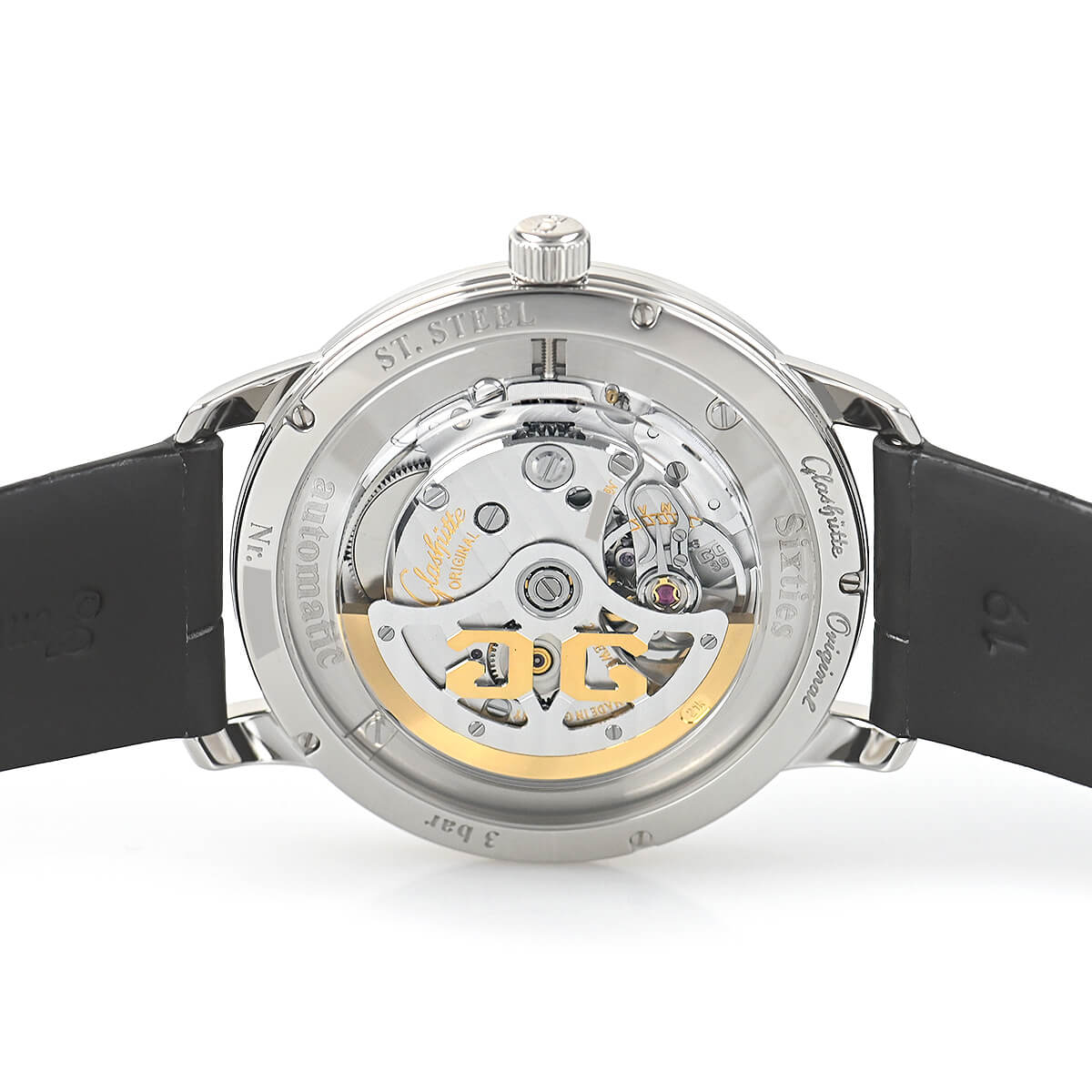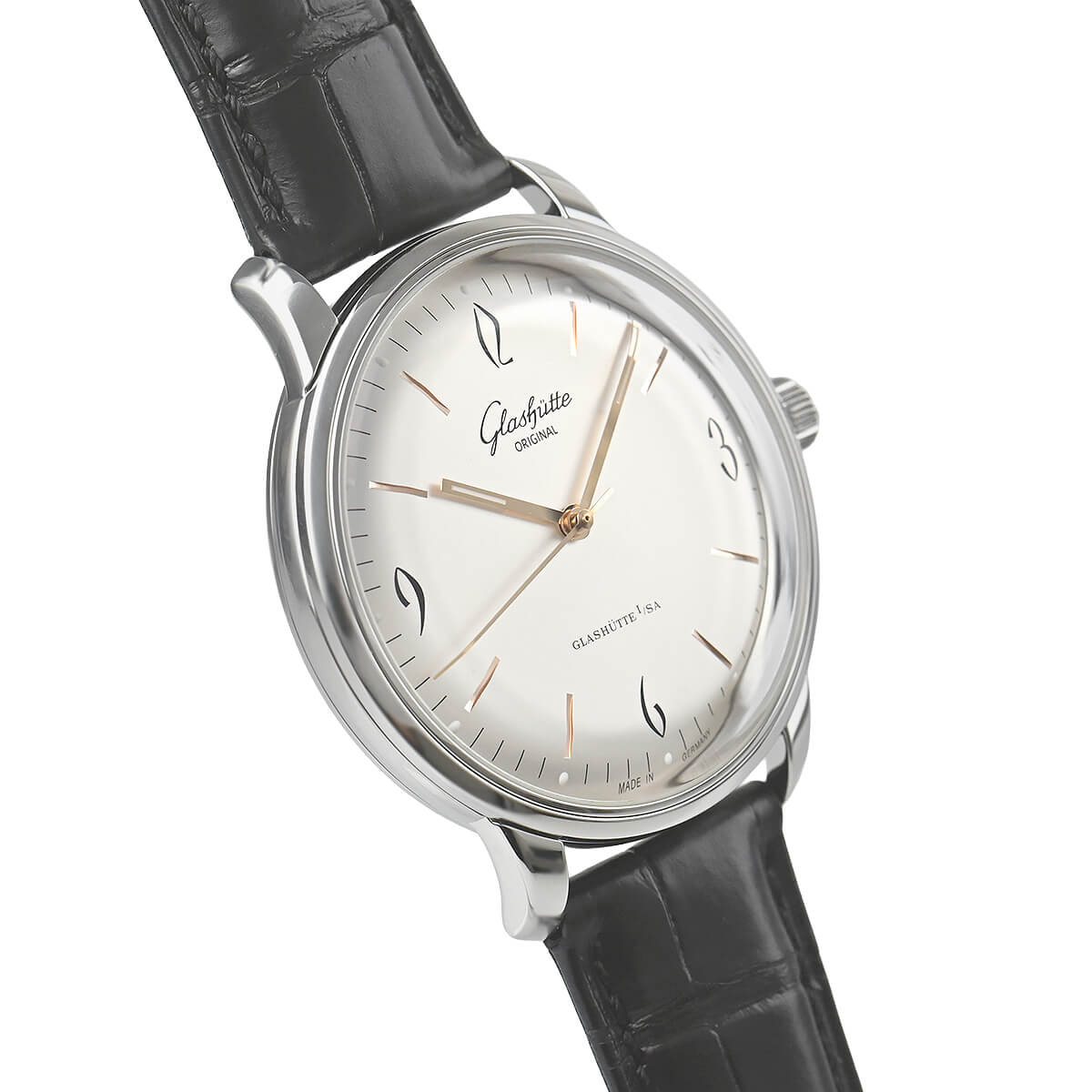 時計の黄金期である1960年代のデザイン様式を用いた「セネタ シックスティーズ」。自社製の自動巻きムーブメントはもちろん、サファイアクリスタルで再現されたカーブしたドーム型の風防や、ダイヤルのバーインデックスを埋め込みにするなどグラスヒュッテ・オリジナルらしいこだわりに満ちた一本です。
