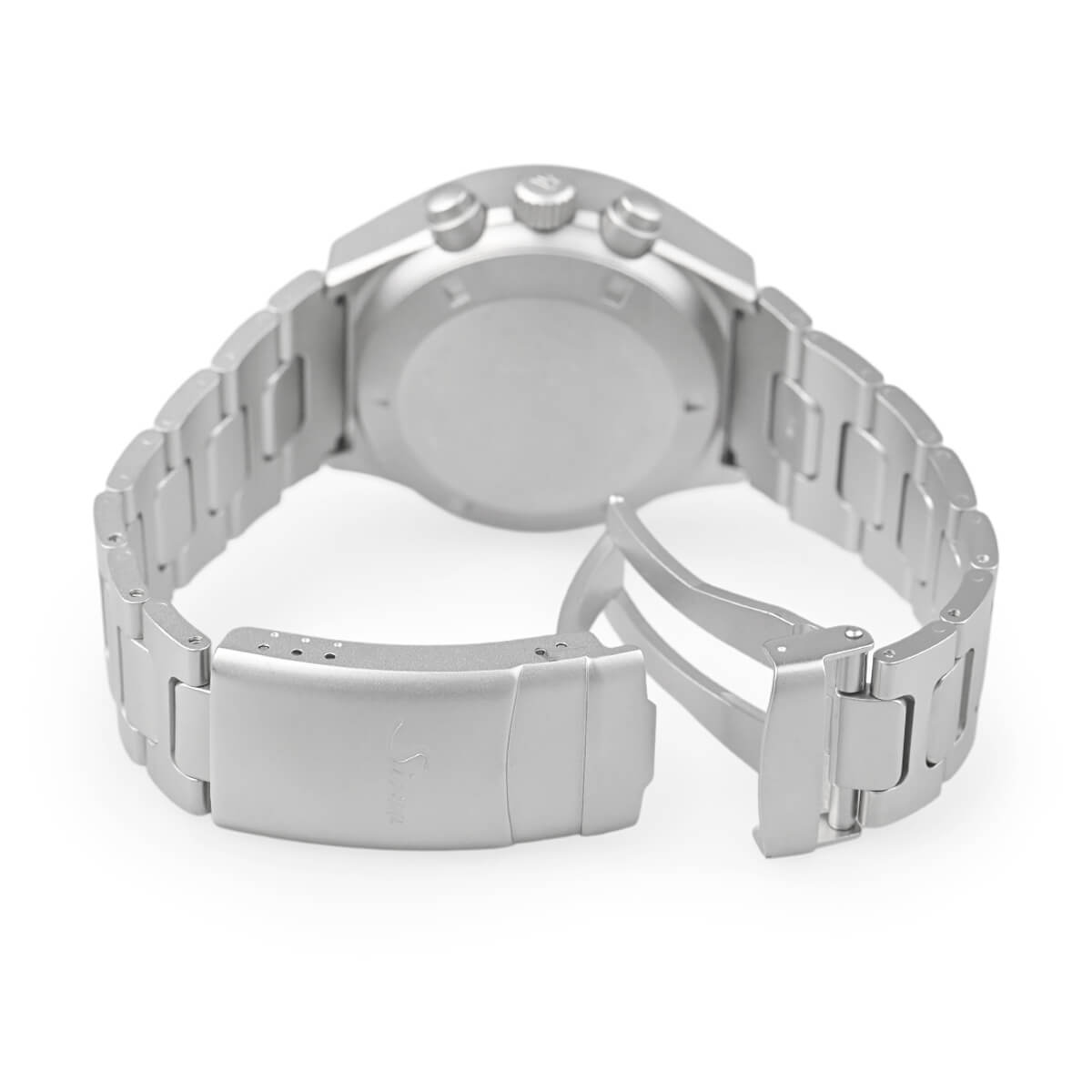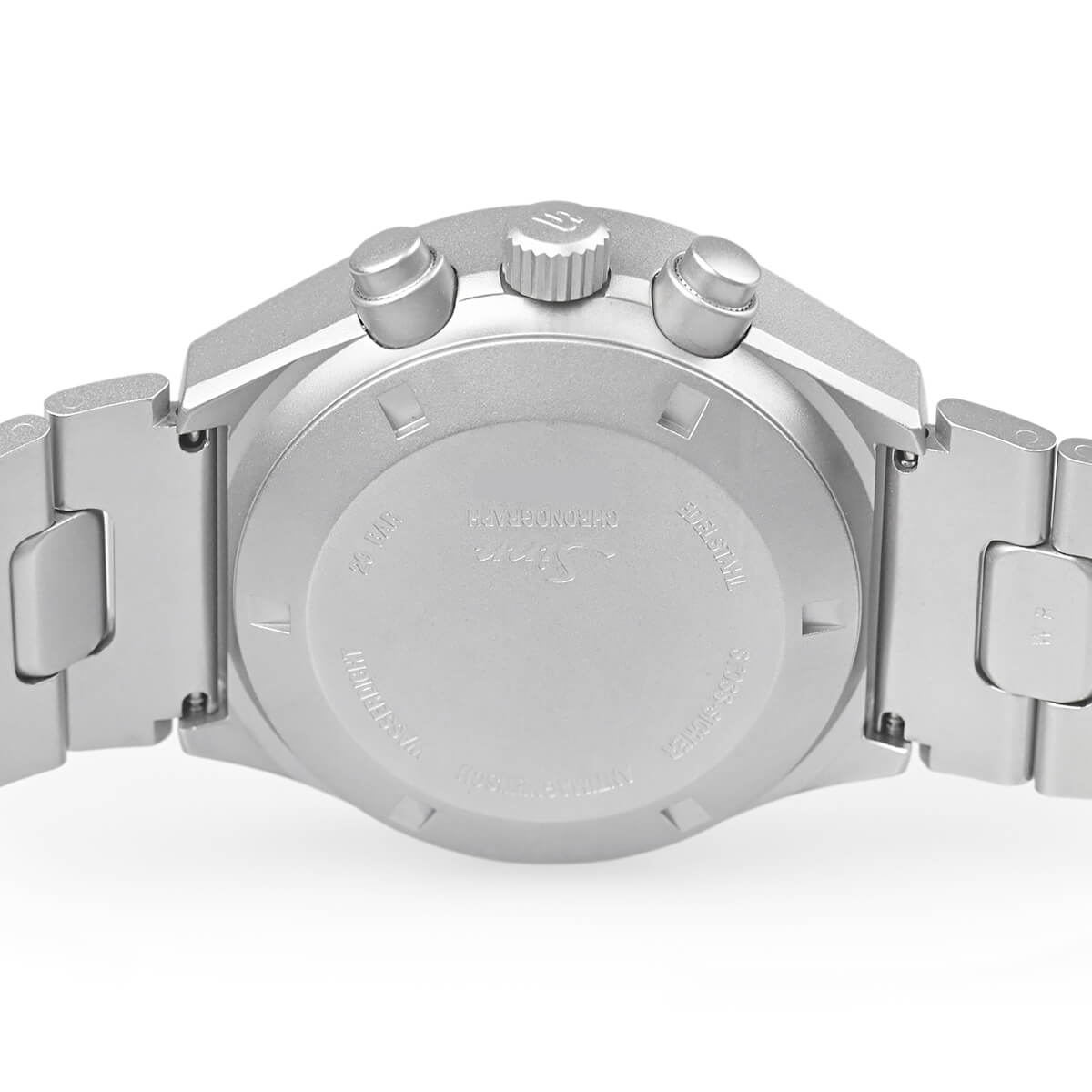 誤動作防止の為、リューズやボタンは9時側に移されており、クロノグラフのスタート・ストップとリセットが上下反対になっています。