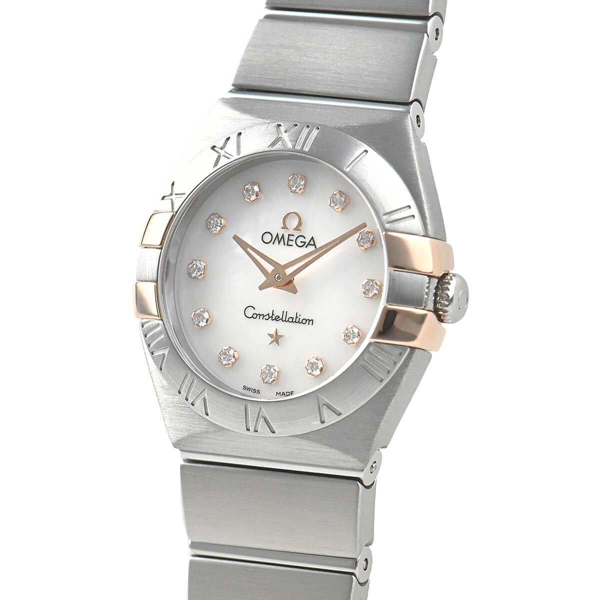 1952年に誕生した「コンステレーション」は、今ではオメガを代表するシリーズに成長しています。こちらはステンレスとレッドゴールドのコンビケースで、ホワイト マザー・オブ・パールの文字盤に12ポイントのダイヤモンドをセッティングしたフェミニンで上品なモデルです。