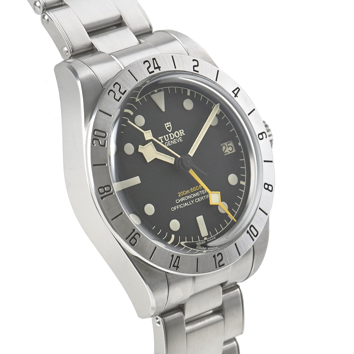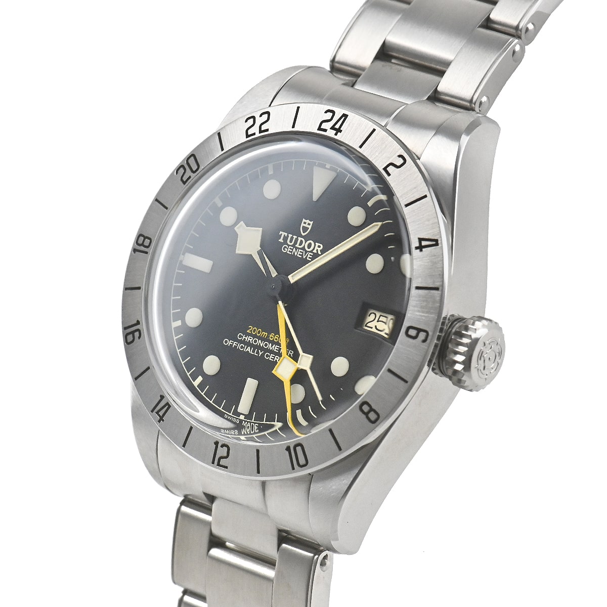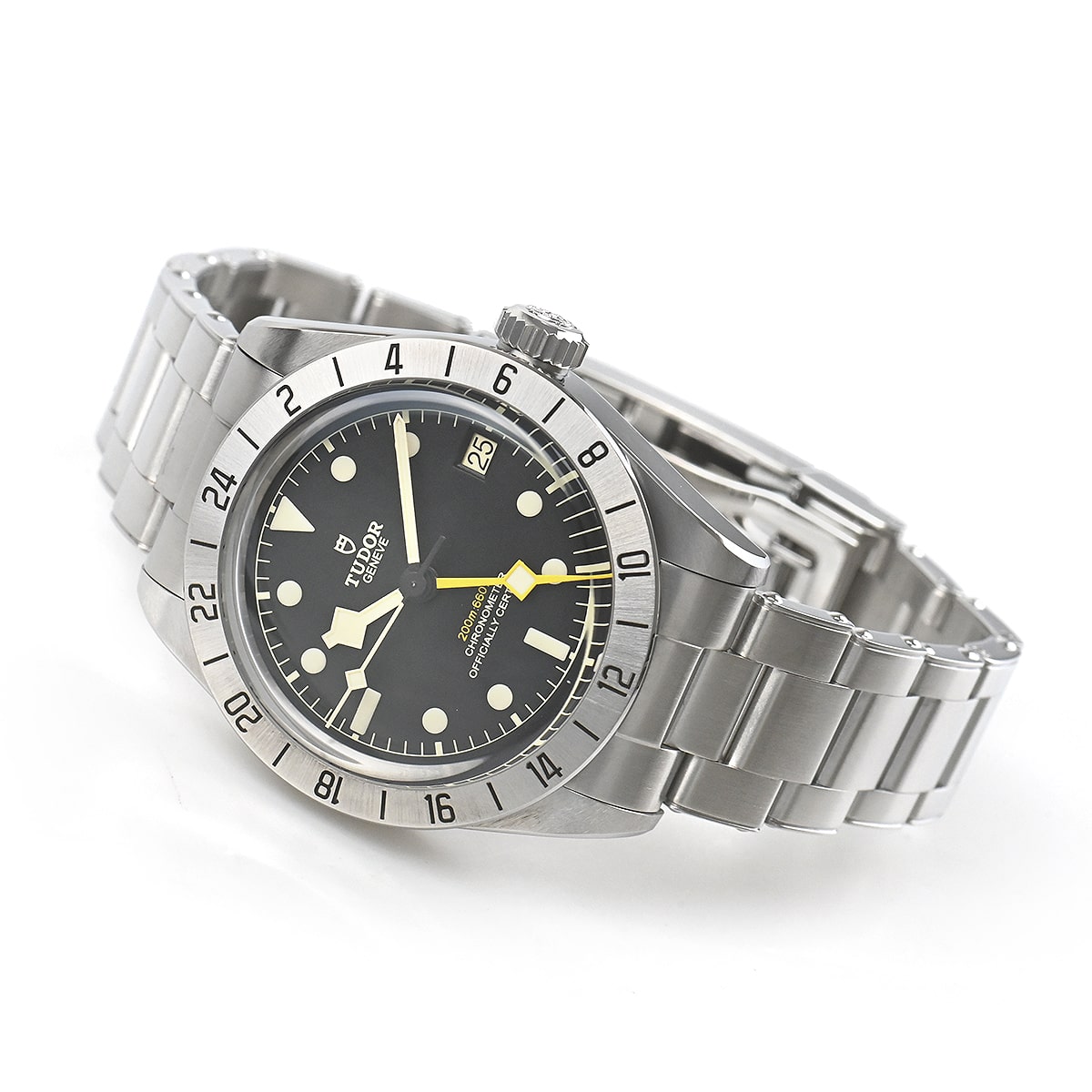 【M79470-0001】ブラックベイ プロが入荷しました。黄色いGMT針とステンレスベゼルに記載された24時間表記を用いたことでロレックスのヴィンテージ「エクスプローラーII」を彷彿させます。