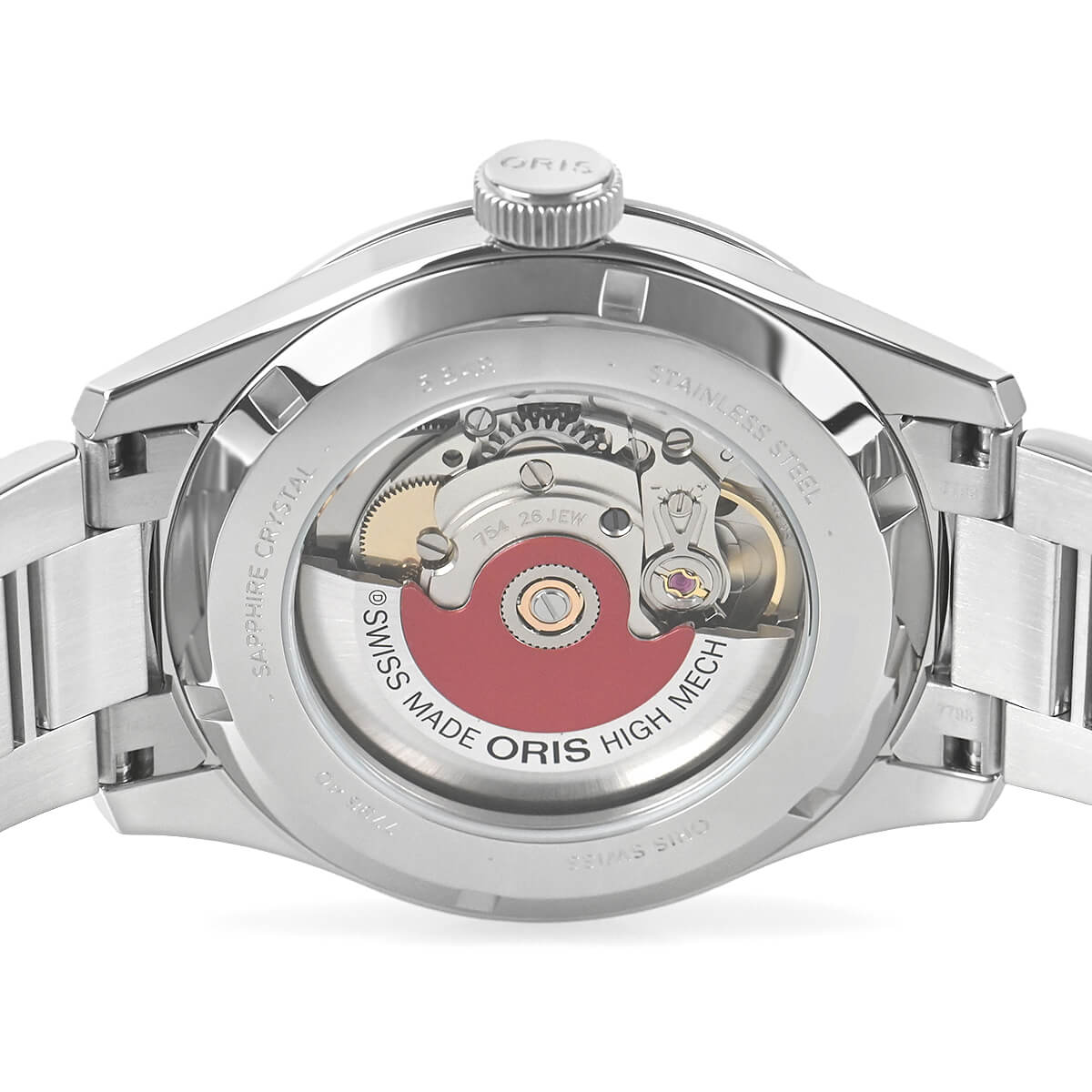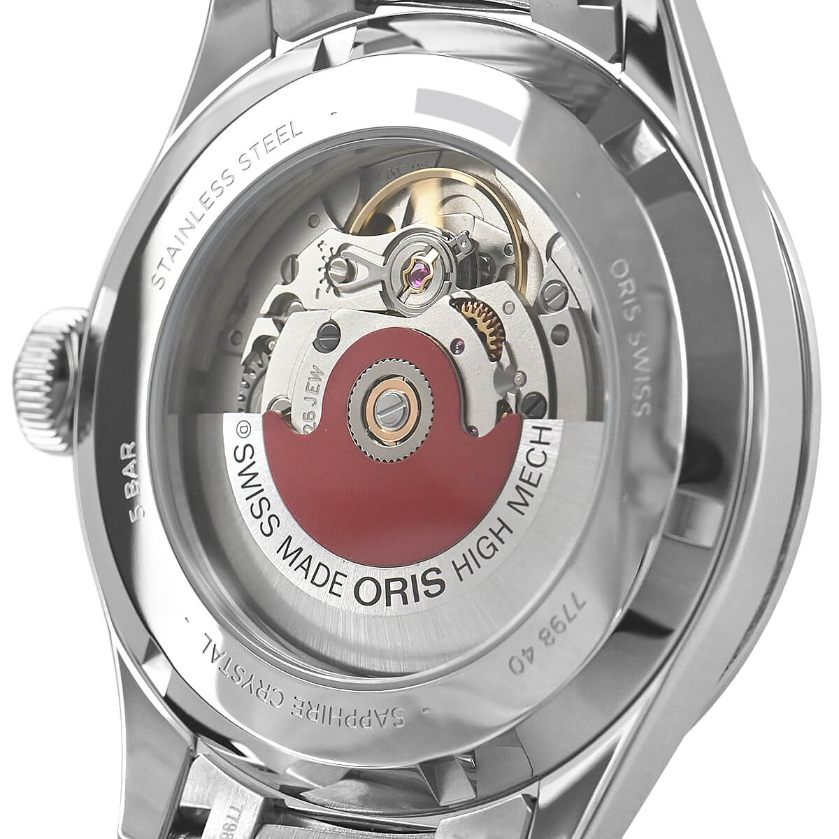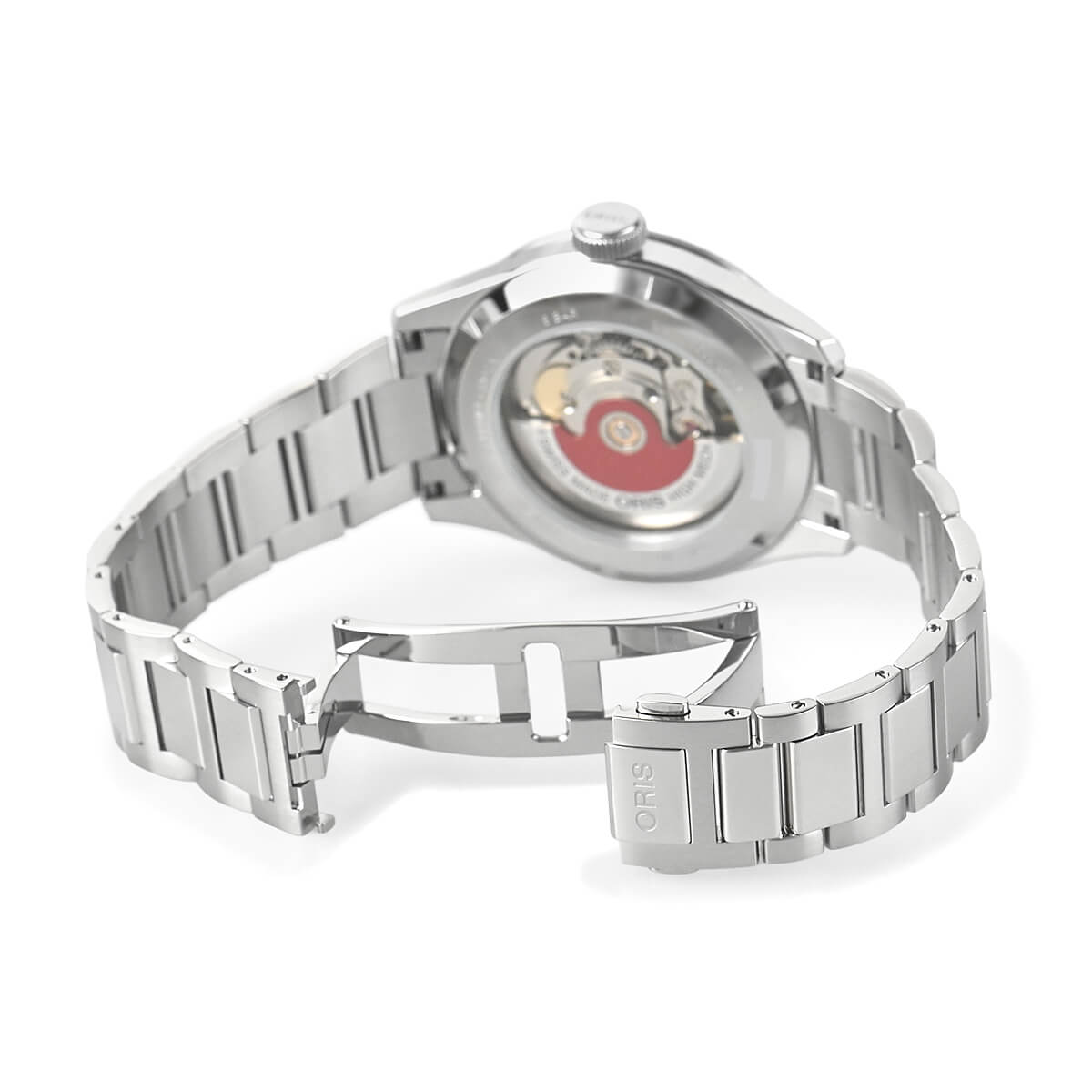 オリスの定番モデル「ビッグクラウン ポインターデイト」。シンプルなデザインで視認性に優れ、シースルバックからはムーブメントを眺める事が出来ます。
